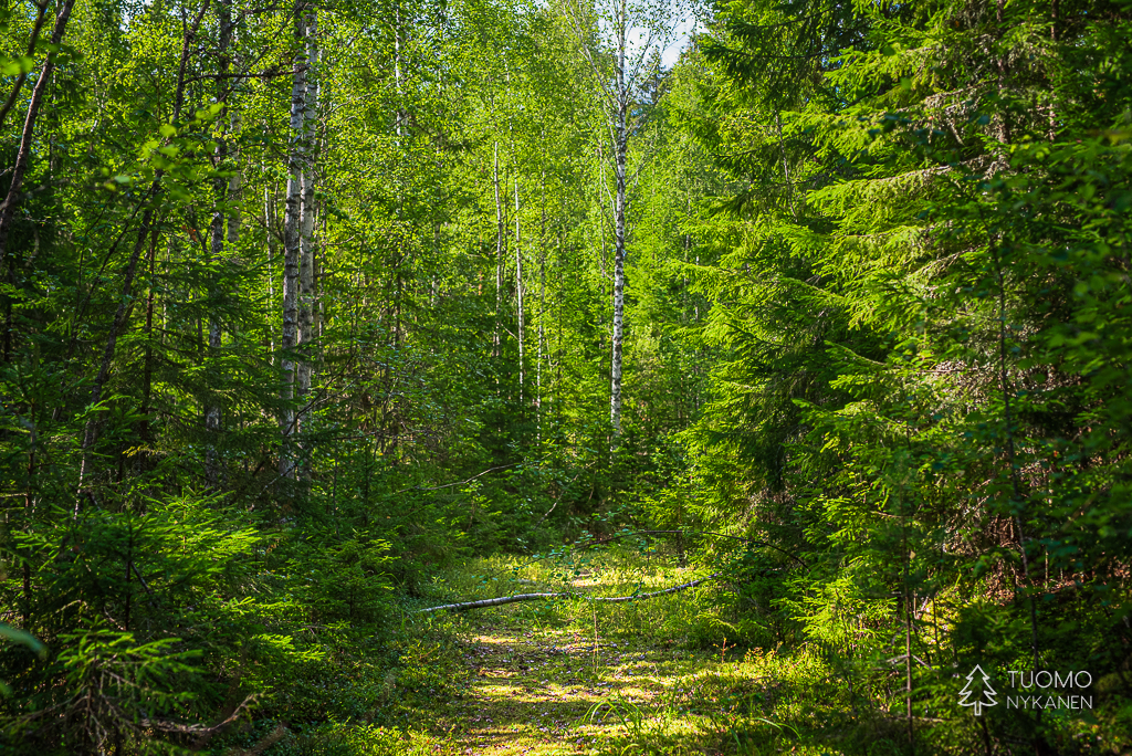 Potaskanmäellä Yoshi (koiramme) aloittikin reissun kirmaamalla uudelle syrjäisen polun alulle sellaisella innolla, että pelkäsin jo pojun leuan putoavan ja hännän irtoavan. Niin innolla se itseään vauhditti häntäpropellillaan menemään. Näin yleensä käy kun ihmisarka koira pääsee poikkeavan hiljaiseen paikkaan ja sitä Evo onkin – aina. Onneksi päivä ei ollut kesän kuumimpien viikkojen veroinen, helteen alle sentään jäätiin, vaikkakin niukasti. Suurten kuusien varjot suojelivat ettei koiran into lämmittänyt sitä liikaa.