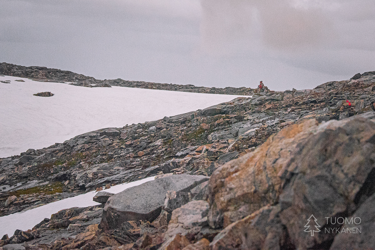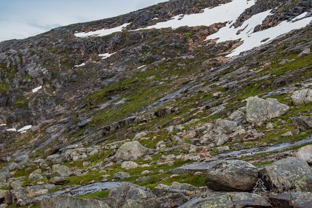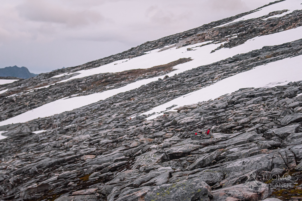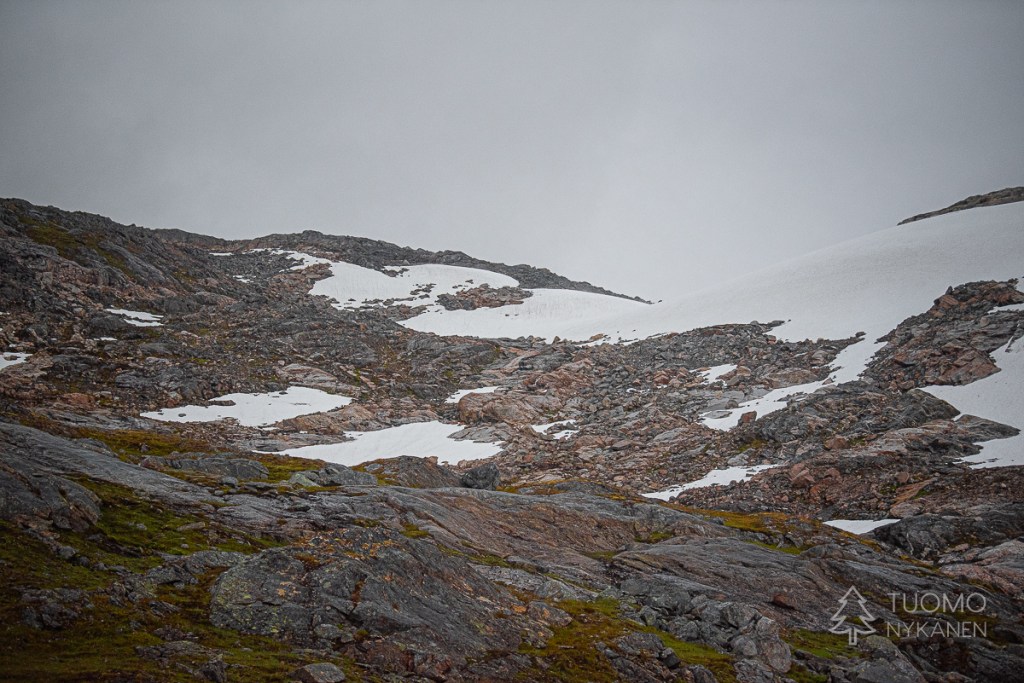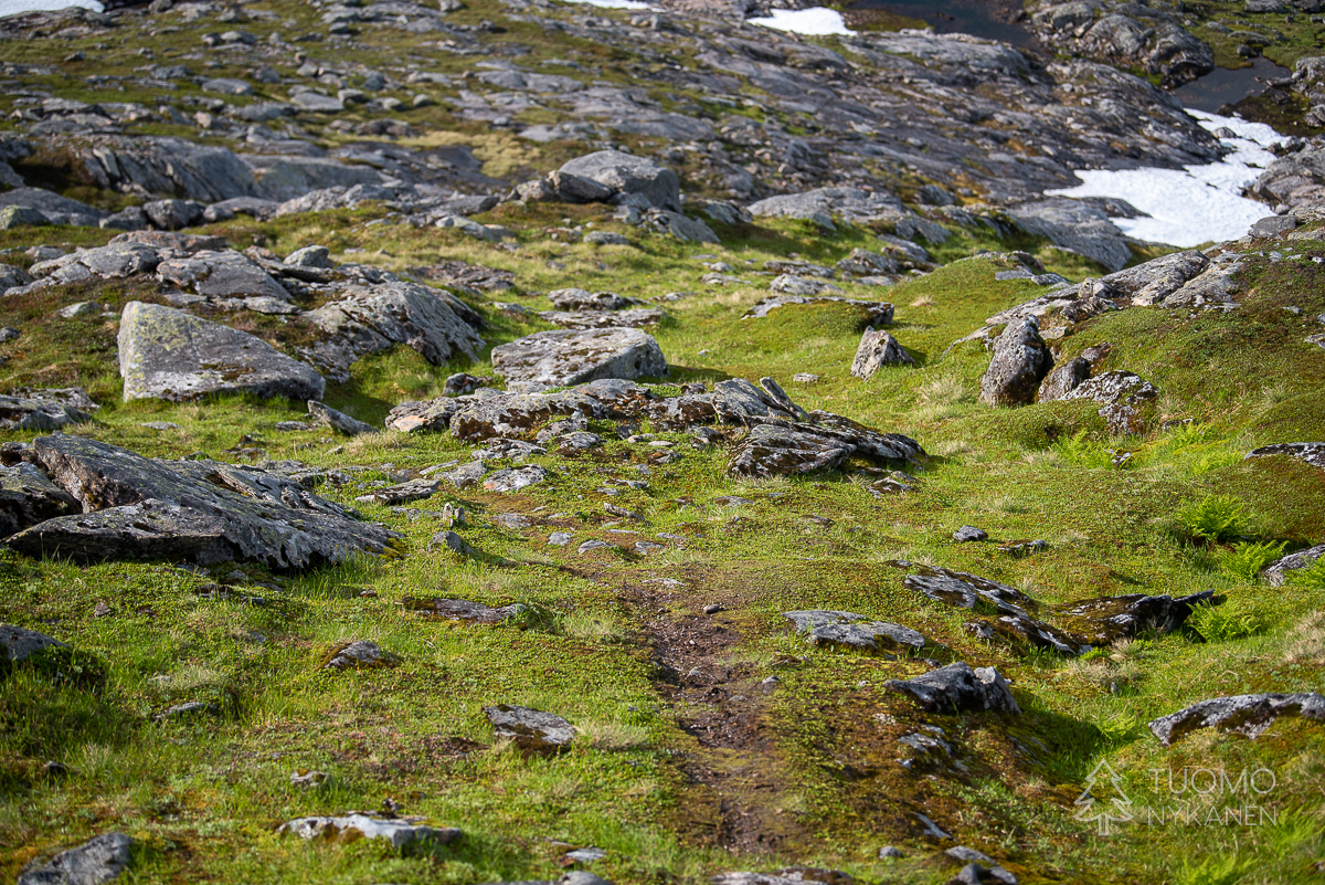 Ylemmäs noustaessa lunta alkaa näkymään yhä enemmän ja ikävä kyllä korkeuksissa siintävä lumisin kohta näyttää olevan juuri se mihin reitti on suuntaamassa. Katsellessani lumen yllä leijuvaa usvaa voin vain kuvitella kuinka kylmää siellä on ja jo nyt kivien alla virtaava vesi kertoo, että lumen alla märkyyttä on varmasti vielä runsaammin. Joudun pysähtymään useampaan otteeseen noustessa ja katsellessani tulosuuntaan näen kaksi miestä aloittamassa nousun, seuraavan kerran katsoessani he ovatkin jo aivan kantapäillä, sitten ohi ja lopuksi katoamassa jonnekin kaukaisuuteen. Pieni huiputus iltalenkiksi kahdelle norjalaiselle vuorikauriille. Itse joudun ottamaan tavoitteita spurteille, joilla nousen sopivan pisteen luokse ja sitten aina pieni lepo. Rinkka tuntuu hyvältä, mutta aamuisen patikan muistot Vannan saaren tuntureilla tuntuvat vielä jaloissa, ainakin siihen asti, että ne lämpenevät taas urakkaansa. Tunturien nousujen kanssa menee taas hieman aikaa, että metsissä aikaansa viettävä samoaja sopeutuu muutokseen.