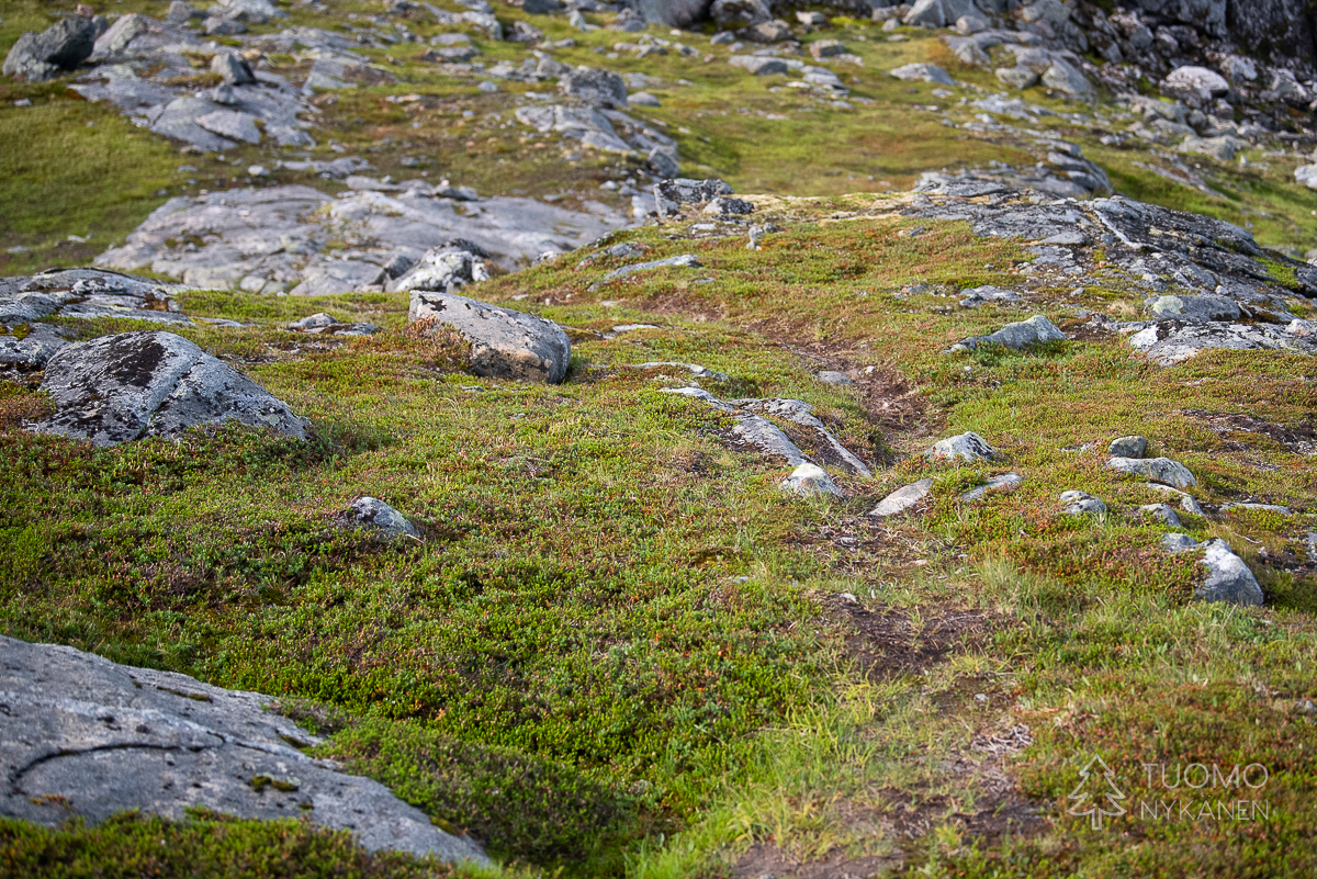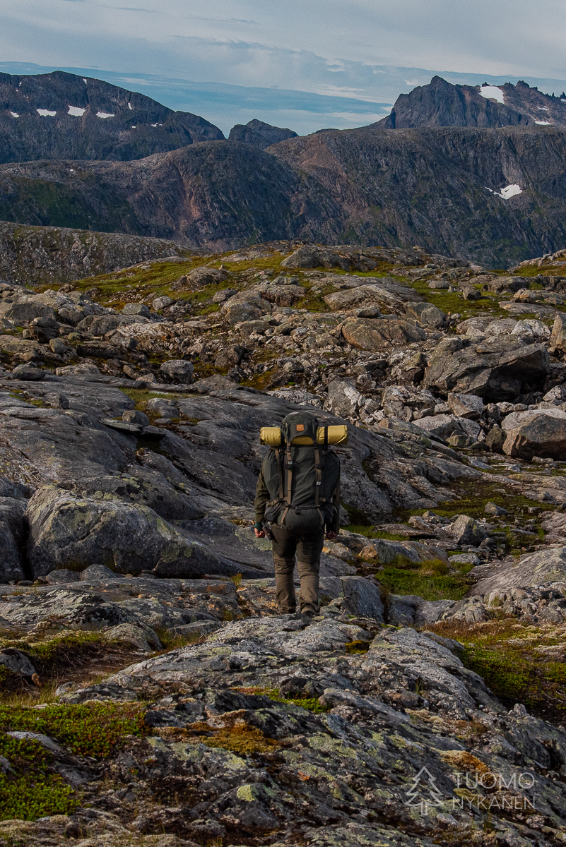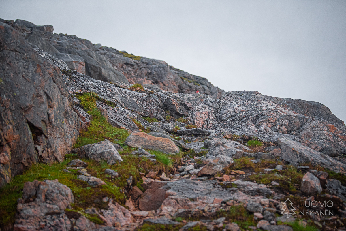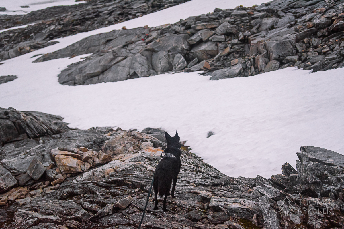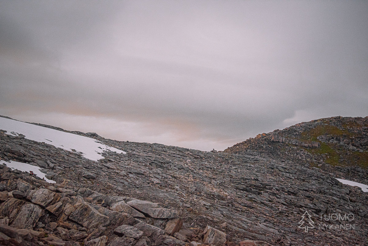 Ylemmäs noustaessa lunta alkaa näkymään yhä enemmän ja ikävä kyllä korkeuksissa siintävä lumisin kohta näyttää olevan juuri se mihin reitti on suuntaamassa. Katsellessani lumen yllä leijuvaa usvaa voin vain kuvitella kuinka kylmää siellä on ja jo nyt kivien alla virtaava vesi kertoo, että lumen alla märkyyttä on varmasti vielä runsaammin. Joudun pysähtymään useampaan otteeseen noustessa ja katsellessani tulosuuntaan näen kaksi miestä aloittamassa nousun, seuraavan kerran katsoessani he ovatkin jo aivan kantapäillä, sitten ohi ja lopuksi katoamassa jonnekin kaukaisuuteen. Pieni huiputus iltalenkiksi kahdelle norjalaiselle vuorikauriille. Itse joudun ottamaan tavoitteita spurteille, joilla nousen sopivan pisteen luokse ja sitten aina pieni lepo. Rinkka tuntuu hyvältä, mutta aamuisen patikan muistot Vannan saaren tuntureilla tuntuvat vielä jaloissa, ainakin siihen asti, että ne lämpenevät taas urakkaansa. Tunturien nousujen kanssa menee taas hieman aikaa, että metsissä aikaansa viettävä samoaja sopeutuu muutokseen.