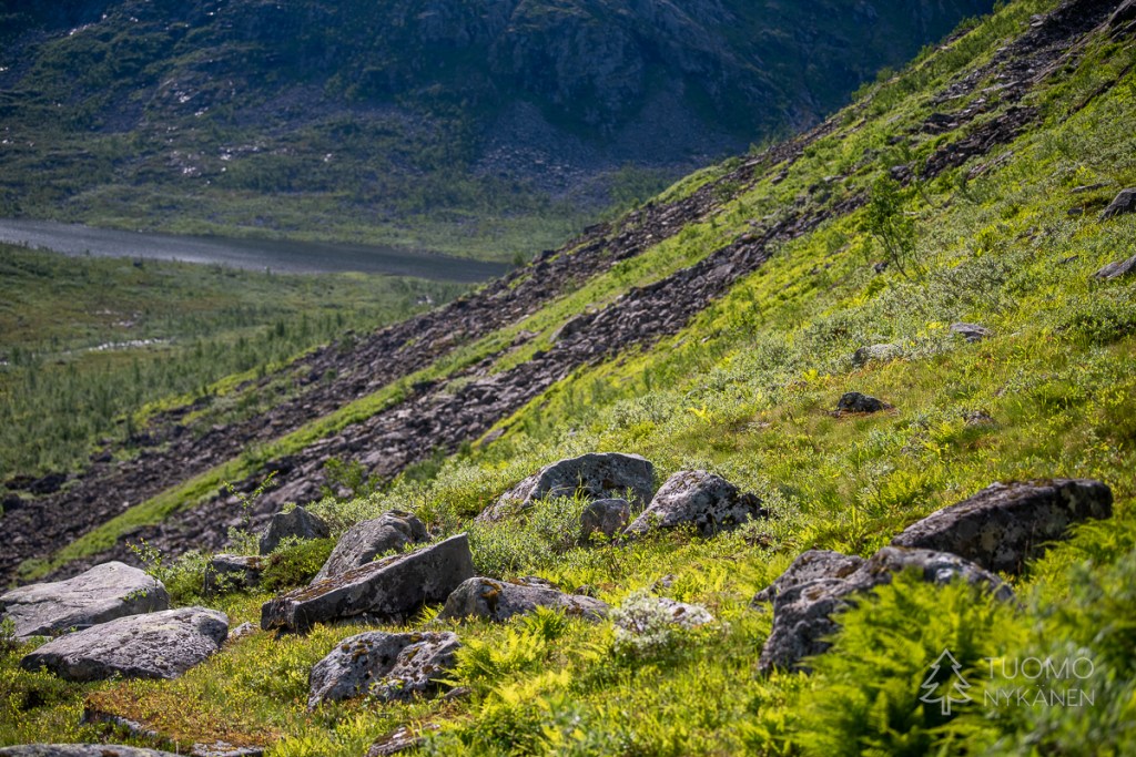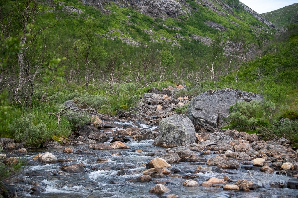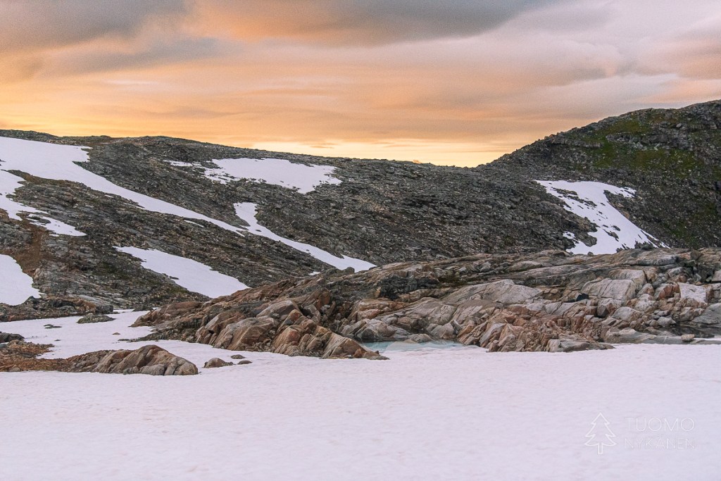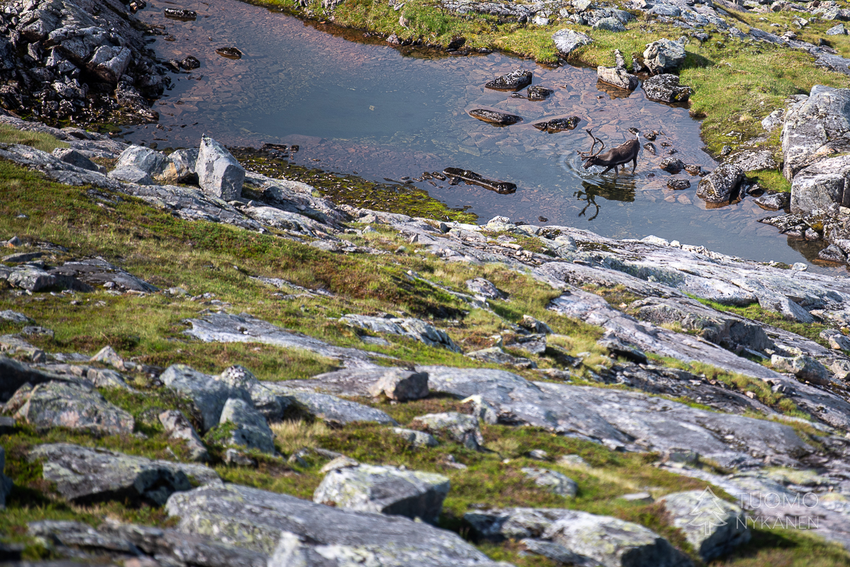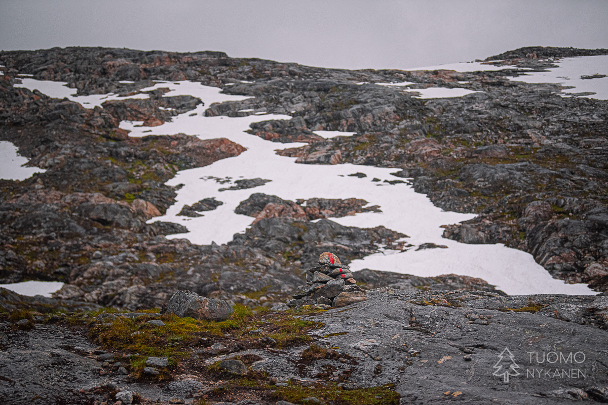 Ylemmäs noustaessa lunta alkaa näkymään yhä enemmän ja ikävä kyllä korkeuksissa siintävä lumisin kohta näyttää olevan juuri se mihin reitti on suuntaamassa. Katsellessani lumen yllä leijuvaa usvaa voin vain kuvitella kuinka kylmää siellä on ja jo nyt kivien alla virtaava vesi kertoo, että lumen alla märkyyttä on varmasti vielä runsaammin. Joudun pysähtymään useampaan otteeseen noustessa ja katsellessani tulosuuntaan näen kaksi miestä aloittamassa nousun, seuraavan kerran katsoessani he ovatkin jo aivan kantapäillä, sitten ohi ja lopuksi katoamassa jonnekin kaukaisuuteen. Pieni huiputus iltalenkiksi kahdelle norjalaiselle vuorikauriille. Itse joudun ottamaan tavoitteita spurteille, joilla nousen sopivan pisteen luokse ja sitten aina pieni lepo. Rinkka tuntuu hyvältä, mutta aamuisen patikan muistot Vannan saaren tuntureilla tuntuvat vielä jaloissa, ainakin siihen asti, että ne lämpenevät taas urakkaansa. Tunturien nousujen kanssa menee taas hieman aikaa, että metsissä aikaansa viettävä samoaja sopeutuu muutokseen.
