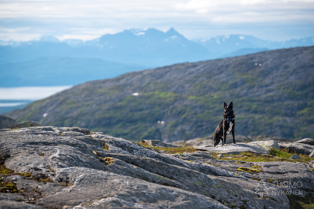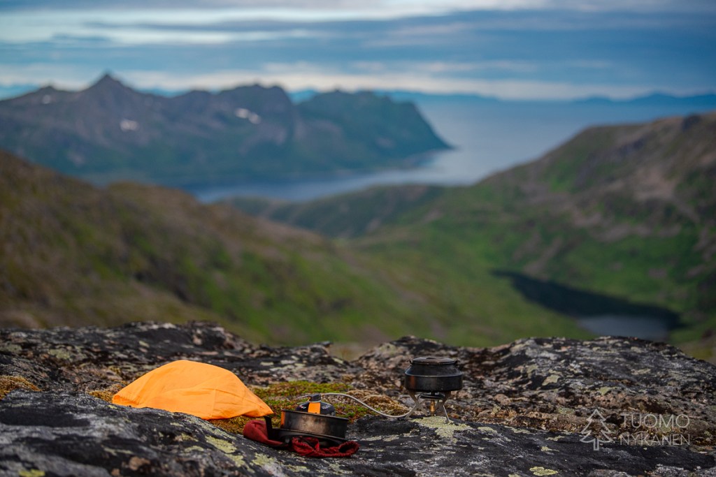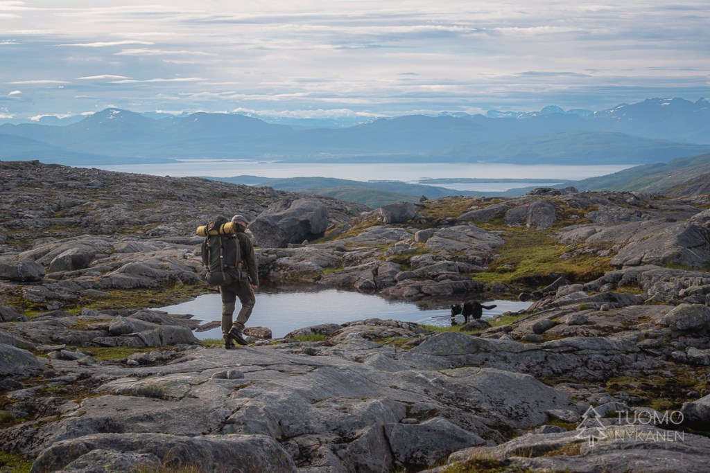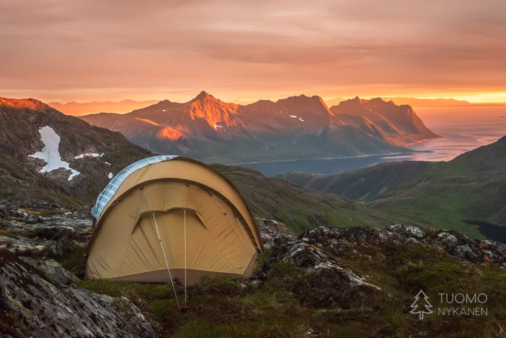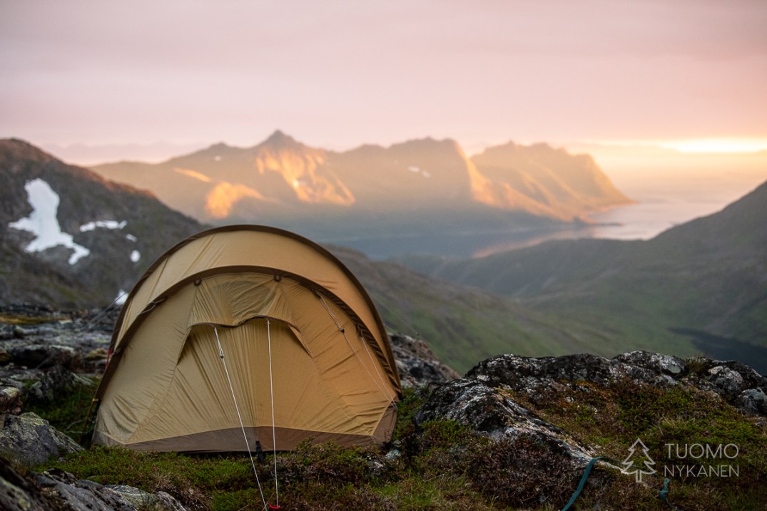 Ja kun sopivan paikan löytää niin sen vain tuntee ja näkee. Korkealla tunturin päällä näkyy tasanne, josta aukeaa näkymä suoraan kohti purppuraista taivasta ja lämpimää valoa, joka hyväilee kauempana siintävää Flestindania ja Lendepolltindania. Tasanne on kivikkoinen ja paikoin epätasainen mutta juuri ja juuri sopiva teltalle, jotta itselleni ja koiralle löytyy sopiva paikka nukkua.