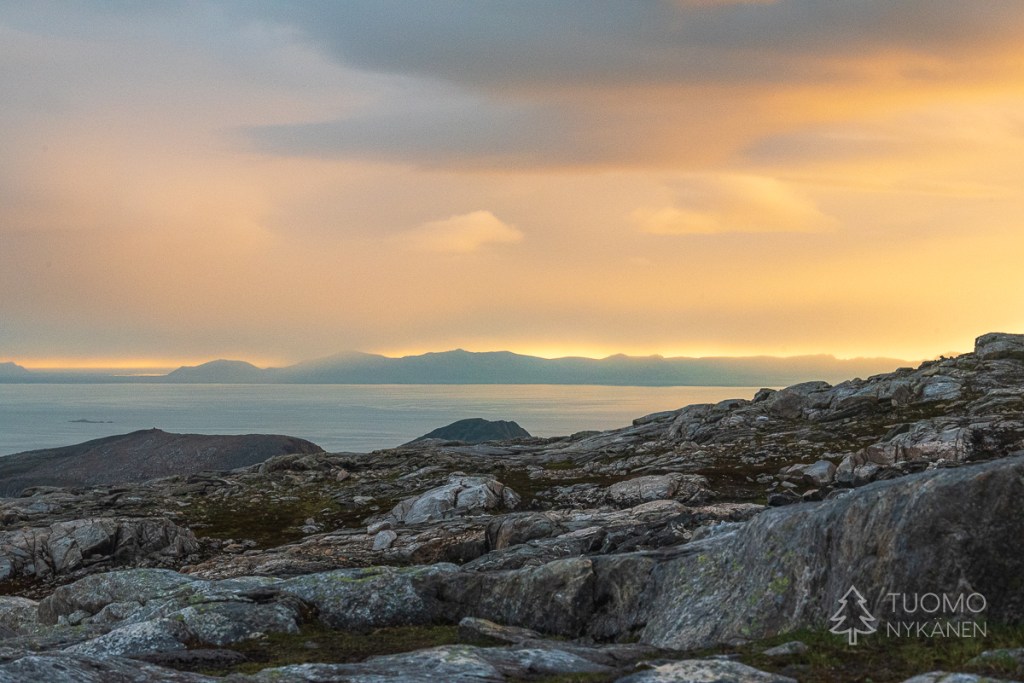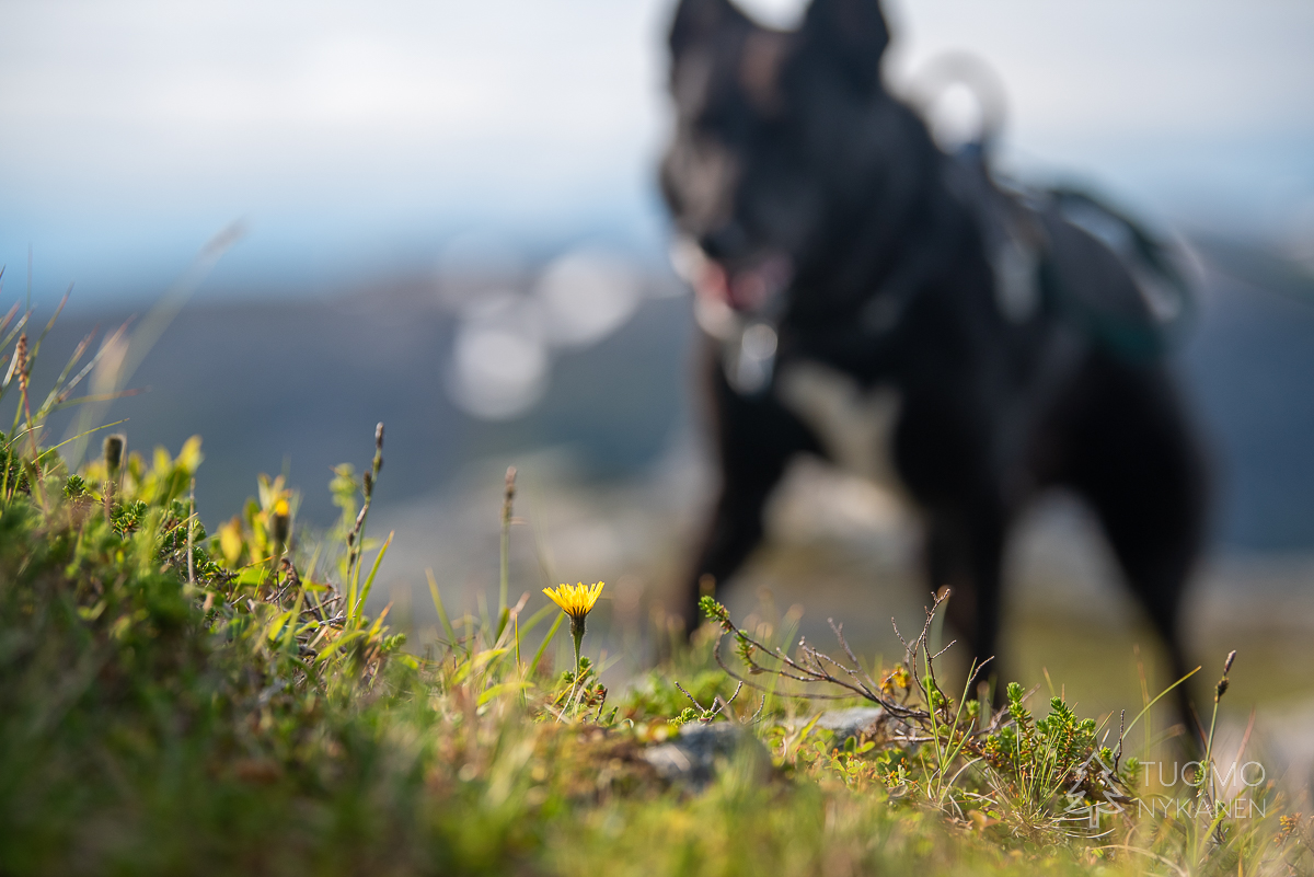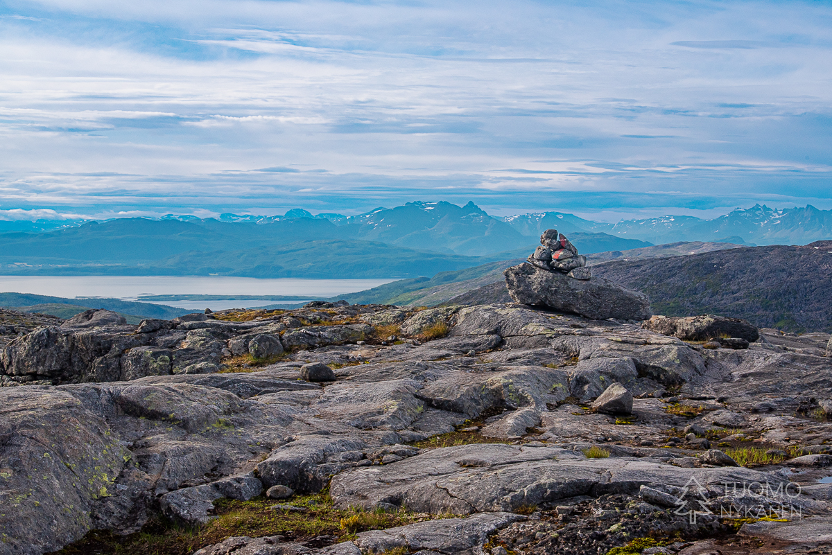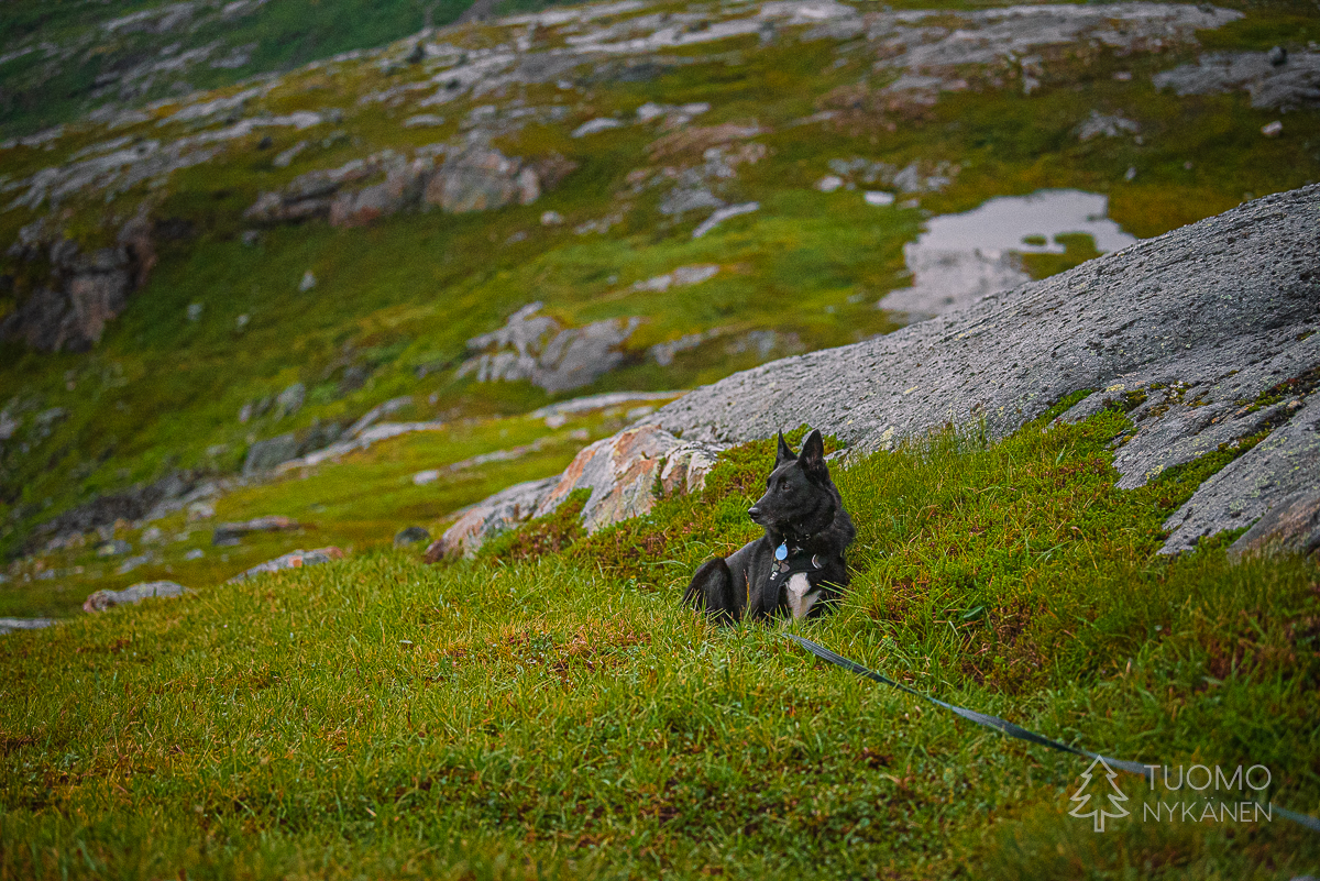 Ja kun sopivan paikan löytää niin sen vain tuntee ja näkee. Korkealla tunturin päällä näkyy tasanne, josta aukeaa näkymä suoraan kohti purppuraista taivasta ja lämpimää valoa, joka hyväilee kauempana siintävää Flestindania ja Lendepolltindania. Tasanne on kivikkoinen ja paikoin epätasainen mutta juuri ja juuri sopiva teltalle, jotta itselleni ja koiralle löytyy sopiva paikka nukkua.