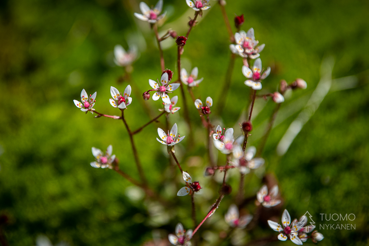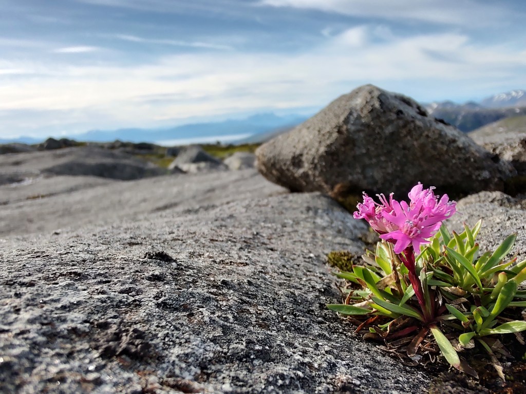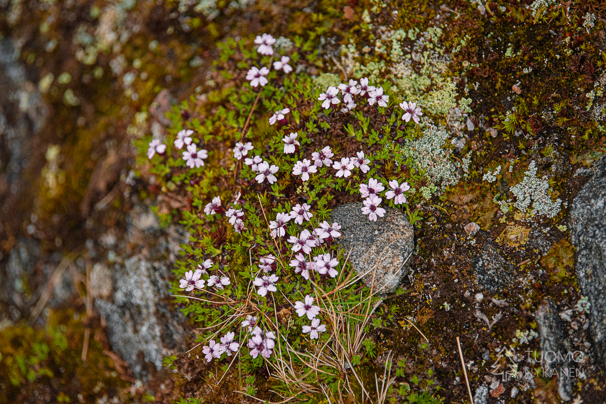 Ensimmäinen kukkija, pikkutervakko, tulee pian vastaan loistaen vaaleanpunaisena tähtenä kallion raossa harmaassa maisemassa. Yksinkertainen on kaunista mitä parhaimmassa merkityksessään.