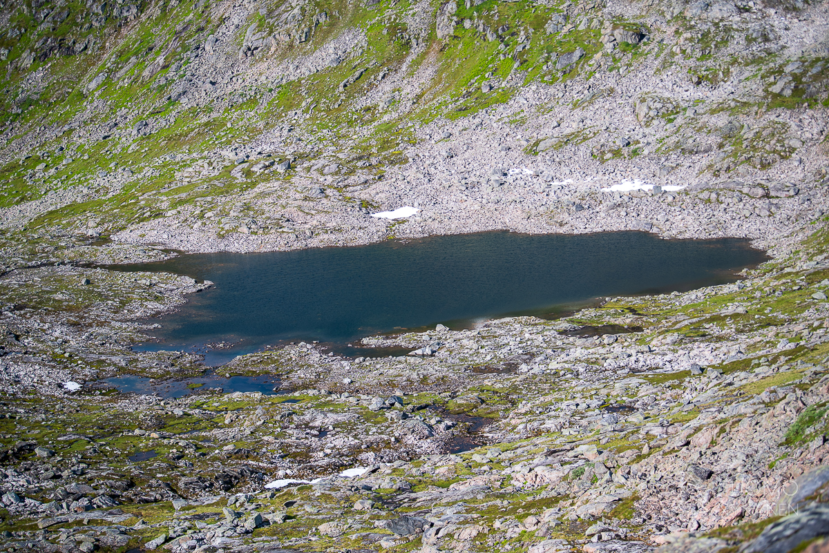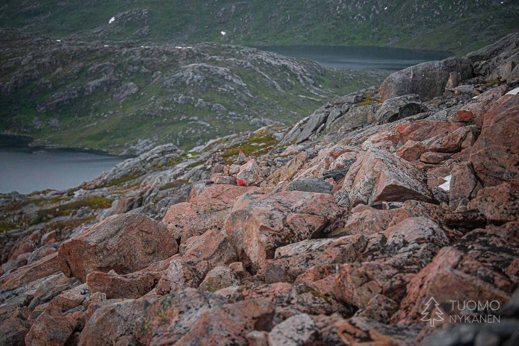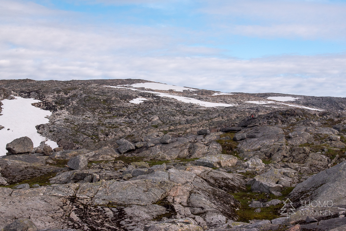 Talvella tämä samainen vuori, Istinden, vei voiton ja jouduin kääntymään takaisin sen rinteiltä lumen määrän käydessä vyötärön korkuisena ylitsepääsemättömäksi. Nyt olen noussut samoihin korkeuksiin ja täytyy kyllä ihmetellä tuota suoritusta. Näin kesälläkin nousu on aika kuluttava ja vie aikaa, vaikkakin rinkka selässä on suurin hidastava tekijä. Mutta silti tuntuu että talvinen minä on ollut kovin sitkeä kaveri, tämä kesäinen versio ei tunnu aivan yhtä notkealta.