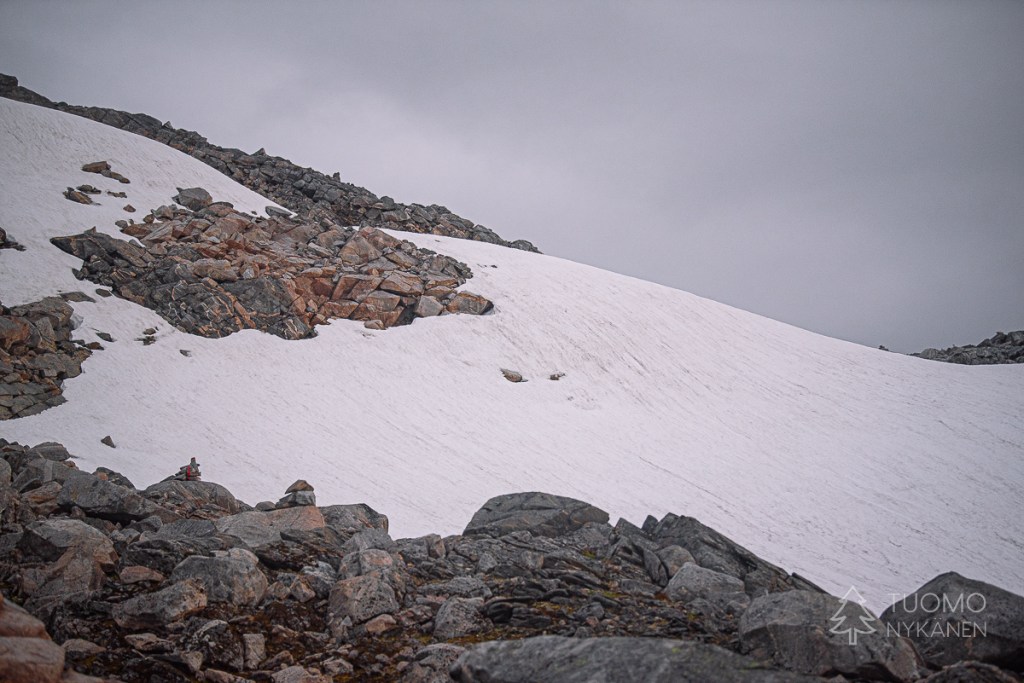 Joskus syy voi olla kivien vakaus reitin lähellä, myöhemmin vastaan tuleva jyrkänne tai mahdollisesti pitkälti kesään riittävä luminen railo. Lopulta on aivan pakko kokeilla nopeampaa laskeutumista sopivan loivan kohdan osuessa vastaan ja hyppään lumeen takapuolelleni. Vauhti alkaa kiihtymään välittömästi, rinkan paino tuntuu vain lisäävän sitä ja heinäkuun lopun lämmössä viiletän lumella alaspäin.