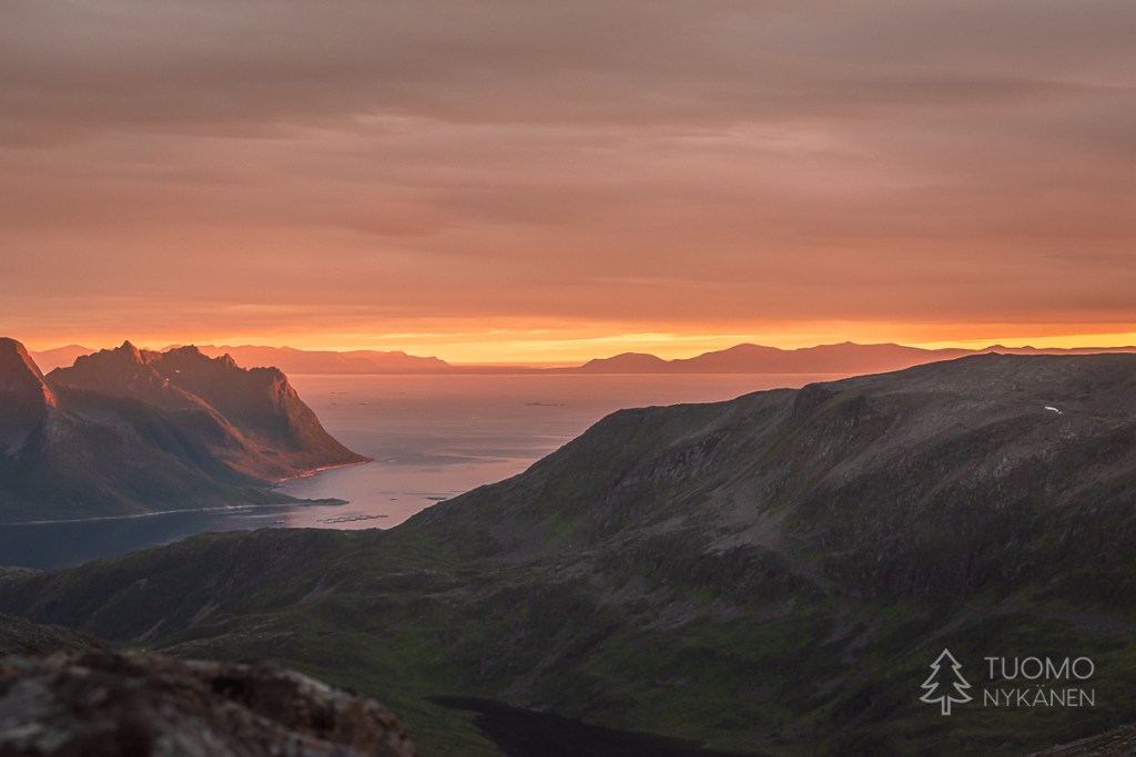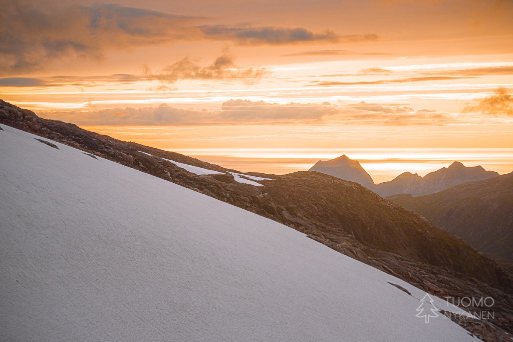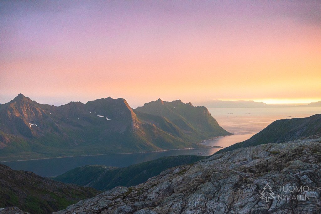 Lähtöpäivä tuntuu ratkeavan, kun saavumme Vannøyalta Senjalle juuri ja juuri sopivaan aikaan. Pääsisin lähtemään poluille puoli seitsemän aikaan illalla, eli Suomen ajassa tunti enemmän. Kuitenkin nousun hoitaminen pois päiväjärjestyksestä heti houkuttaa ja vie voiton vaihtoehdoista. Taustalla edellisen saaren kiipeilyt ja aikaiset heräämiset lähden kohti nousua.