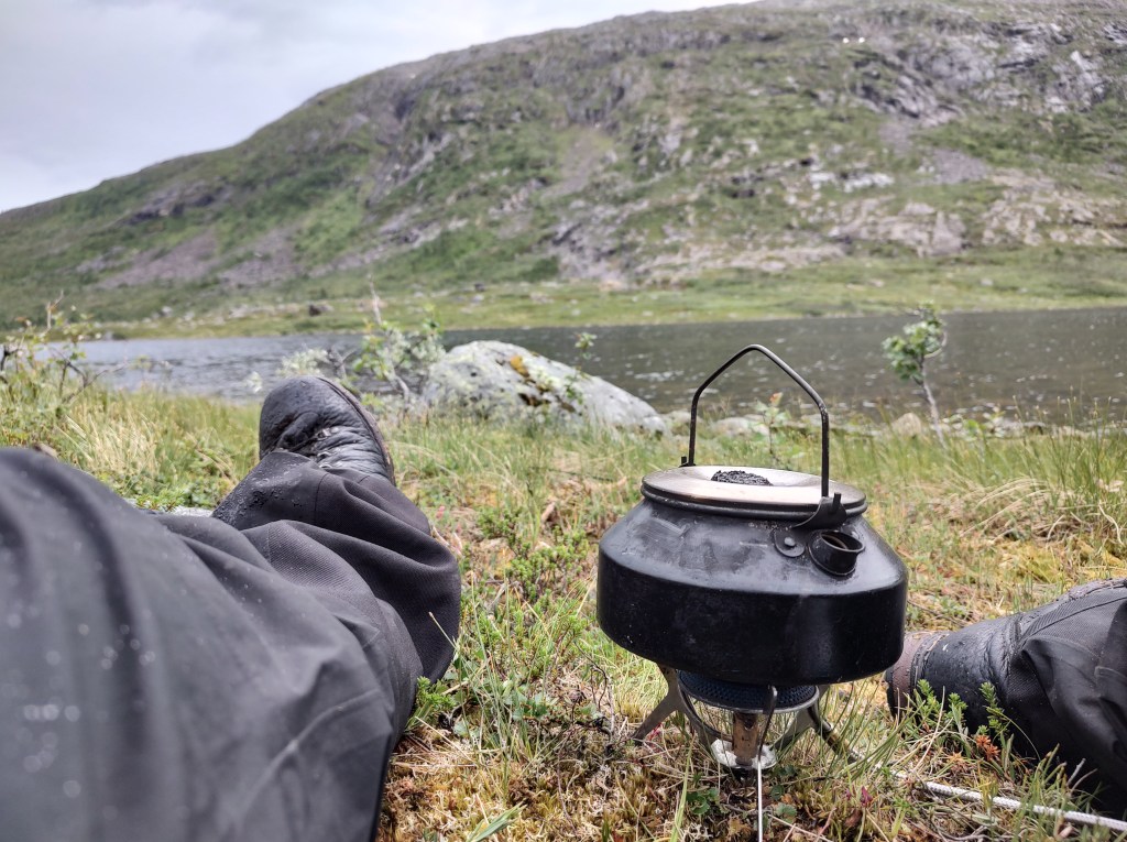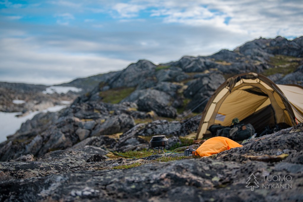 Herään aamulla aikaisin, viideltä, innostuneena ja valmiina jatkamaan reissua. Inspiraatio on kumma juttu, väsymys pyyhkiytyy pois enkä malta odottaa päivän askareisiin ryhtymistä. Tunturituuli on pysynyt leppeänä koko yön ja jatkaa samaa rataa aamulla auringon lämmittäessä selkää. Keittelen vedet, jolla valmistan aamupalan ja kahvin. Käyn ottamassa vedet matkalle ja pistän tavarat kasaan, mutta jään vielä hetkeksi istuskelemaan. Kiirettä ei sinänsä ole, joten nyt vain nautitaan.