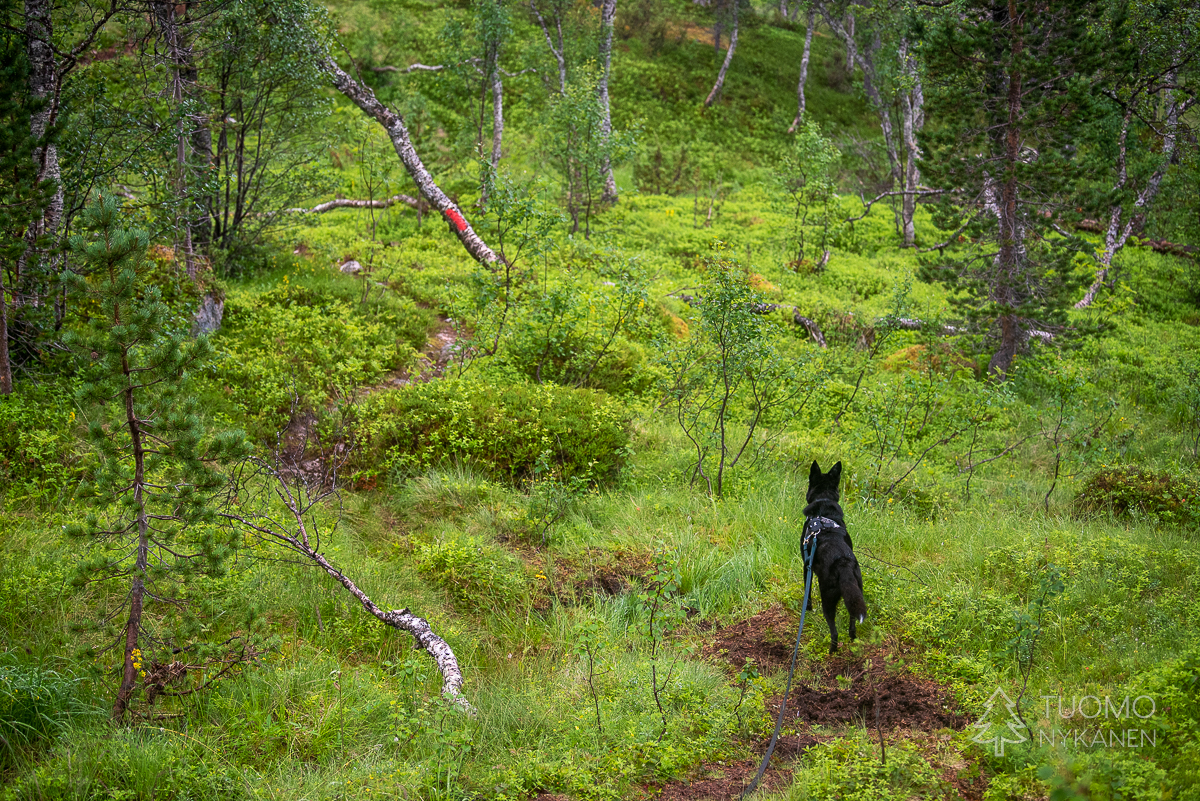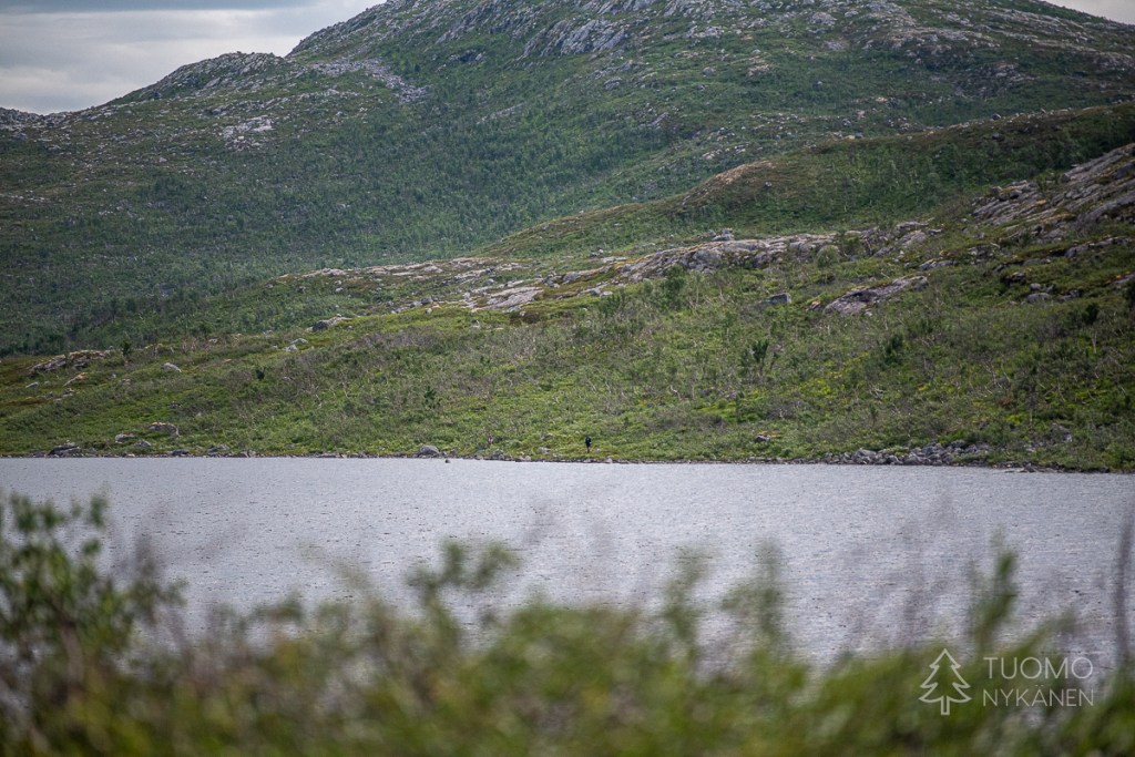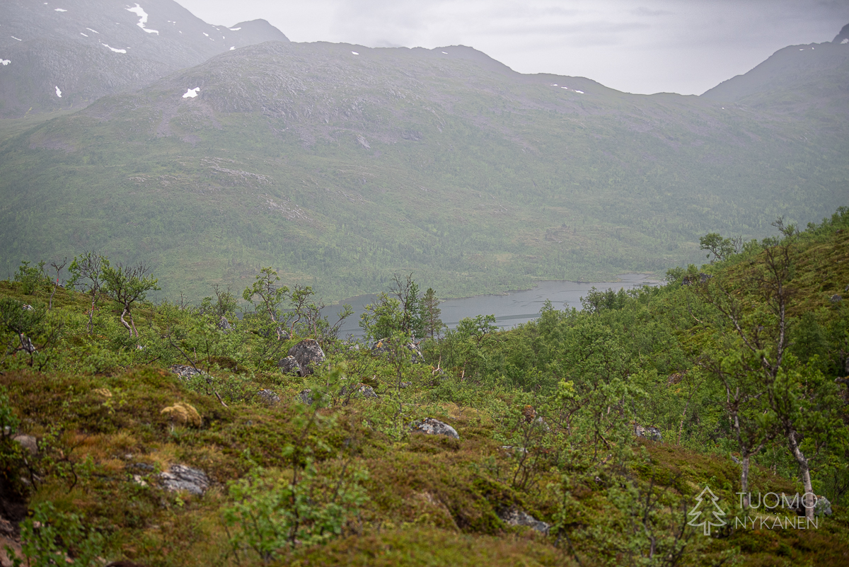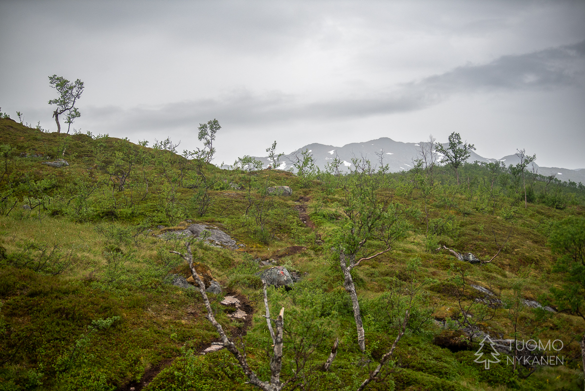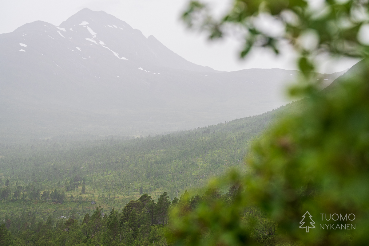 Kestää hetken löytää taas mukava rytmi liikkua kuorivaatteet yllä, liiallinen vauhti ja rykiminen nostaa helposti sisäpuolellekin runsaan kosteuden. Toki hiljalleen hikoilun välttämisestä alkaa tulla mahdotonta, Tromssan läänin alueella on viime viikkoina satanut poikkeuksellisen paljon, joten mutaisesta soiseen vaihtuva maa alkaa sateen yltyessä upottamaan yhä enemmän. Vielä jaksan yrittää väistellä upottavimpia kohtia, mutta märiksi muuttuvat oksat tiputtavat yhä kasvavia määriä vettä päälleni kulkiessani puiden ja puskien lävitse.