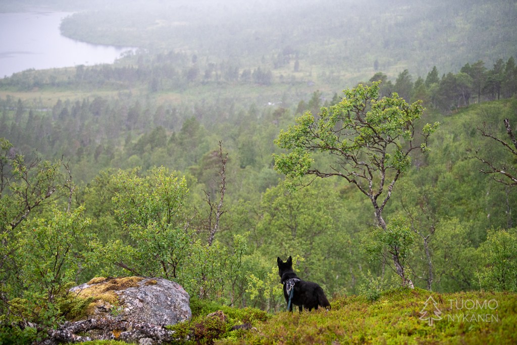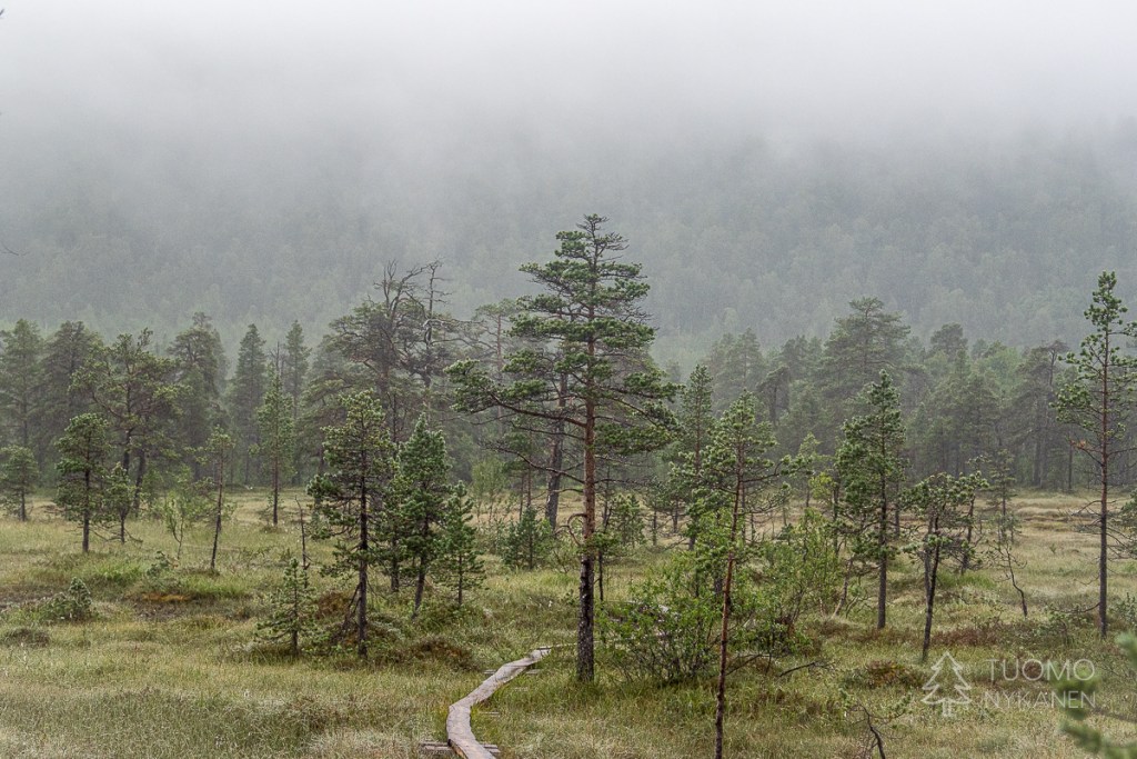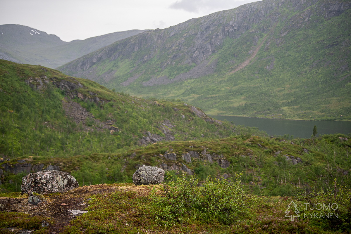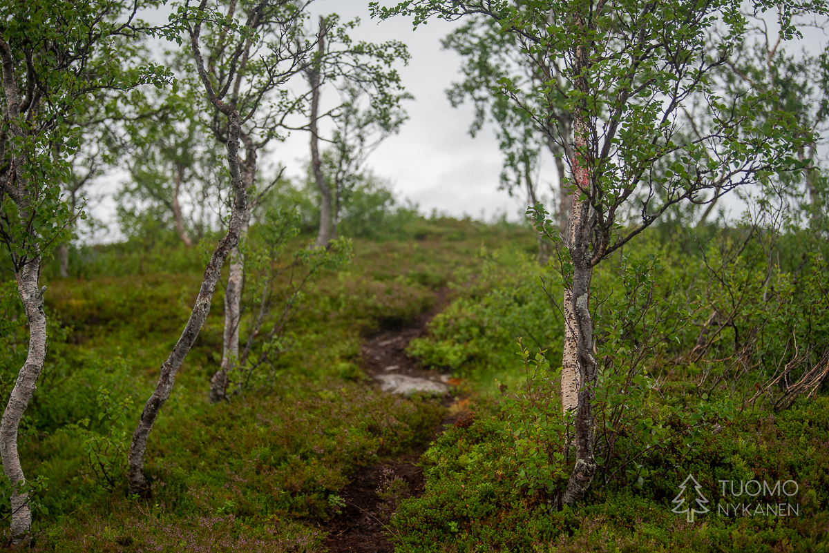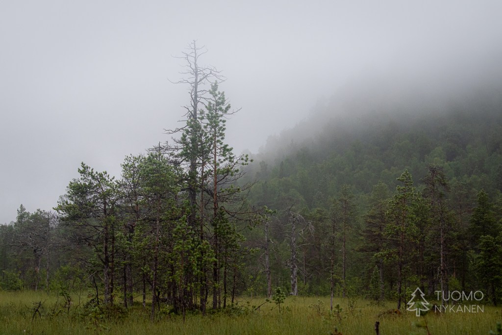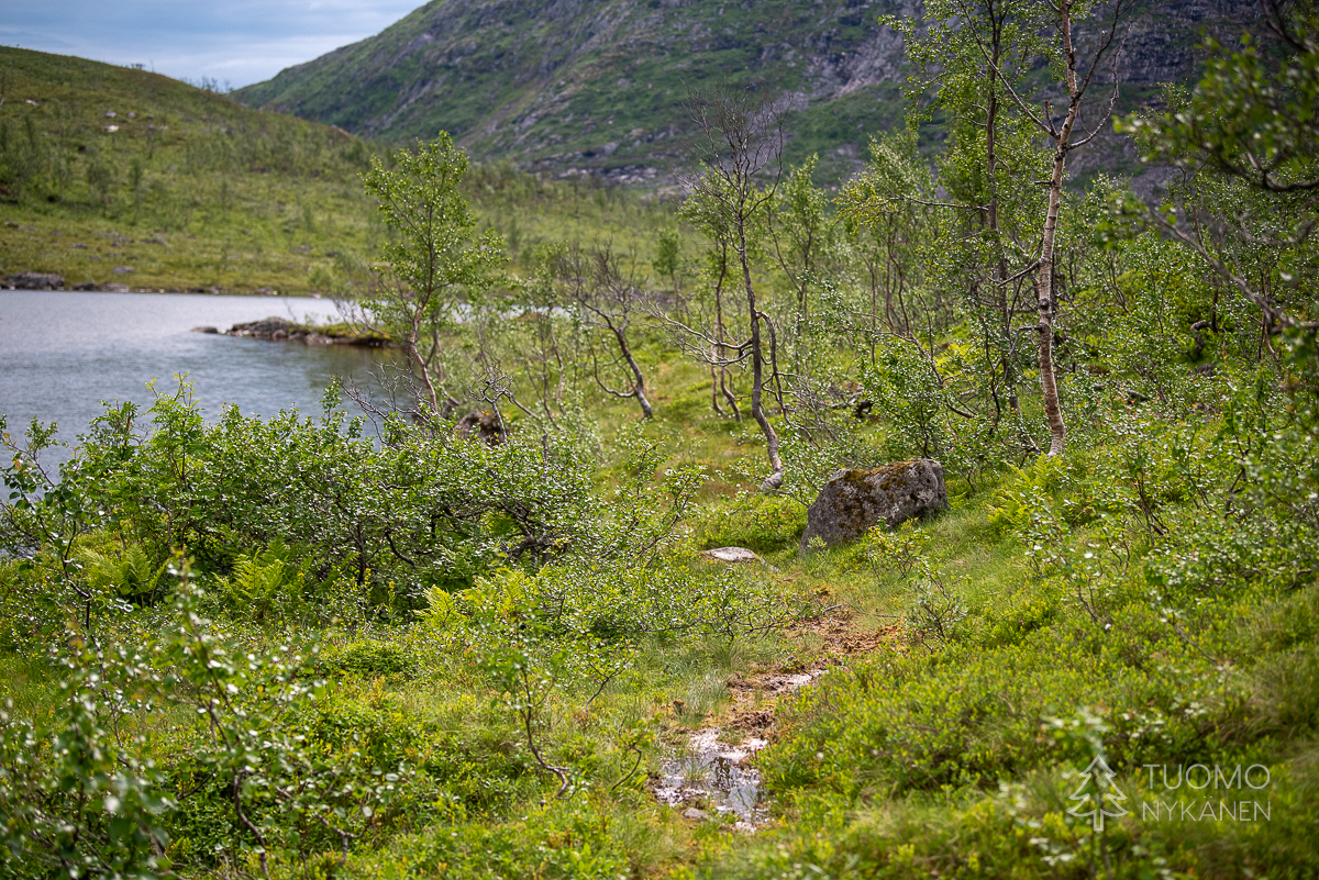 Kestää hetken löytää taas mukava rytmi liikkua kuorivaatteet yllä, liiallinen vauhti ja rykiminen nostaa helposti sisäpuolellekin runsaan kosteuden. Toki hiljalleen hikoilun välttämisestä alkaa tulla mahdotonta, Tromssan läänin alueella on viime viikkoina satanut poikkeuksellisen paljon, joten mutaisesta soiseen vaihtuva maa alkaa sateen yltyessä upottamaan yhä enemmän. Vielä jaksan yrittää väistellä upottavimpia kohtia, mutta märiksi muuttuvat oksat tiputtavat yhä kasvavia määriä vettä päälleni kulkiessani puiden ja puskien lävitse.