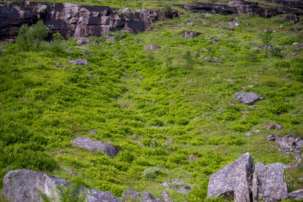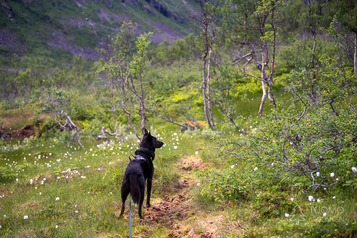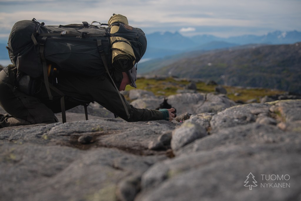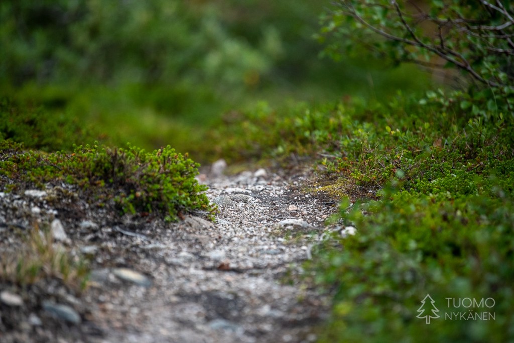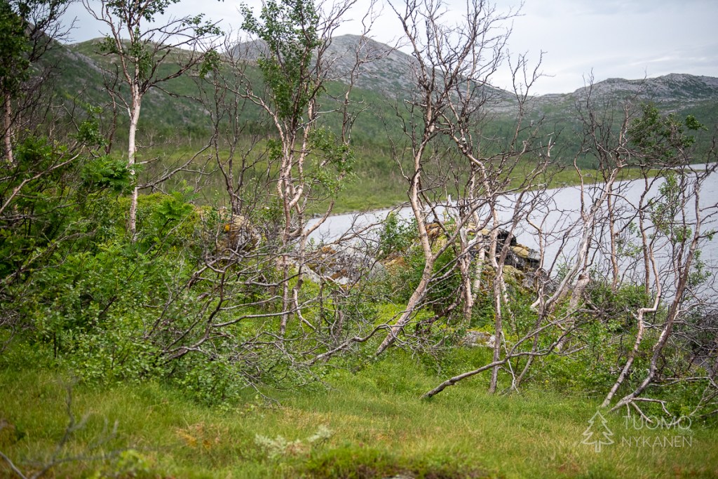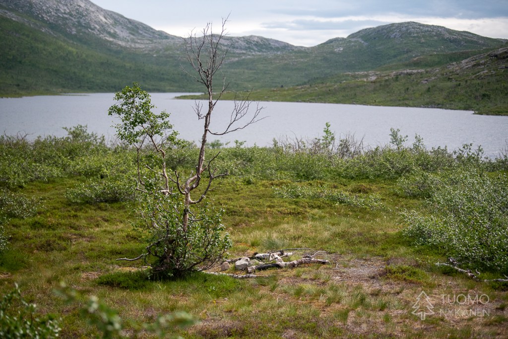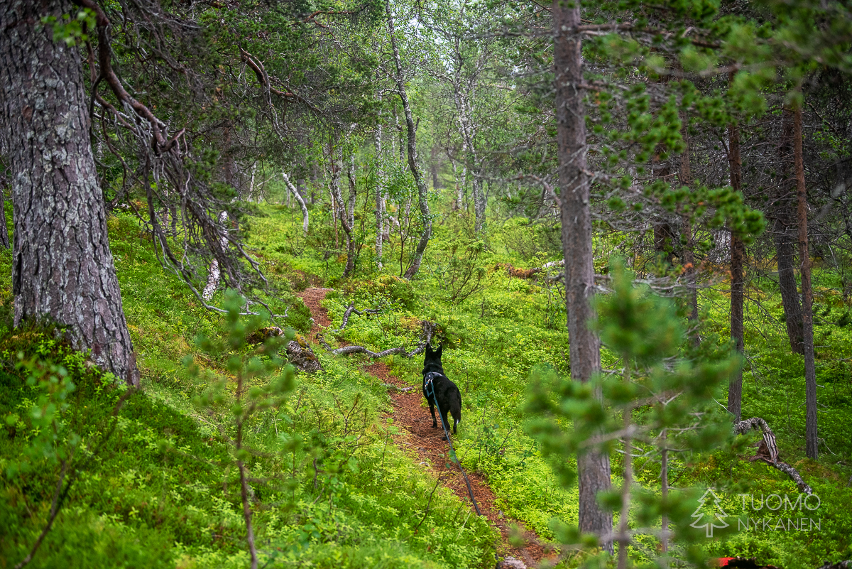 Kestää hetken löytää taas mukava rytmi liikkua kuorivaatteet yllä, liiallinen vauhti ja rykiminen nostaa helposti sisäpuolellekin runsaan kosteuden. Toki hiljalleen hikoilun välttämisestä alkaa tulla mahdotonta, Tromssan läänin alueella on viime viikkoina satanut poikkeuksellisen paljon, joten mutaisesta soiseen vaihtuva maa alkaa sateen yltyessä upottamaan yhä enemmän. Vielä jaksan yrittää väistellä upottavimpia kohtia, mutta märiksi muuttuvat oksat tiputtavat yhä kasvavia määriä vettä päälleni kulkiessani puiden ja puskien lävitse.