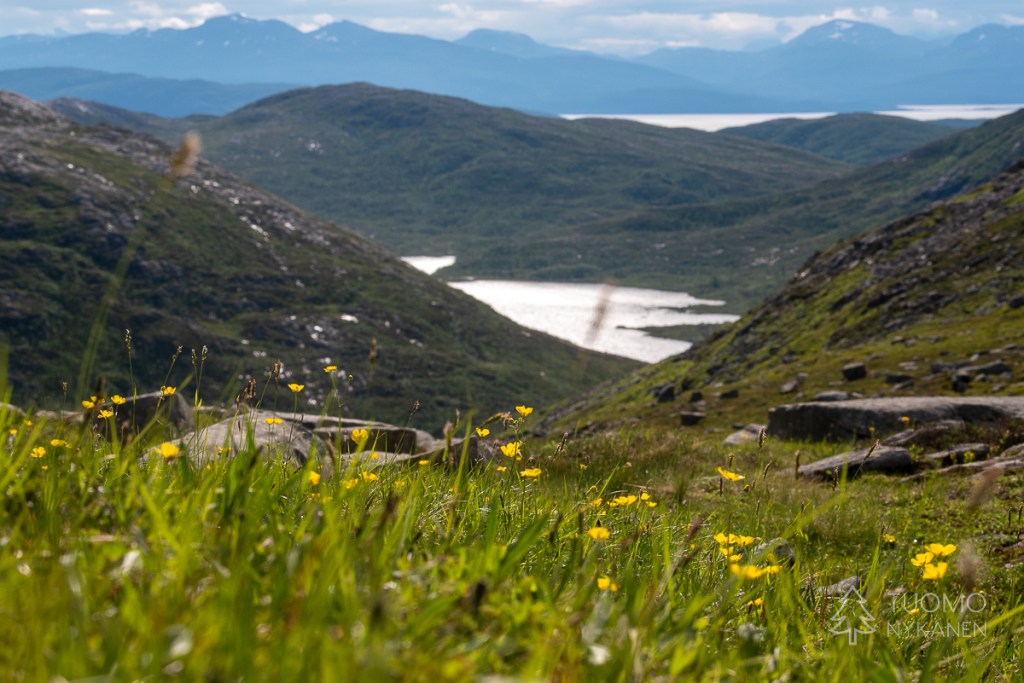 Pylly märkänä lumesta tulen Doaresoaivin kupeille kohtaan, josta avautuu näkymä suurelle järvelle Kapervatnet (vanha nimi Sörkapervatnet.) Vaikka ylhäällä näkymät ovat olleet huimia niin odotan kuitenkin jo kovasti vehreään laaksoon laskeutumista. Näkymä ei ole aivan sellainen kuin olisin kuvitellut sen olevan, vuoret estävät näkymää pidemmälle, mutta toisaalta erittäin hyvä näin, kohde kerrallaan. Tämä laakso on ensimmäinen vihreänä ja kukkivana aukeava luonnon taideteos joka täällä eteeni aukeaa, sen kultaa on vehreydessä heilahtelevat leinikit ja jalokivi on keskellä virtaava kimalteleva joki, joka kasvaa suureksi voimakkaaksi putoukseksi alempana laaksossa.