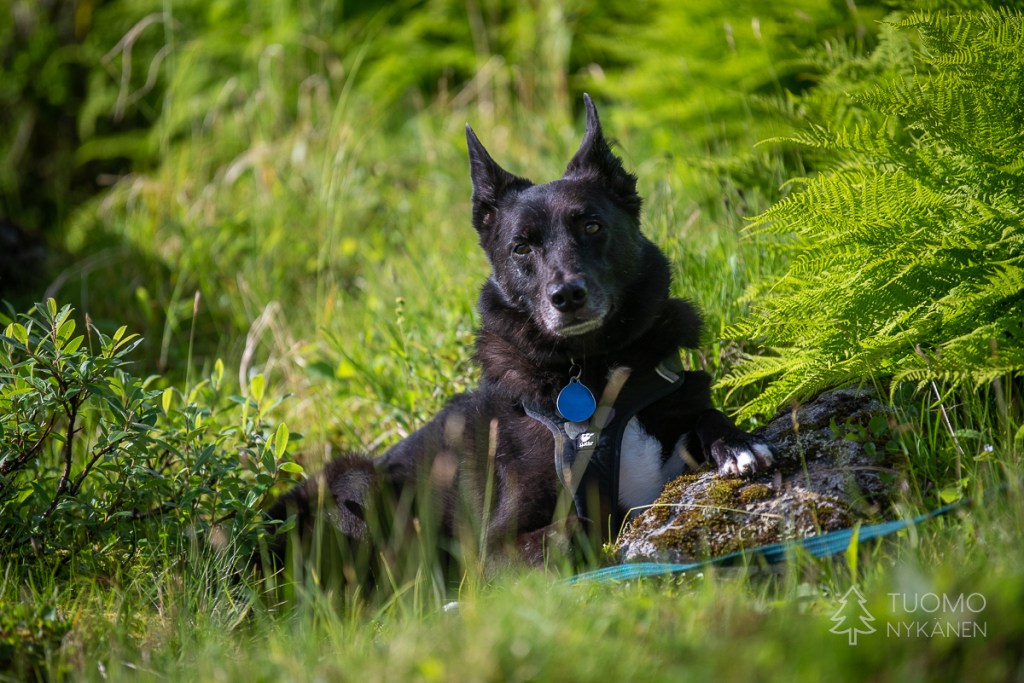 Yoshia käydään jonkin verran puremassa, sillä heti pysähdyttyämme koira kaivaa itselleen kiven kylkeen kolon, johon voi painaa mahansa suojaan. Suuntaan järven kylkeen työntyvään niemenkärkeen, jotta voin tauon aikana nauttia mukavasta tuulen vireestä ja voin antaa sen pitää pörräävät sekä inisevät ystävät loitolla.