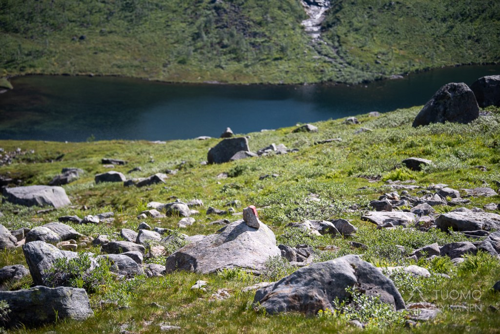Pakkaan kameran jo pois, turvaan sateelta ja vedeltä joka tekee tietään läpi kovan kuoren. Åndervatnetin järven rannoilla alkaa näkymään jo enemmän jälkiä ihmisistä, paikoin yksittäisiä roskia, kuluneempia kulkuväyliä ja useampia nuotipaikkoja. Luulisin että järven päädyssä oleva tupa on yleinen kääntymispaikka, seuraavana tulee järven kierto ja kolmantena sekä tämän että Kapervatnetin kiertäminen. Vaikka polku olisi selkeämpää ja kait suorempaakin niin haluan silti kävellä mielummin vaikuttavan järven kivikkoista rantaa. Kivet kalahtelevat, vesi liplattaa ja jossain kohisee koski.