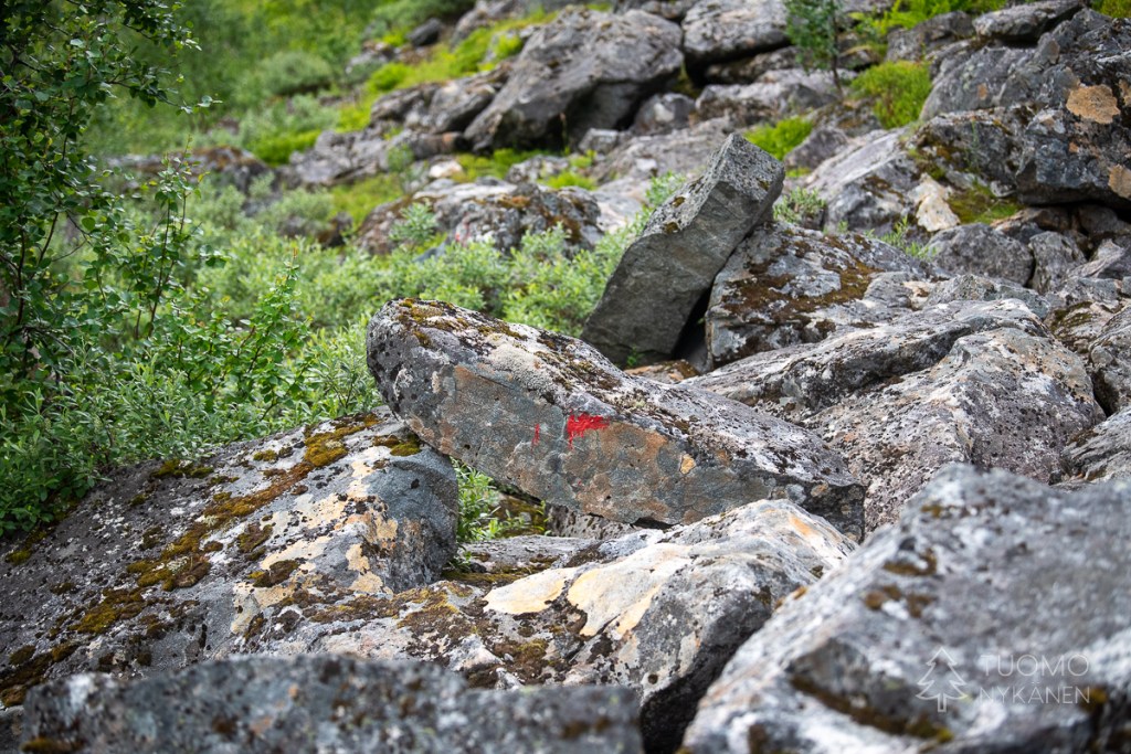 Suurten lohkareiden yli ei ole kovinkaan mukava kiipeillä, varsinkin kun näkyy että henkilöauton kokoiset kivet ovat rymisseet parista kohtaa alas aivan koko rinteen korkeudelta. Kulunut punainen merkki parin kiven kyljessä onneksi näyttää etteivät ne ole tulleet alas aivan äskettäin mutta täällä kivivyöryt ovat hyvin yleisiä, varsinkin huonon kelin aikaan. Lohkareet vaihtuvat suohon, joka on paikoin kohtuullisen syvääkin.