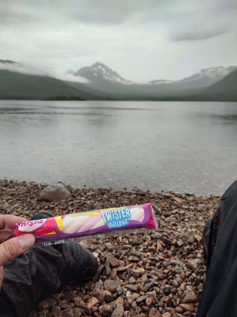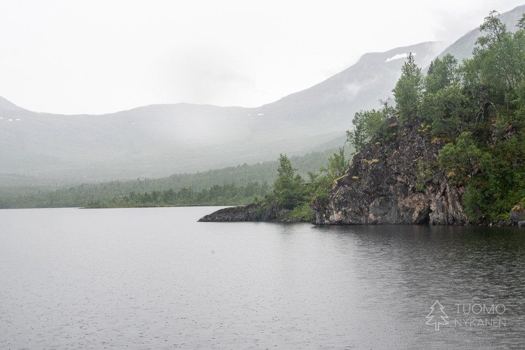 Vesi sekä kosteus ovat jo saaneet voiton ja tulleet läpi vaatteiden iholle. En yritä sen kummemmin suojata itseäni vaan istahdan alas ja tipautan rinkan hetkeksi selästäni, kaivan sen taskuista vähän väriä harmauden keskelle ja mussutan vaahtokarkkitankoa tyytyväisenä kuin pieni lapsi karkkikaupassa. Alan olemaan jo läpimärkä, mutten haluaisi olla missään muualla juuri nyt. Pienen hetken päästä tähän tulee vielä se täydellinen varmistus ja kruunu kun keskellä järveä kelluva kuikka päästää parin ujomman ”aau” huudahduksensa jälkeen äänijänteensä täysin auki, harmaan tyhjyyden keskellä tuo ääni lähettää väristykset läpi ruumiini. Sade on kussut niskaani jo pitkän tovin, mutta näiden maisemien ja elämysten keskellä en voi muuta kuin istuskella rantakivillä ja hymyillä, näky joka varmasti olisi jollekin läheltä kulkevalle retkeilijälle enemmänkin kuin erikoinen.