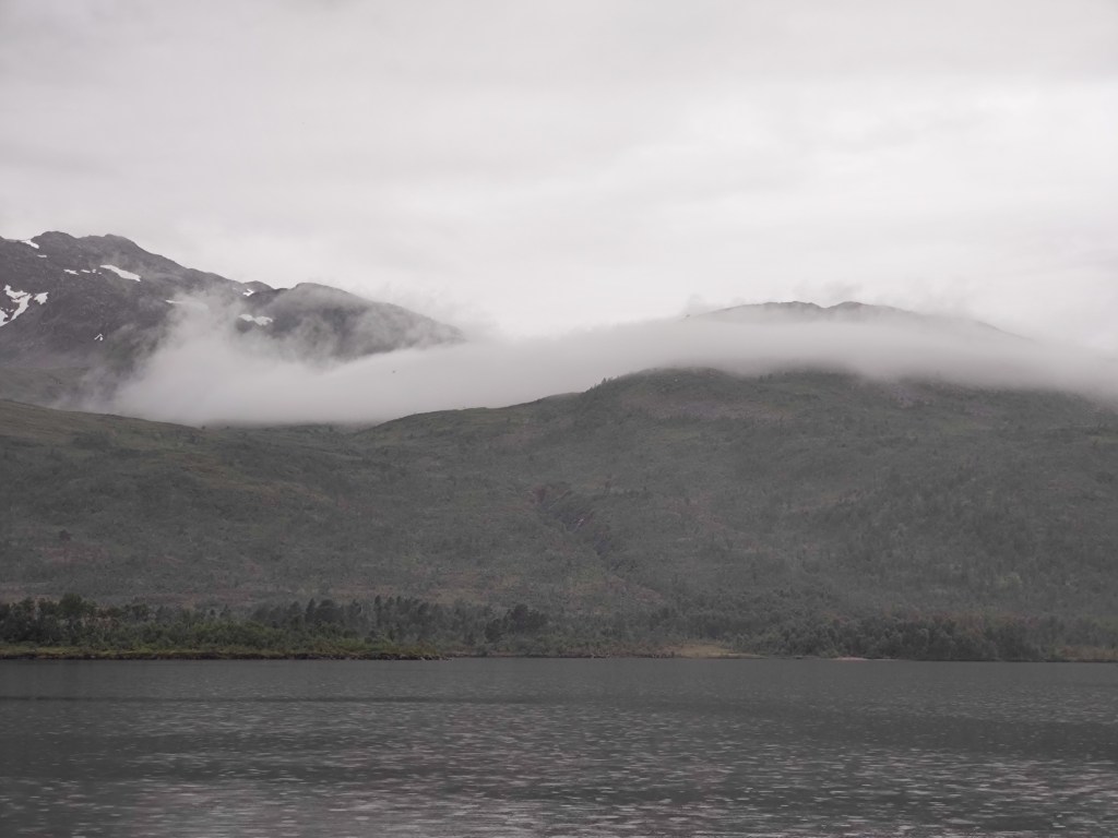 Sade yltyy ja sumu lisääntyy, kun saavun mäen päälle josta aukeaa näkymä Åndervatnetille. Harmaana ja monotonisen värisenäkin tämä erämainen järvi on kovin kaunis ja erittäin palkitseva näky. Istahdan hetkeksi ihailemaan maisemaa avoimelle paikalle, mutta sitä katsoessa joudun tekemään päätöksen.