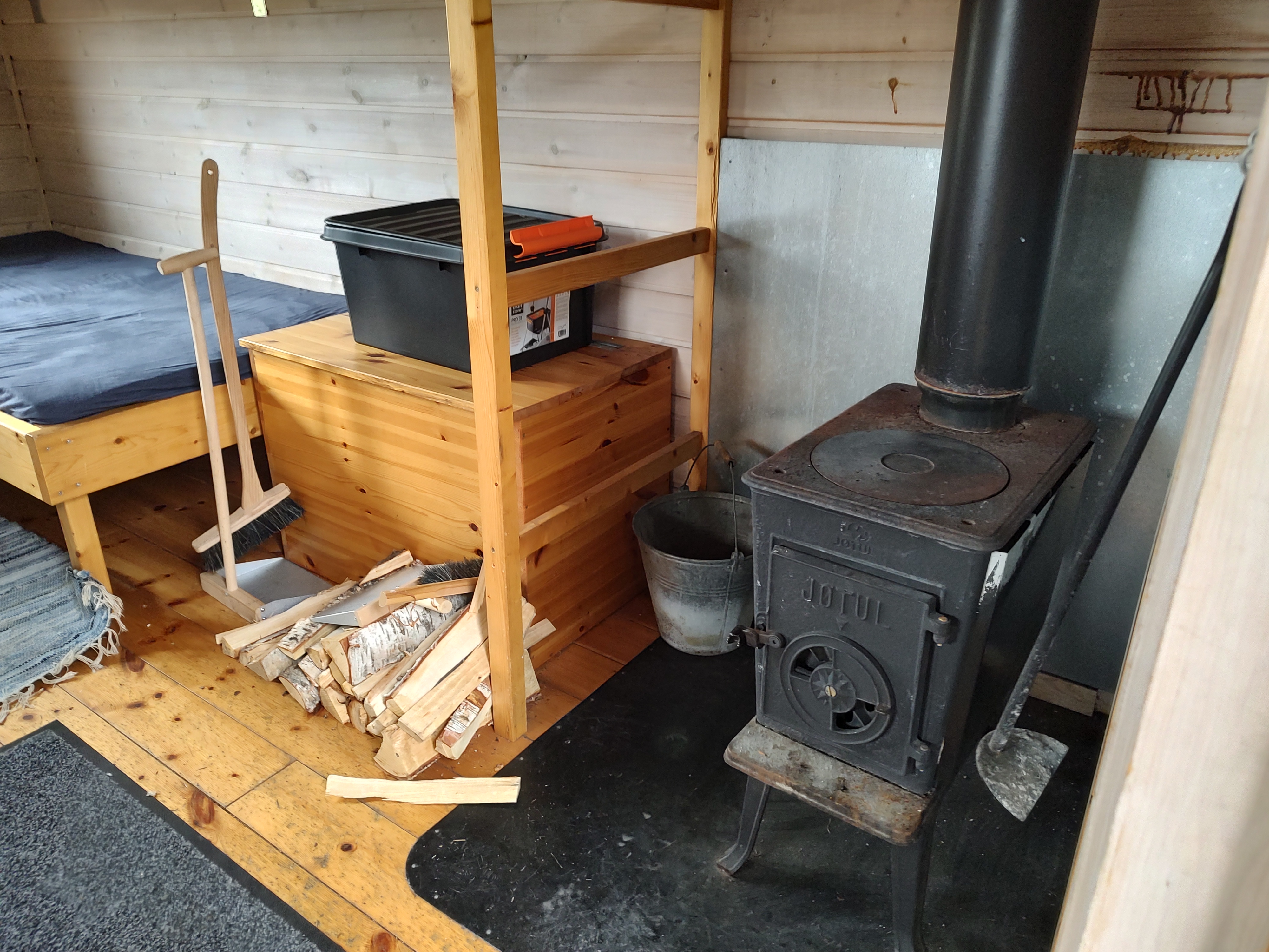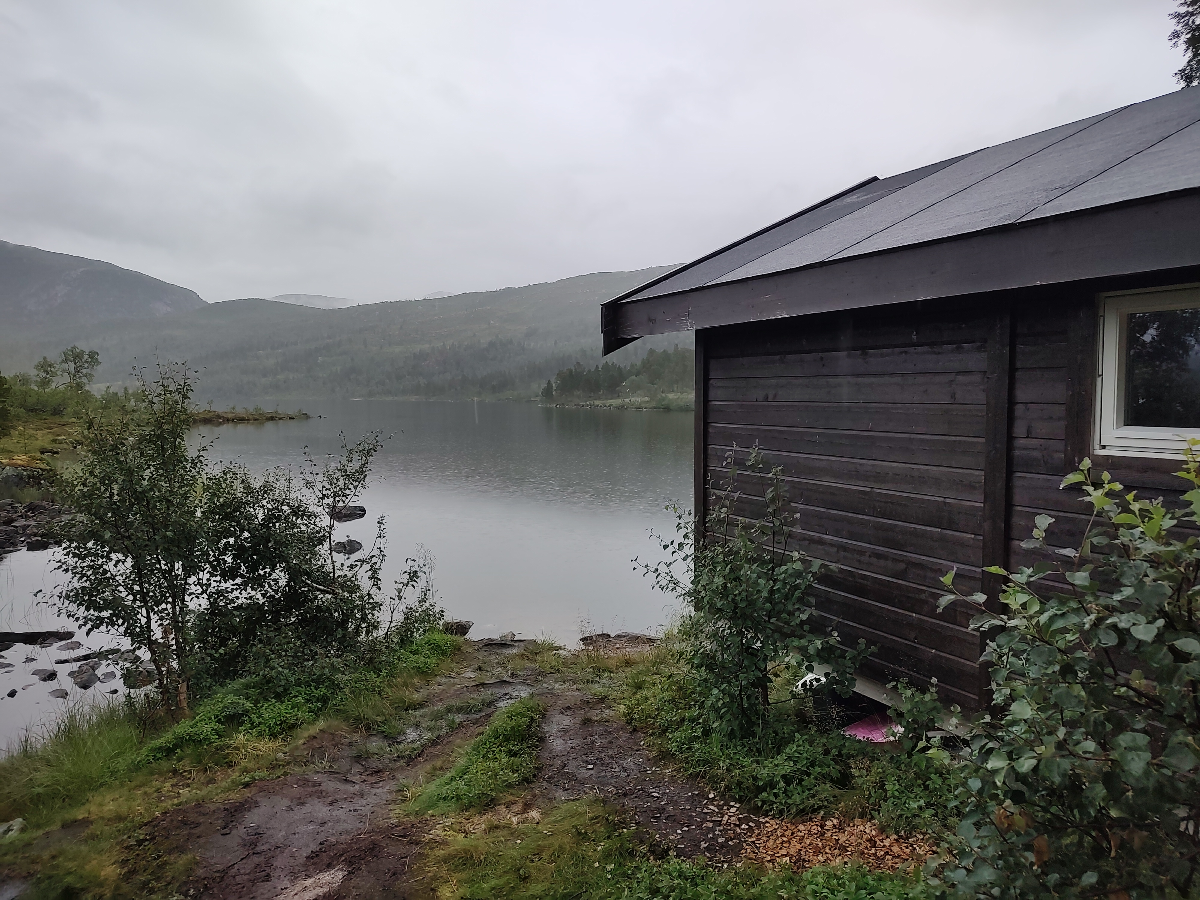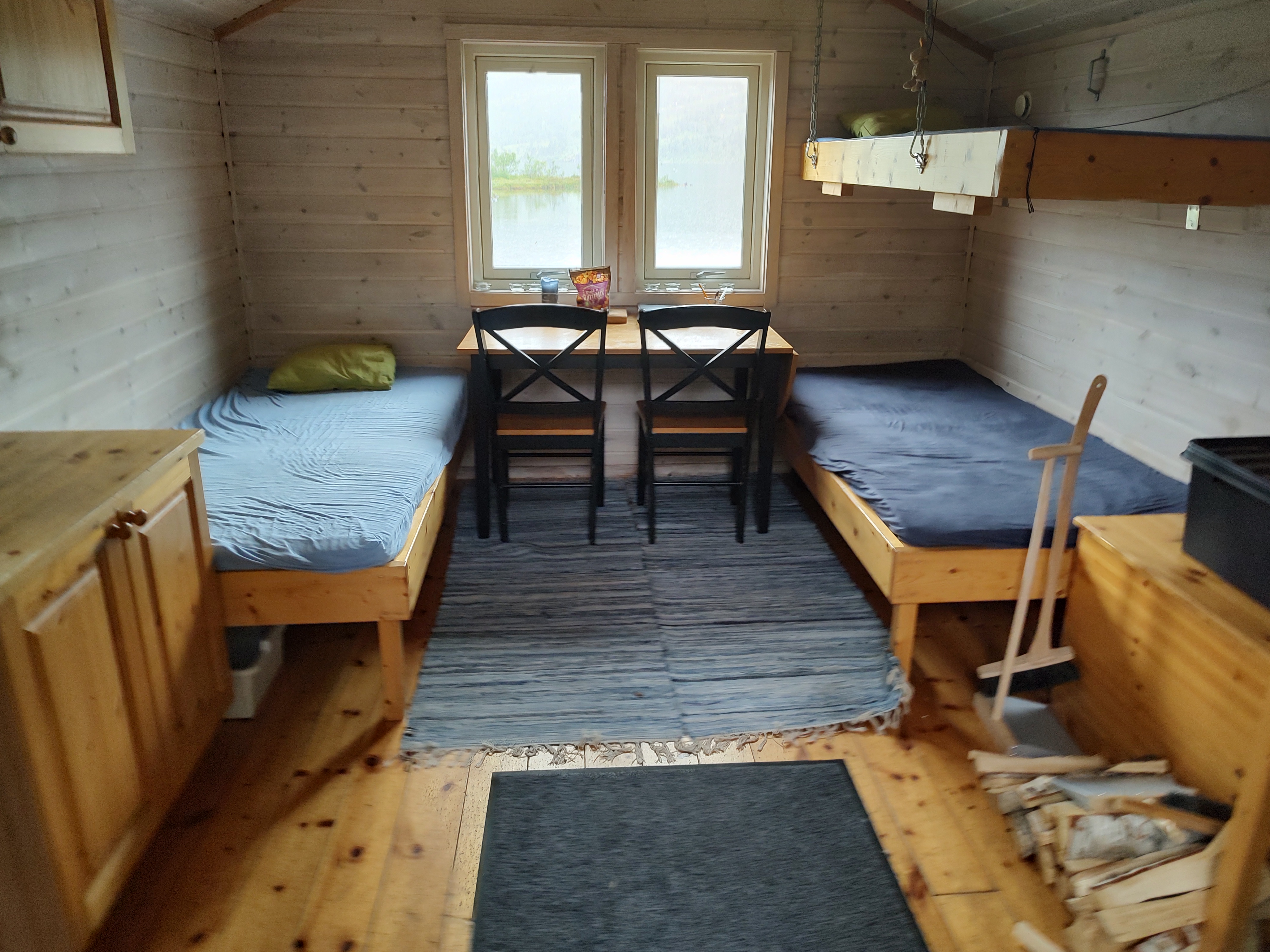 Neljäpaikkainen autiotupa on sisältä upea ja erittäin siisti, en raaski itse astua sisään sillä muta yltää lahkeissani jo lähes polviin saakka. Hieno paikka tehdä vaikka päiväretki ja viettää hieman aikaa vuorten keskellä olevan erämaajärven rannalla, sivummalta muutaman sadan metrin päästä löytyy myös tulipaikka (Taisi olla että norjalaiseen tapaan puut sinne täytyy kantaa tuvalta saakka.)