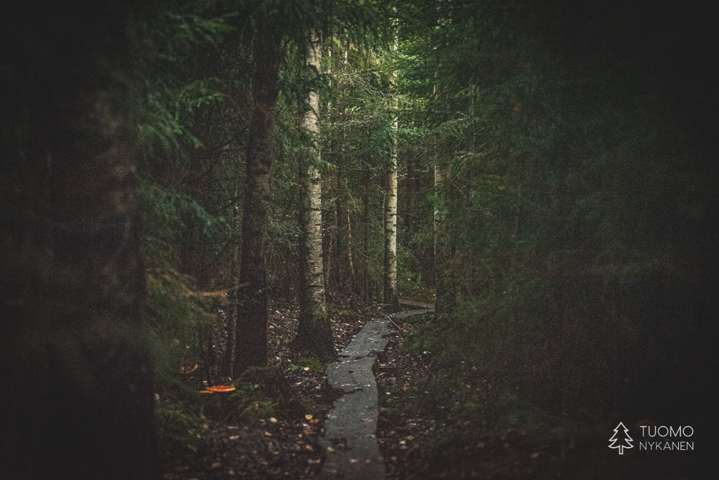 Suon laidassa polku jakaantuu valintaan siitä kummin päin reitin haluaa kiertää, valitsen vastapäivään. Nostan kameran polun suuntaisesti ja sen valotusarvot kertovat ettei aurinko ole vieläkään noussut tai ettei sen pääsyä ole sallittu tänne kuusten alle. Jatkan matkaani kuusen oksien alle sillä jos ne suojelevat minua valolta, ne suojelevat minua kaikelta.