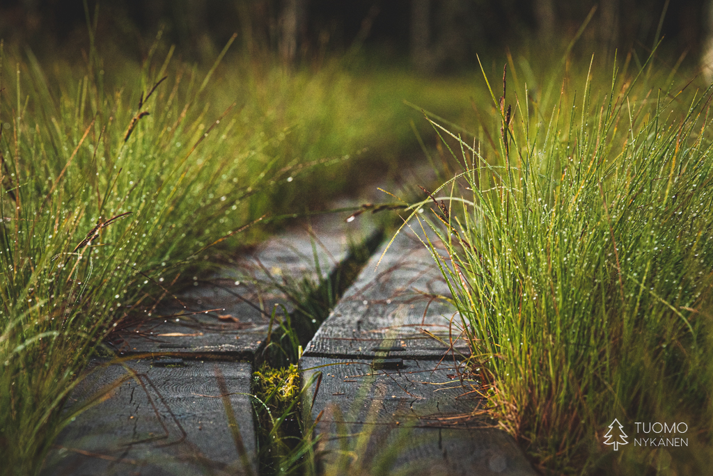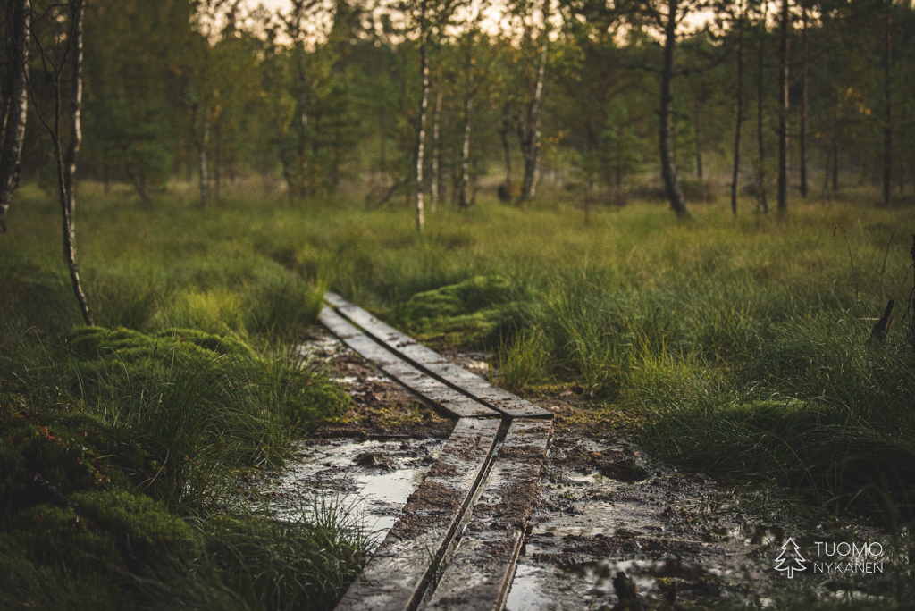 Lampea kiertävät pitkokset taas kapenevat samalla kun näkymäkin vaihtuu jo selkeämmin suon ja pienen lammen yhdistelmäksi. Lammen laitaa kulkiessa harmaa taivas alkoi pisaroimaan hellästi auringonlaskun pilkistellessä pilvimassan raoista. Samalla hetkellä kapustarinta alkoi viheltämään kaihoisasti hiljaisuudessa, samantien lähes kylmät väreet – suon parhaat hetket käsillä.