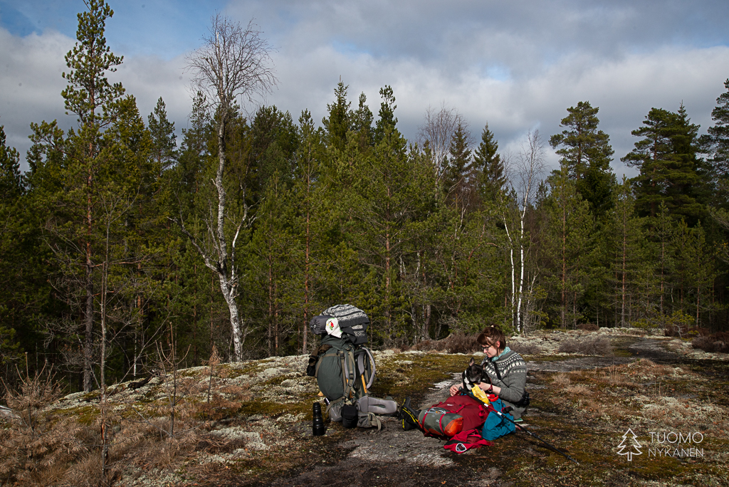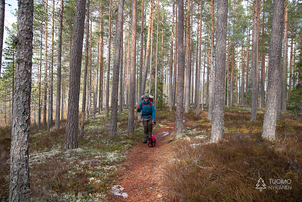 Alhaalla kurussa upottaa huolella, uppoan joka toisella askeleella lähes puoleen sääreen lumikengistä huolimatta. Lumen pinta on koppura, joka antaa vastusta askeleille, mutta pintakuoren alla onkin pehmeää puuterilunta. Tuomo on jo hiihdellyt seuraavalle laelle, kun itse lähden nousemaan. Tuulensuojan puolella rinne on myös pehmeää ja horjahdan jo toistamiseen nurin. Koira ryntää juosten luokse hihna perässään katsomaan miksi ryömin lumessa. Tuomo tyytyy nauraen kuvaamaan taisteluani laelta. Ihmeen kaupalla saan itseni pungettua jälleen jalkeilleni, ja jatkamaan matkaa.