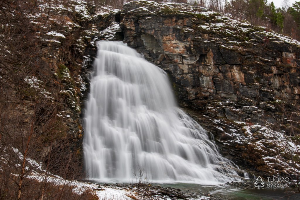Korkealta valuva koski virtaa vuolaana.