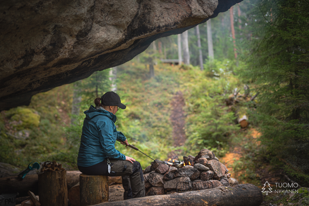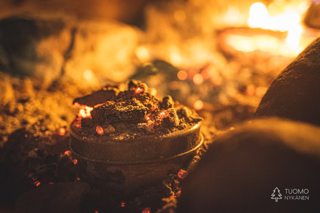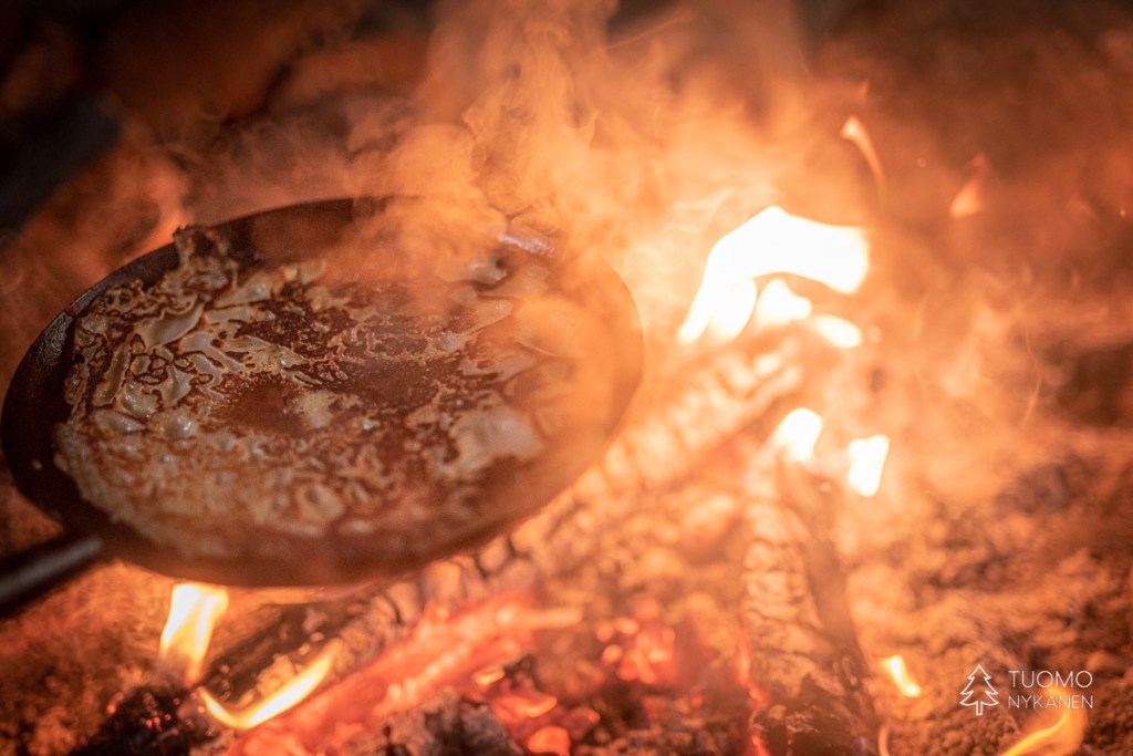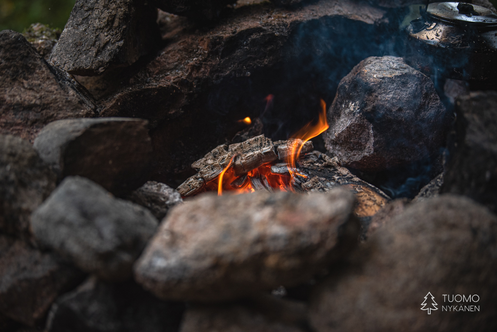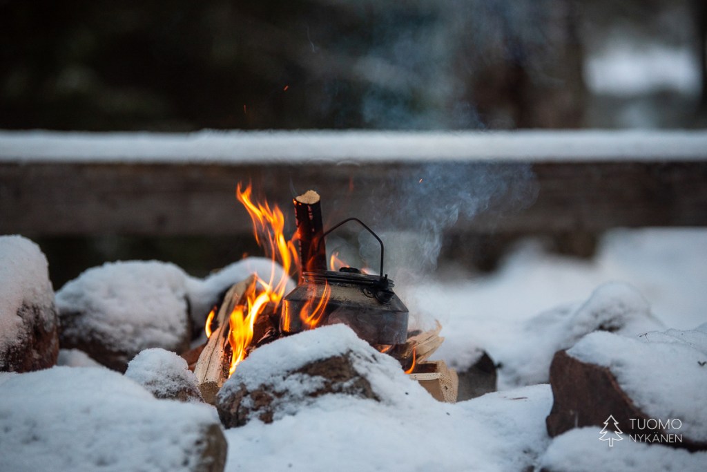 Raivaan tulipaikan tyhjäksi lumesta, pinoan puut huolellisesti tuulta vastaan ja nostan pannun lämpenemään. Tuoksu on täydellisen tunnelmallinen – lämmin nuotion savu vasten raikasta talvi-ilmaa.