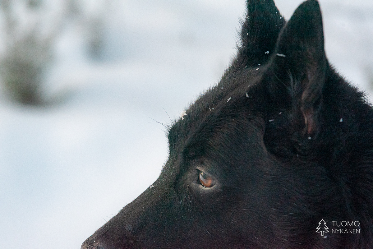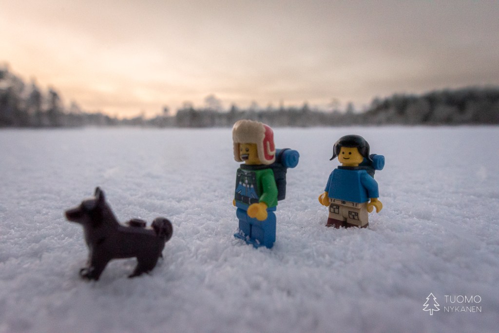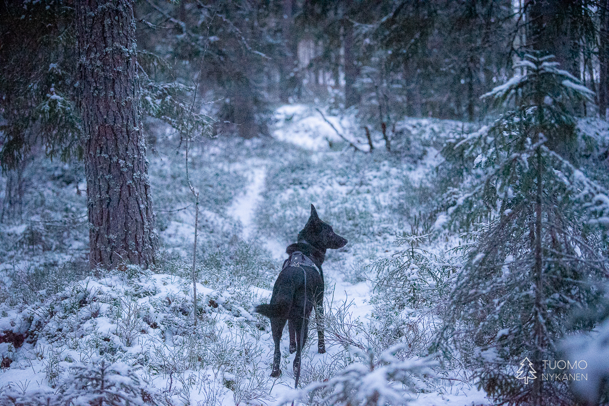 Lapakisto on nätti hiljainen paikka ja talvella se vielä korostuu kun pääsee katsomaan maisemia vesistöjen keskeltä, samalla lumesta kimpoavaa valoa tankaten. Mihinkään ei ole nyt kiire, ennenkuin on aika taas lopulta jatkaa takaisin polkujen vietäväksi. Koskemattomat metsäpolut jatkuvat vielä hetken mutta alueen puolittavalla metsätiellä tilanne muuttuu – muiden ihmisten jälkiä. Tänne on näköjään saapunut joku muukin ja Yoshi iskee kuonon maahan lähtiessään jälkien perään.