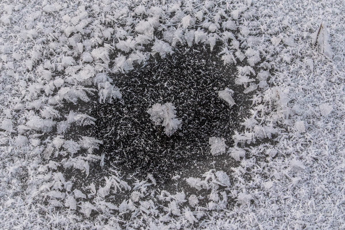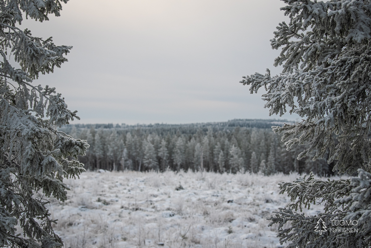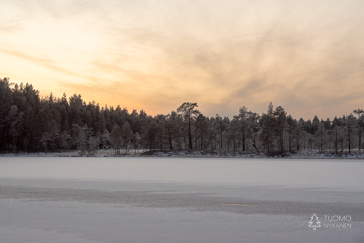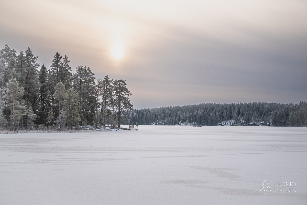 ”Tuulen täytyy käydä pohjoisesta” mietin, sillä vain pohjoinen tuuli voi olla ihmistä kohtaan näin raaka. Ahvenlammin pintaa rientävä tuuli nostaa jään pinnasta kiteitä ja heittää ne suoraan päin naamaani, ensin edestä sitten sivulta. Kun jää ei tepsi yrittää viima vielä nostattaa tulesta kipinöitä heittääkseen nekin vihoissaan. Mutta silläkään ei ole muuta vaikutusta kuin että kiristän hieman kaulusta ja otan uuden siemauksen kuksasta odottaessani eväsleipien lämpenemistä. Metsän ja lampien halki kulkiessa on kehon lämmitys käynnistynyt ja lentelevä lumi sulaa lämpimille kasvoille. Talvi täyttää tehtäväänsä ja nautin siitä täysillä.