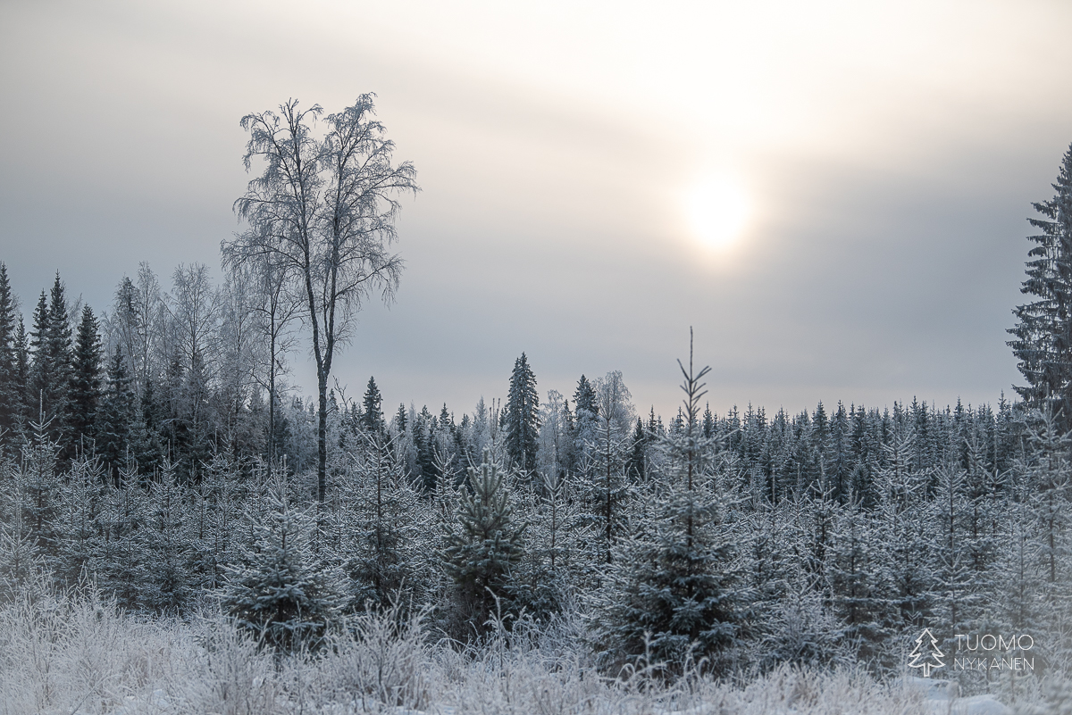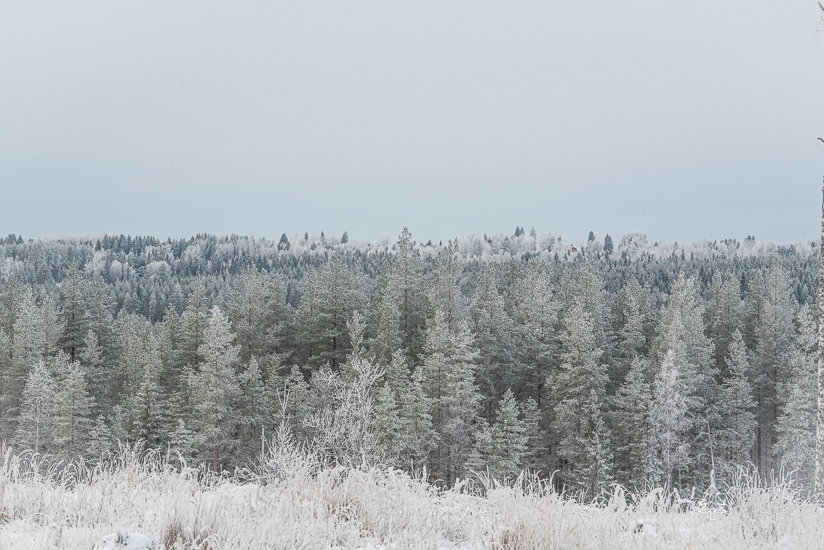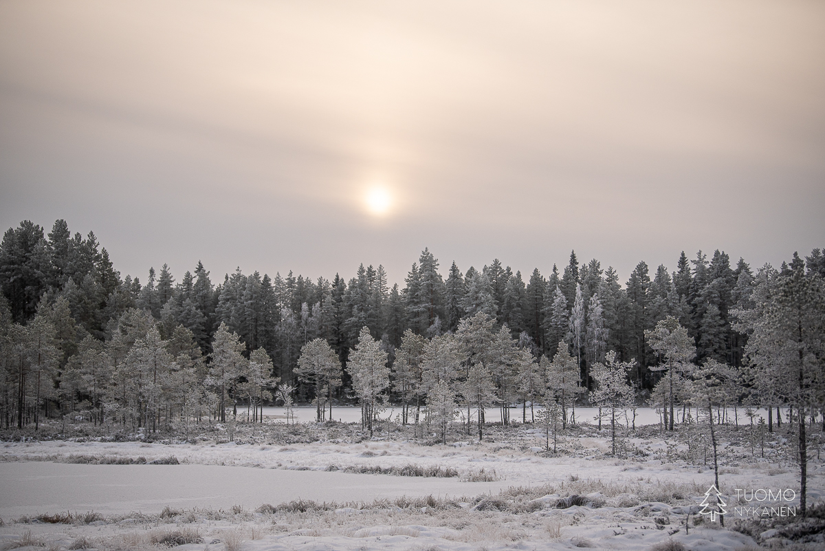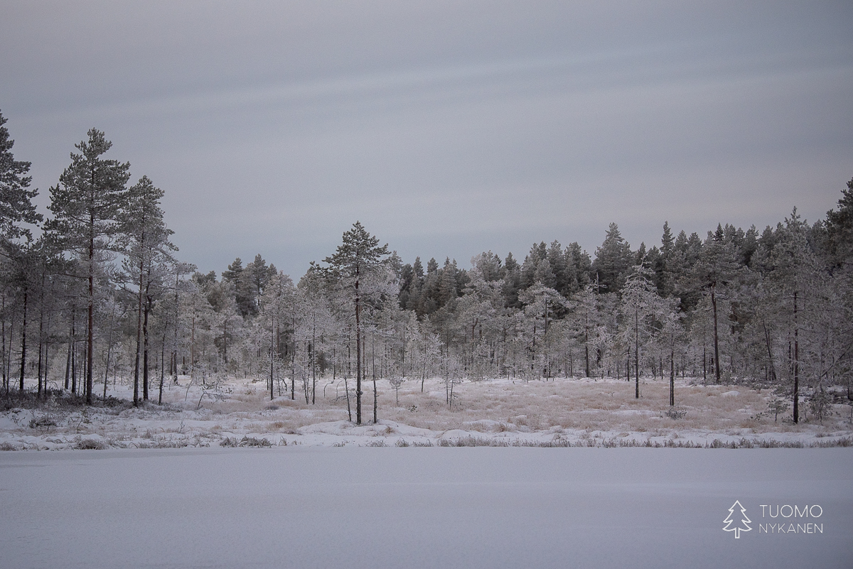 Keliä voisi myös sanoa ikäväksi mutta mieli on mukava, vapaapäivänä on aikaa eikä väsyttävä pohraaminen koskemattomassa lumessa haittaa kun palkinnoksi istuu hetken jään ja tulen välissä. Ennen kuin aurinko nousi käännyin moottoritieltä Lapakiston luonnonsuojelualuetta kohti vievälle pienemmälle tielle. Se kaartuu moottoritien ylitse johtavalle sillalle josta näki kuinka raskas rahti jyristi arkisesti menemään tummalla asfaltilla. Oma tie taas jatkuu syvemmälle metsään ja lumen määrä maassa sekä puissa kasvaa samaa vauhtia kuin tiet pienenevät.