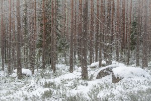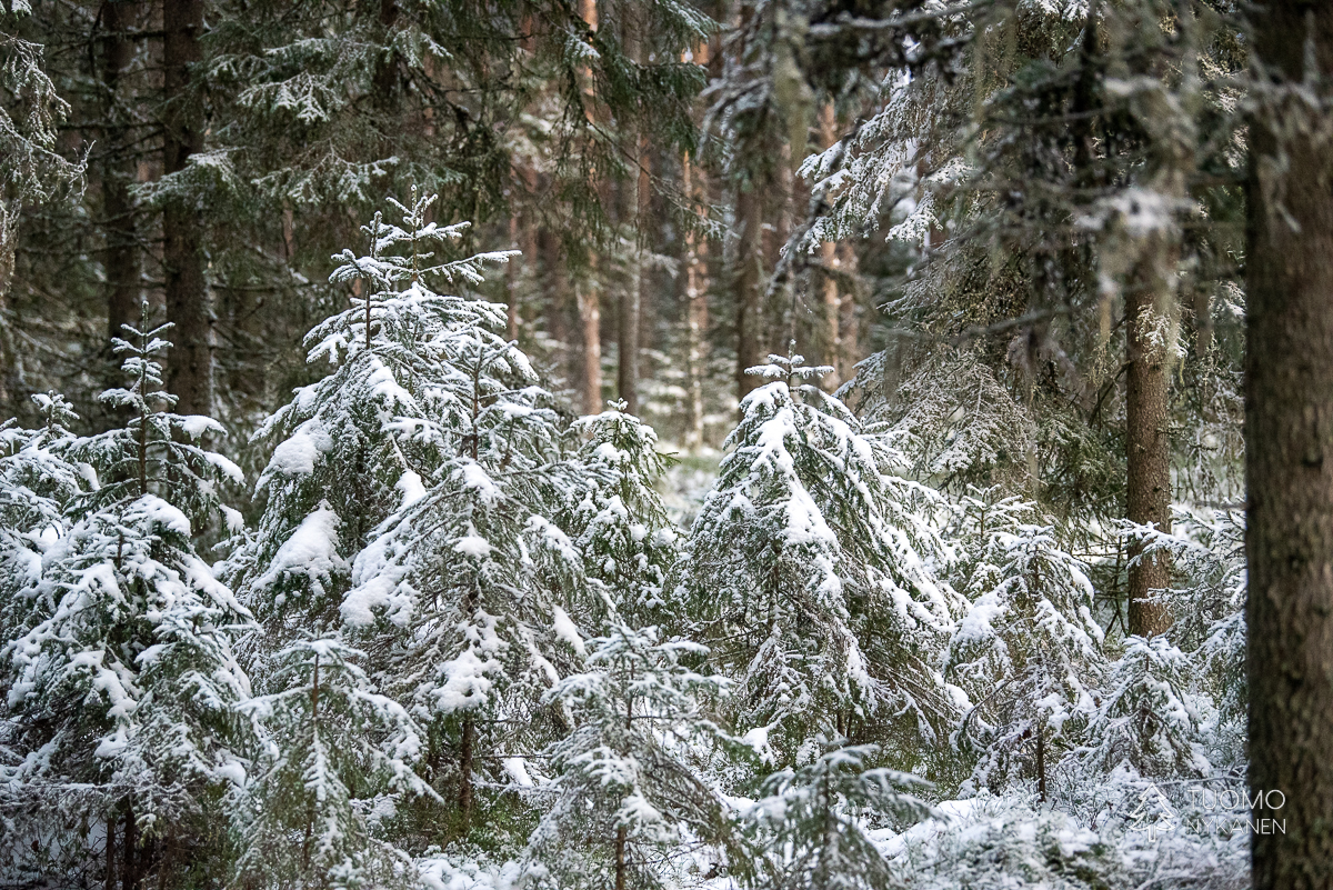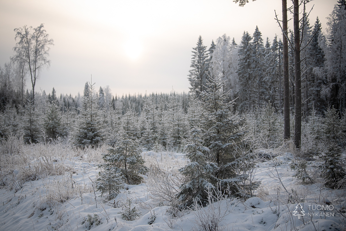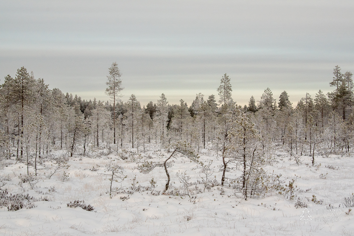 Keliä voisi myös sanoa ikäväksi mutta mieli on mukava, vapaapäivänä on aikaa eikä väsyttävä pohraaminen koskemattomassa lumessa haittaa kun palkinnoksi istuu hetken jään ja tulen välissä. Ennen kuin aurinko nousi käännyin moottoritieltä Lapakiston luonnonsuojelualuetta kohti vievälle pienemmälle tielle. Se kaartuu moottoritien ylitse johtavalle sillalle josta näki kuinka raskas rahti jyristi arkisesti menemään tummalla asfaltilla. Oma tie taas jatkuu syvemmälle metsään ja lumen määrä maassa sekä puissa kasvaa samaa vauhtia kuin tiet pienenevät.