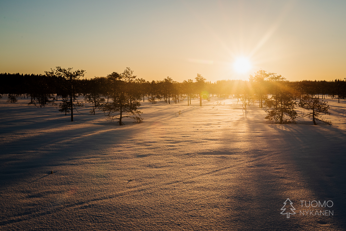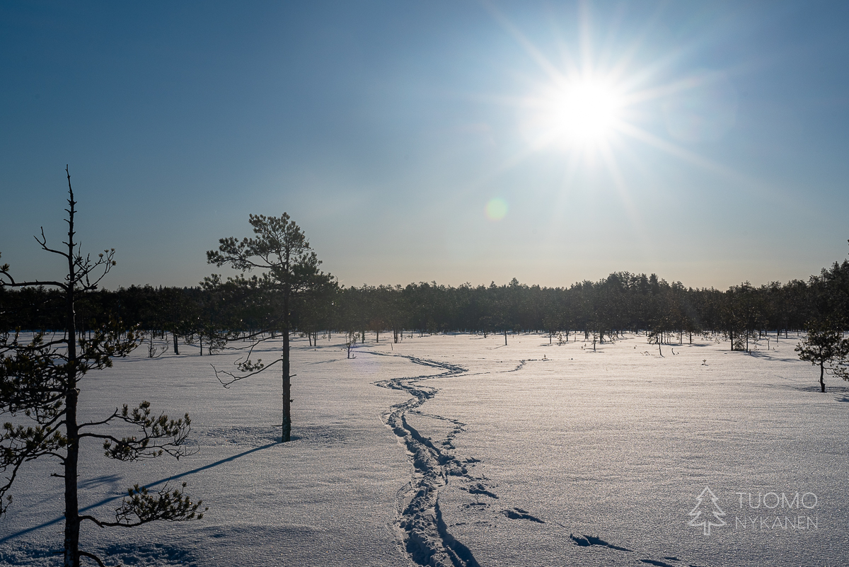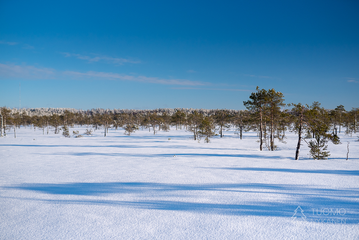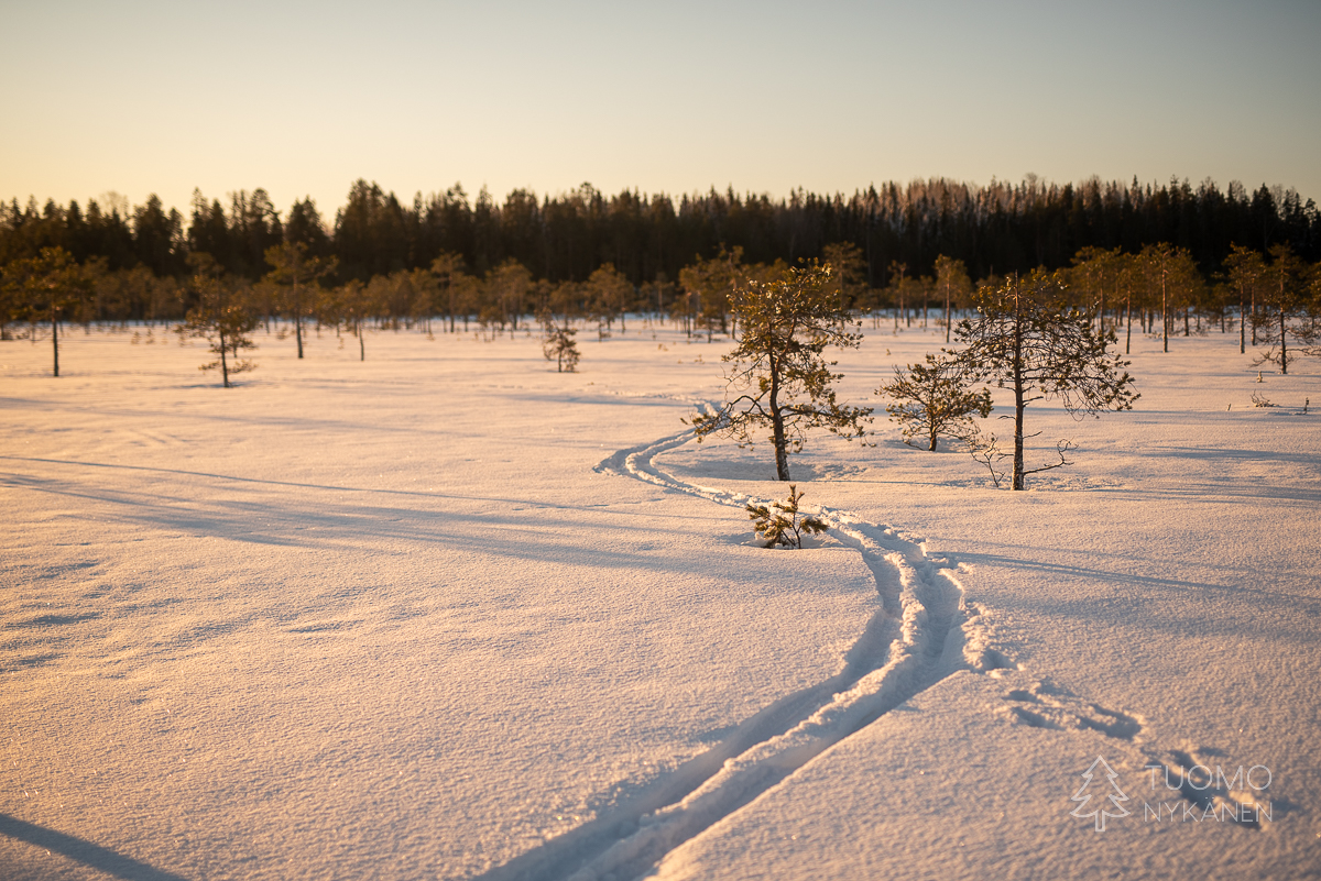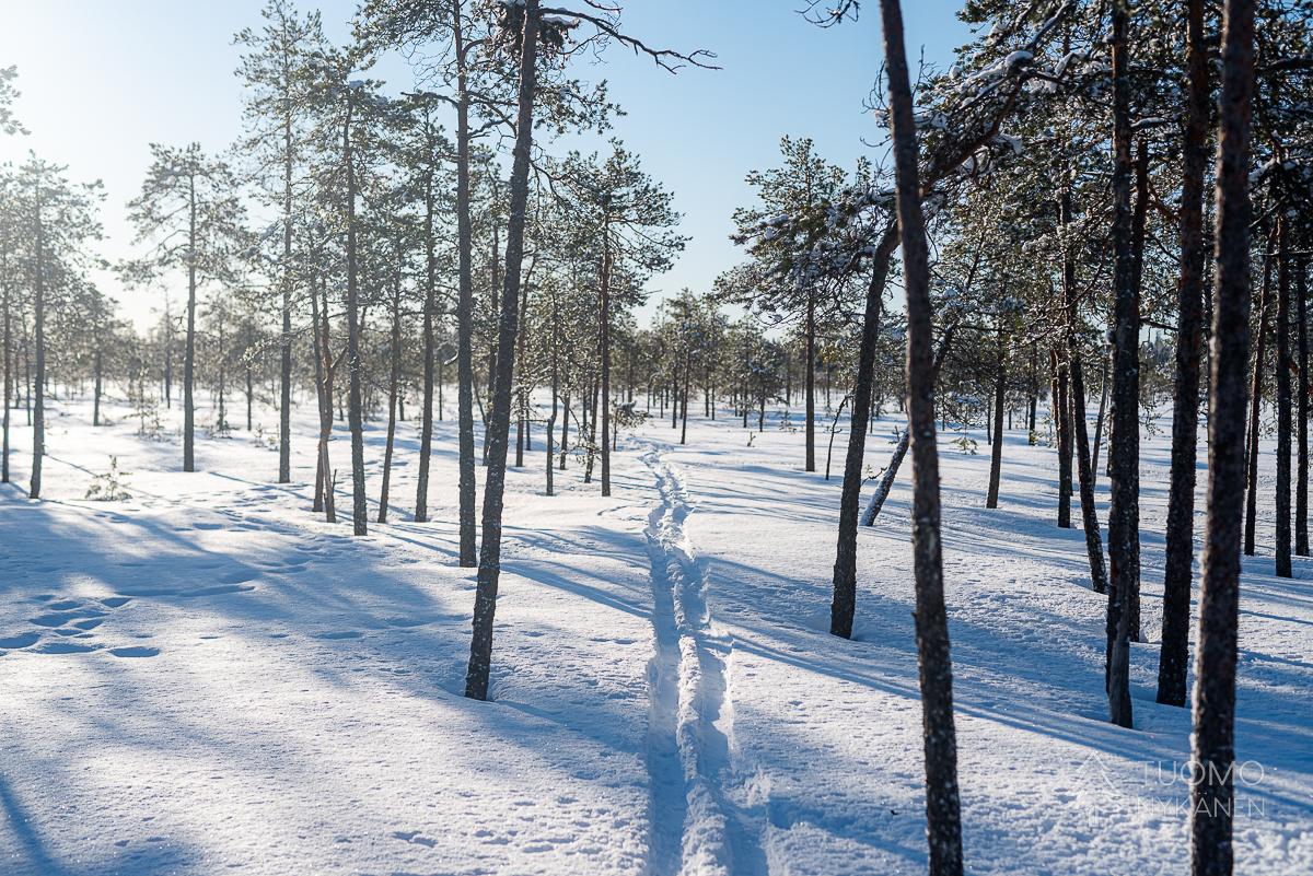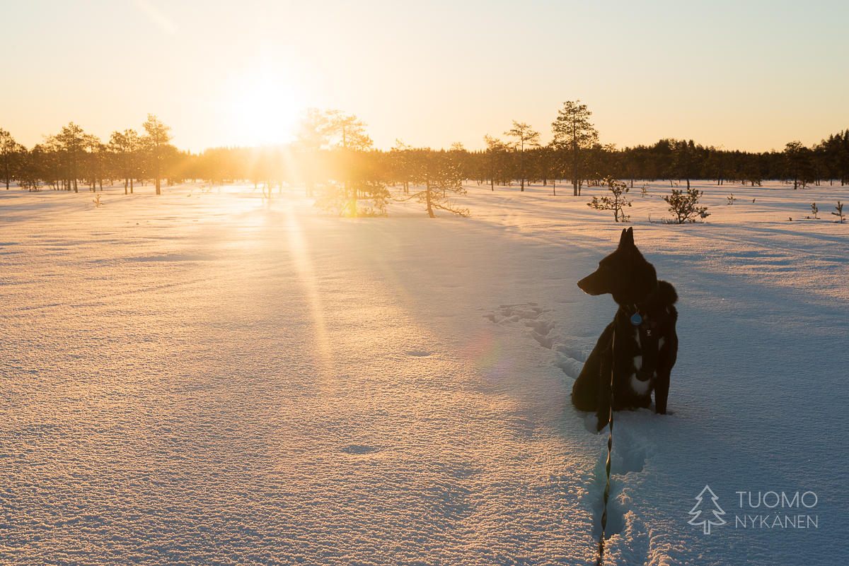 Alhaalla kurussa upottaa huolella, uppoan joka toisella askeleella lähes puoleen sääreen lumikengistä huolimatta. Lumen pinta on koppura, joka antaa vastusta askeleille, mutta pintakuoren alla onkin pehmeää puuterilunta. Tuomo on jo hiihdellyt seuraavalle laelle, kun itse lähden nousemaan. Tuulensuojan puolella rinne on myös pehmeää ja horjahdan jo toistamiseen nurin. Koira ryntää juosten luokse hihna perässään katsomaan miksi ryömin lumessa. Tuomo tyytyy nauraen kuvaamaan taisteluani laelta. Ihmeen kaupalla saan itseni pungettua jälleen jalkeilleni, ja jatkamaan matkaa.