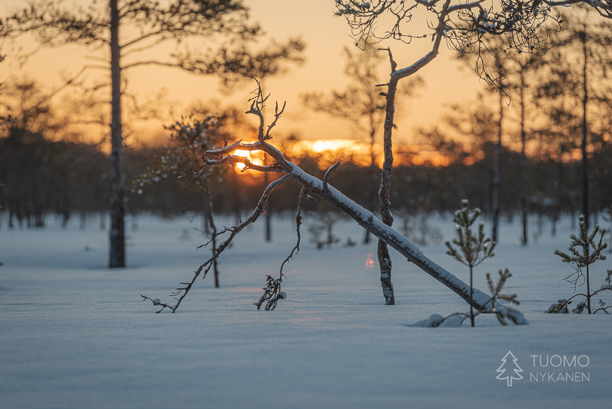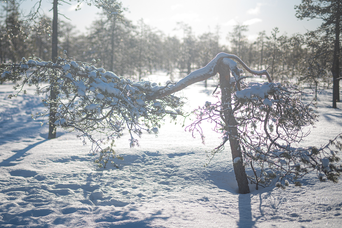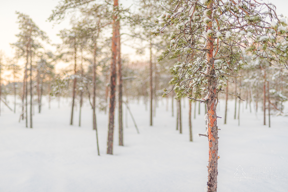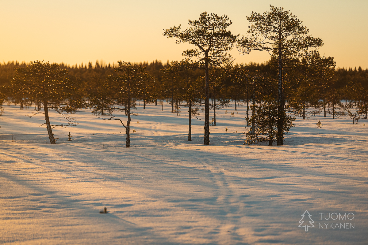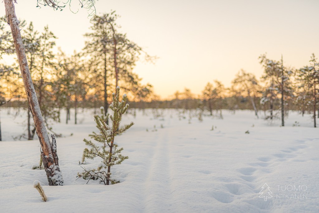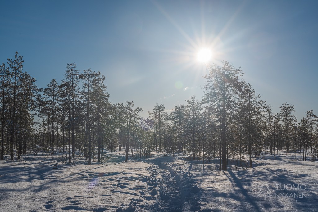 Alhaalla kurussa upottaa huolella, uppoan joka toisella askeleella lähes puoleen sääreen lumikengistä huolimatta. Lumen pinta on koppura, joka antaa vastusta askeleille, mutta pintakuoren alla onkin pehmeää puuterilunta. Tuomo on jo hiihdellyt seuraavalle laelle, kun itse lähden nousemaan. Tuulensuojan puolella rinne on myös pehmeää ja horjahdan jo toistamiseen nurin. Koira ryntää juosten luokse hihna perässään katsomaan miksi ryömin lumessa. Tuomo tyytyy nauraen kuvaamaan taisteluani laelta. Ihmeen kaupalla saan itseni pungettua jälleen jalkeilleni, ja jatkamaan matkaa.