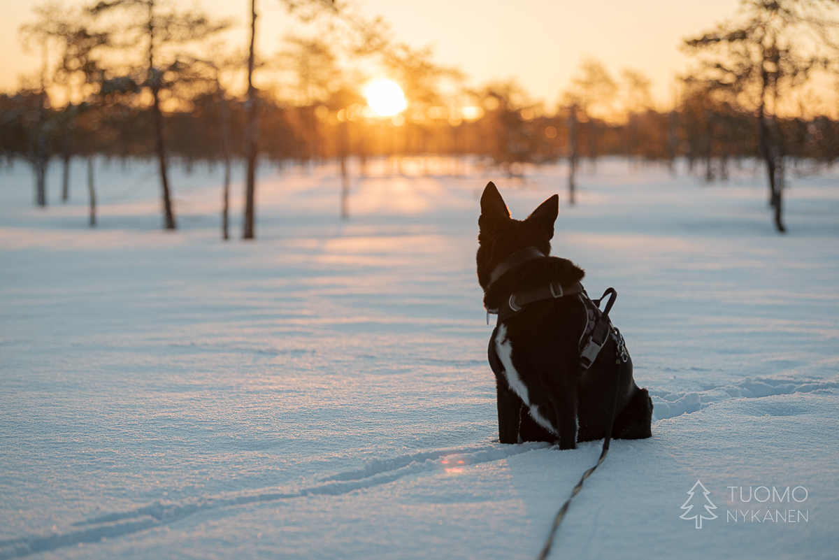 Koira spurttailee alkuun päättömästi, se on niin innoissaan, kun koko perhe on lähdössä lenkille. Pian senkin suurin into taittuu, kun se uppoaa riittävän monta kertaa lumeen mahaansa myöten, ja se siirtyy seuraamaan Tuomon suksenjälkiä.