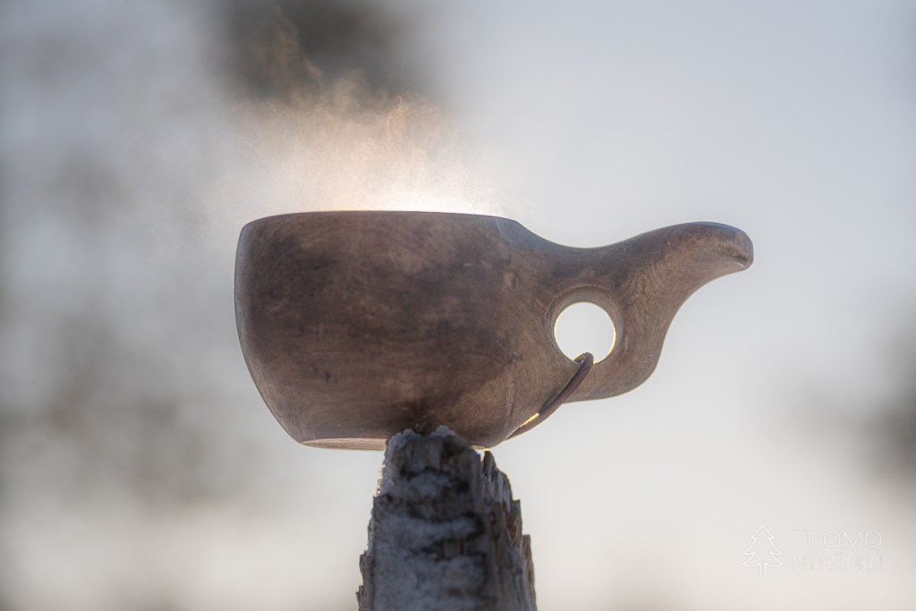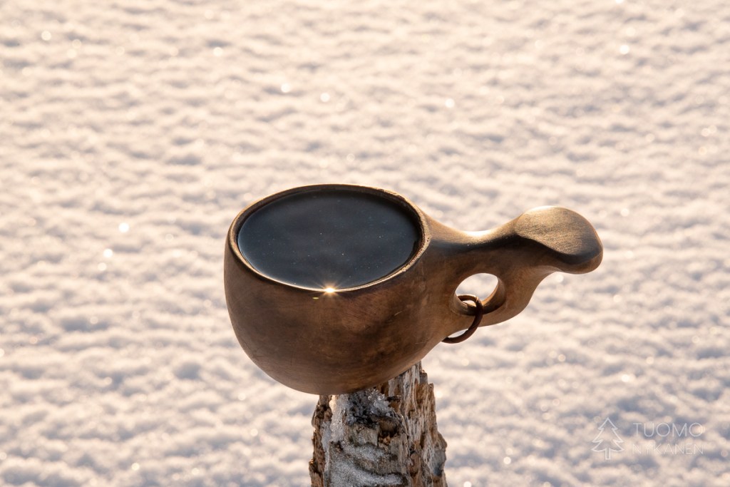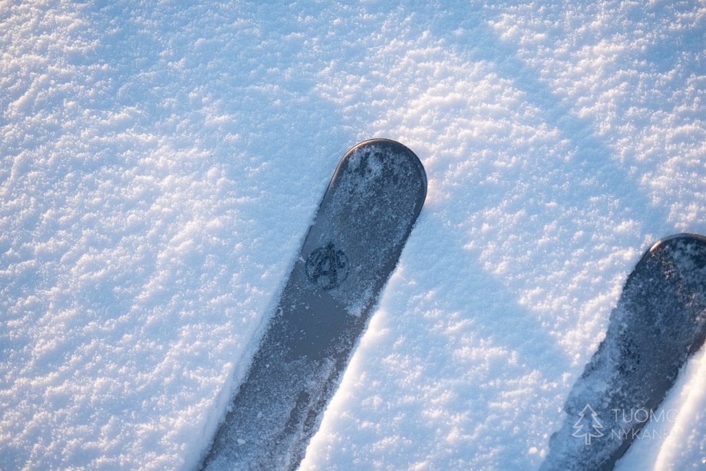 Kodan piirtyessä uudelleen näkyviin näen myös jonkin moottorikelkan suuntaavan kohti kotaa ja pian näkyviin piirtyy myös toinen, kolmas, neljäs… Suunnatonta turistilaumaa paimennetaan kohti Pulmankijärveä kuin porotokkaa konsanaan, ainoana erona toki että nämä porot pääsevät moottorikelkan kyydissä. He näyttäisivät pysähtyvän järven jäälle ja jäävän siihen puuhastelemaan jotain, valitettavasti en voikaan lasketella viimeistä mäkeä vauhdilla vaan joudun nappaamaan Yoshin jälkiliinasta kiinni ettei poju vahingossa säikähdä joukkion puuhia ja päätä lähteä elämään elämäänsä Kaldoaivissa. Joukkiossa monen katseet tuntuvat seuraavan lasketteluamme heitä kohti, eivät hekään varmaan ole ajatelleet että täällä joku tulisi yksinään hiihdellen vastaan. Irrotan sukset oven ulkopuolelle hankeen ja astun sisään jo lämmenneeseen kotaan, jossa tuoksuu lämmin ruoka ja kahvin kutsuva tuoksu.