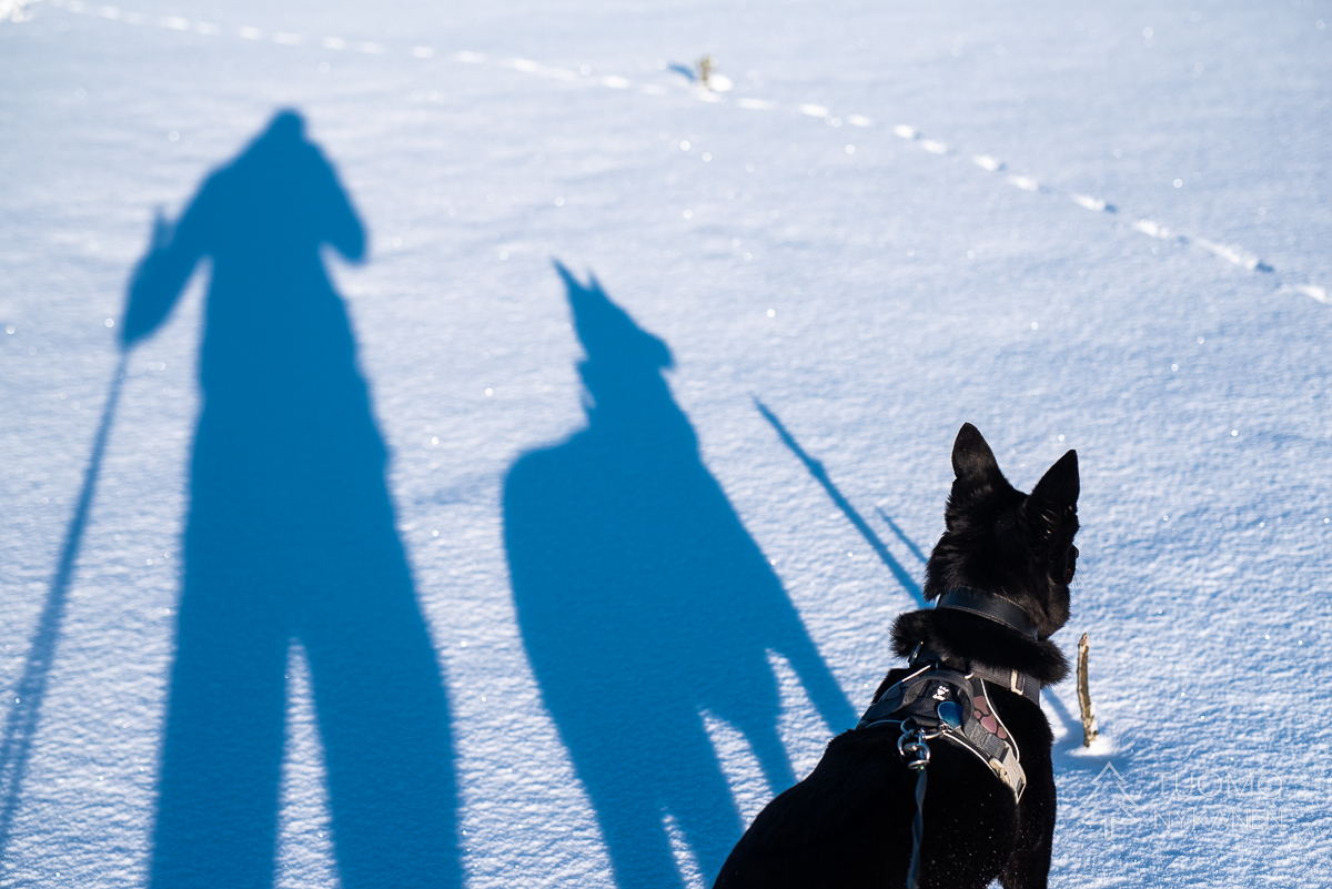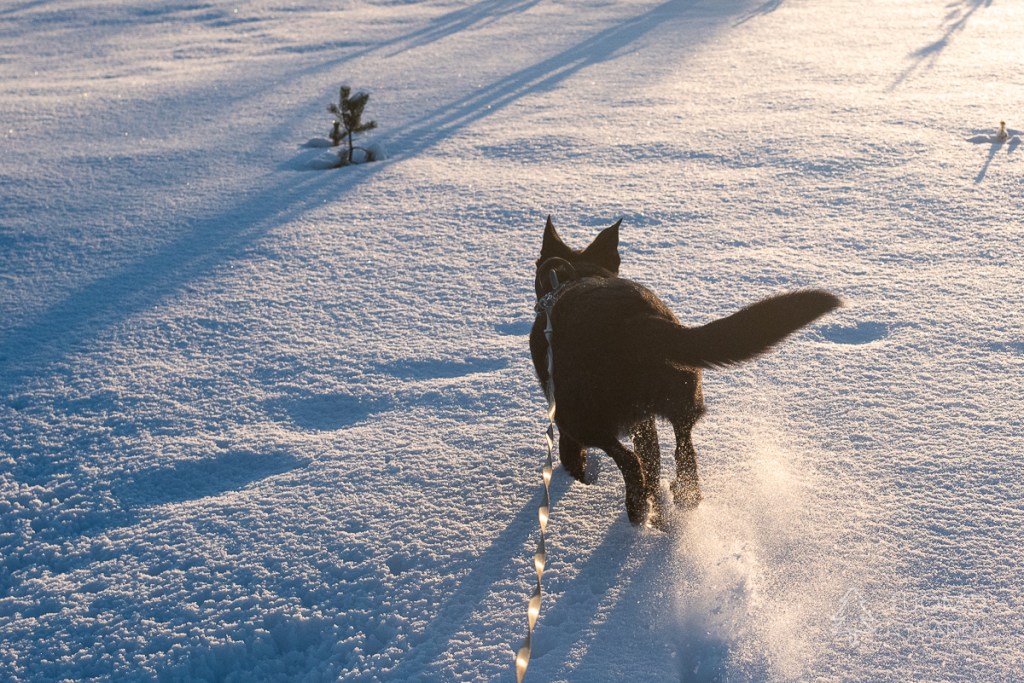 En halua turhaan nousta ylös auton luokse vain heti laskeakseni sieltä takaisin, nyt täytyy vain luottaa että Tiina pääsee turvallisesti autolle. Yoshi ei oikein ymmärrä kun nappaan sen hihnasta kiinni ja vedän itseni kanssa samaan suuntaan. En ole varma onko poika enemmän huolissaan siitä, että mamma kulkee nyt väärään suuntaan vai olisiko se vain valmis jo vaihtamaan lumessa tarpomisen lämpimässä autossa makoiluun. Pian Yoshi kuitenkin ymmärtää, että tälle reissulle jatkamme vain kahdestaan ja se yrittää siirtyä edelle johtamaan letkaa. Valinta joka näyttää kaduttavan piakkoin, kun lumi ei tahdokaan kantaa. Tassut uppoavat kerta toisensa jälkeen lumeen ja usein koko koira kellahtaa perässä niin että vain korvat vilkkuvat hangen yllä kun tassut hakevat paikkaa nousta takaisin hangen päälle. Vähän aikaa yritettyään poika päättää ottaa paikkansa letkan perimmäisenä, jossa suksien ja ahkion auraama jälki tarjoaa hieman helpomman kulkuväylän.