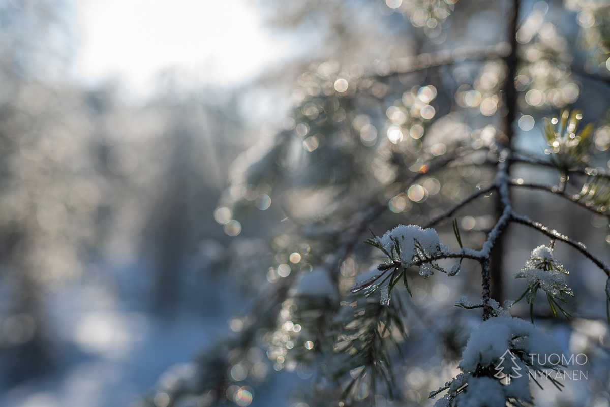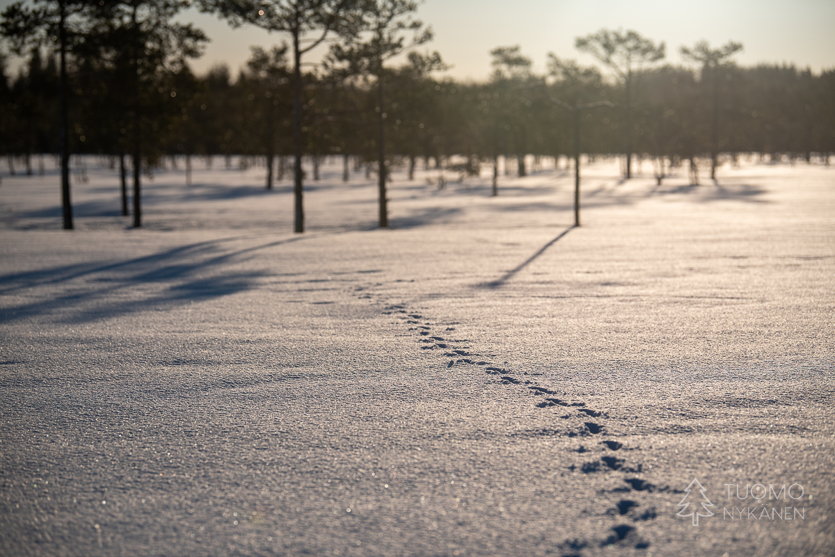 Kipsuttelen jäisen tien yli lumikengillä. Muoviset nastaosat eivät pure ja otan lyhyitä askeleita, jotten liukastu kumoon. ”Meidän pitää varmaan mennä vähän eri reittejä, on liian jäistä liukkareille” Tuomo sanoo ja kiinnittää liukulumikenkiensä siteitä talvisaappaisiinsa.