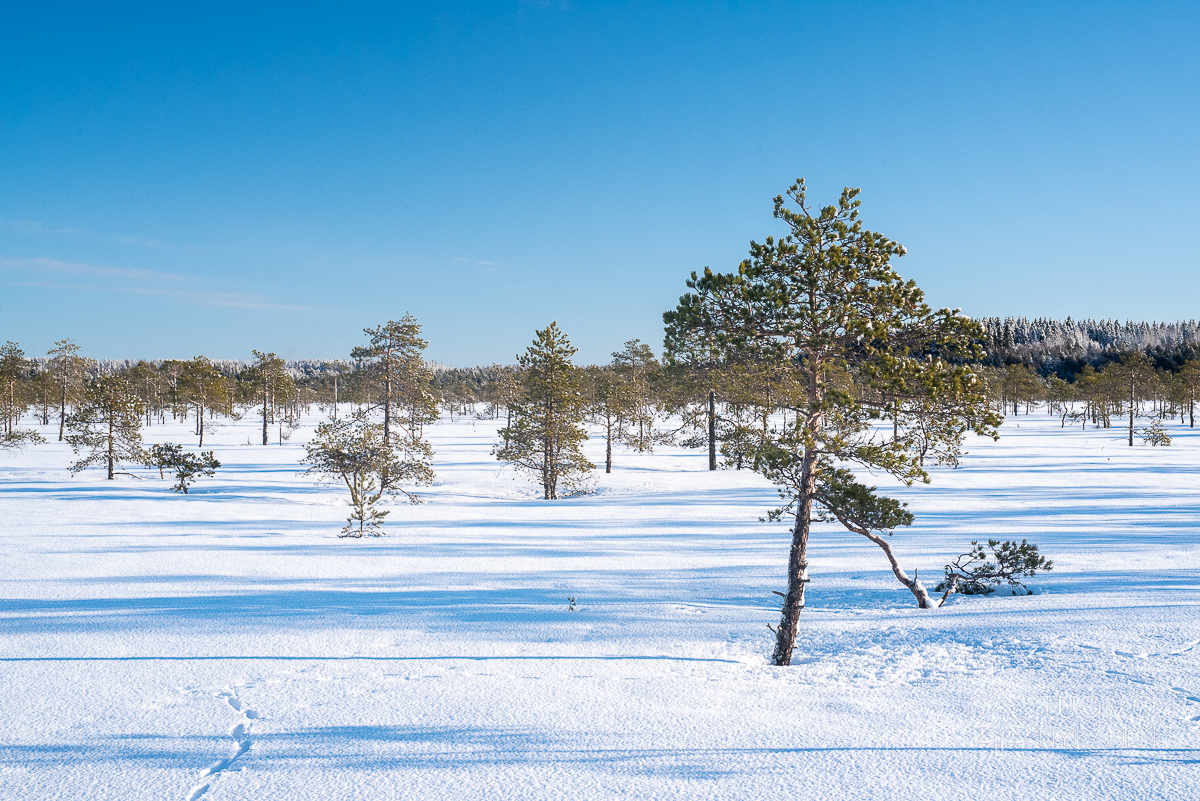 Tuuli on voimistunut ja tuiskuttaa lunta silmälaseihin asti, kuorruttaa pipon alta pilkistävät hiukset lumella. Otan rinteestä kiintopisteeksi puurykelmän, jotta varmasti nousen oikeaa suuntaa kohti enkä joudu palailemaan pitkästi autoa kohti. Oikean jalan lumikenkä tuntuu löysältä – voihan kökkö, se on irtoamaisillaan, en ole kiristänyt takaremmiä tarpeeksi tiukalle. Yritän työntää kenkääni pidemmälle lumikengän kiinnitysmekanismissa, mutta ei se luista kunnolla. Yhdellä jalalla seisten en saa sitä laitettua kunnolla. Haravoin katseellani rinteestä sopivaa kiveä, johon istahtaa, mutta kaikki näyttävät liian matalilta – olisi vaikea nousta sieltä ylös nivelrikkoisella polvellani ja pahimmassa tapauksessa saattaisin horjahtaa pahasti kumoon yrittäessäni. Nyt kun Tuomo on jatkanut matkaansa, en halua ottaa sitä riskiä, etten saisikaan itseäni pyllerrettyä sieltä ylös. Niinpä tiukkaan päällisremmin niin tiukalle kuin suinkin ja päätän mennä varoen, matka ei onneksi ole enää pitkä.
