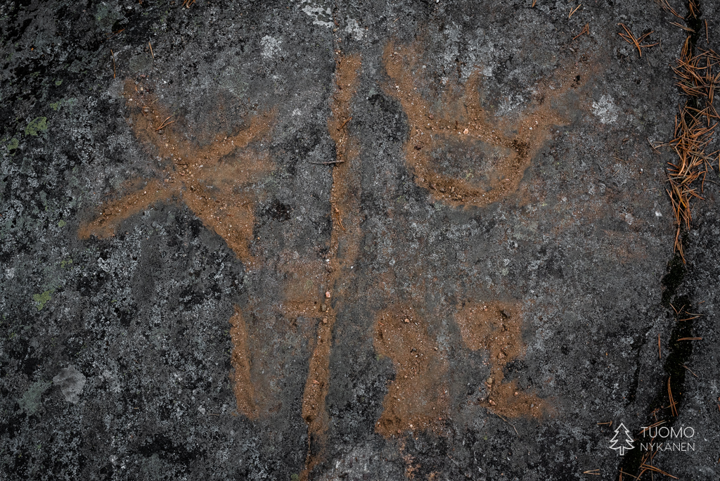 Uudenkaupungin rauhan rajamerkintä 300 vuoden takaa. Keskellä rajaviiva ja vasemmalla Venäjän risti sekä oikealla puolella Ruotsin kruunu. Alla vuosiluku 1722. Etelä-Karjalan korkeimpana paikkana kohta on kyllä hyvin ymmärrettävä ja selkeä rajapaikka.