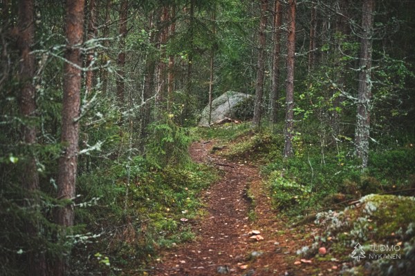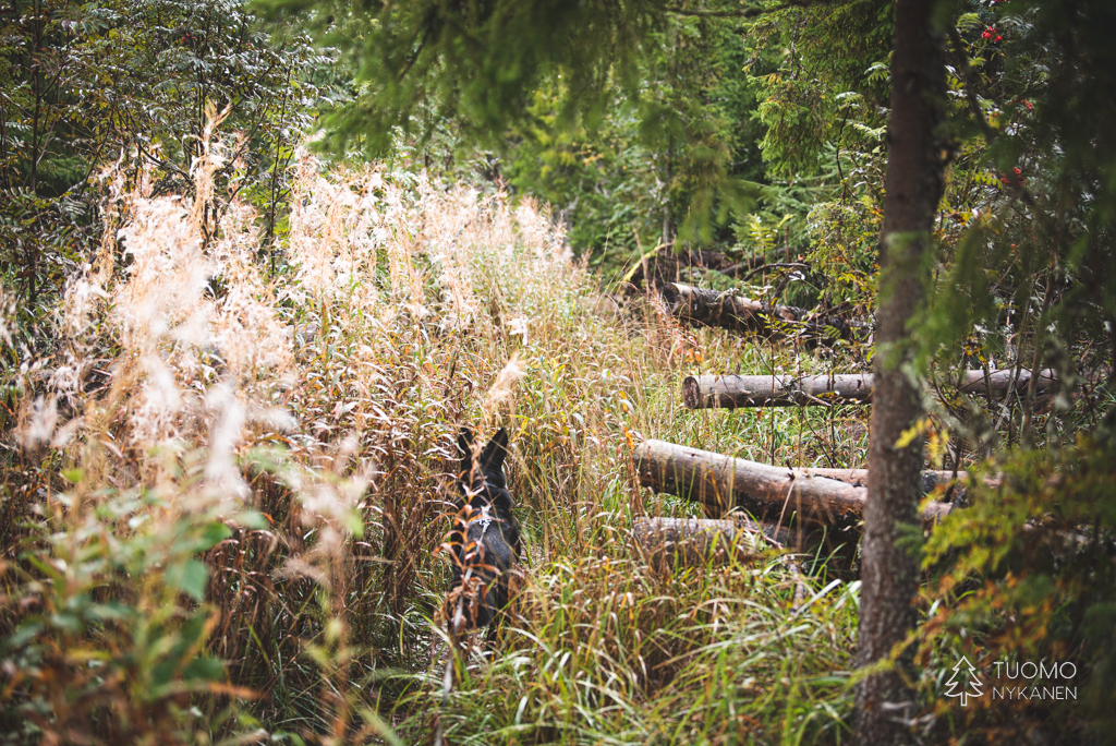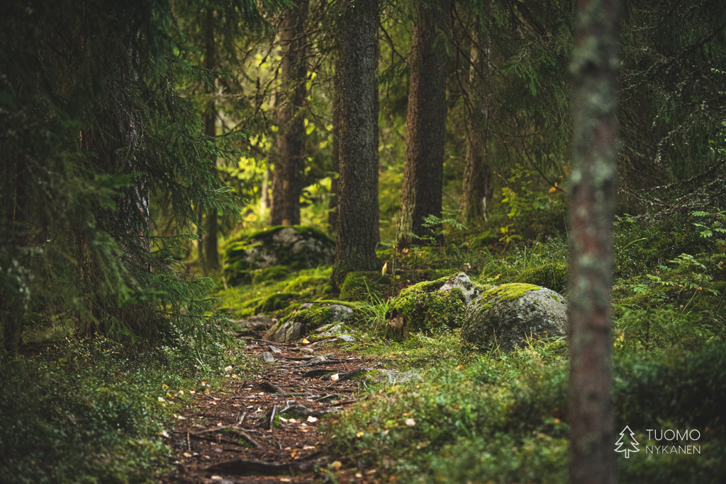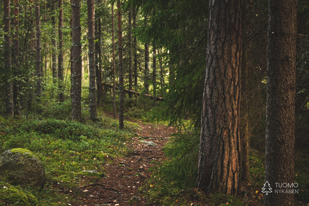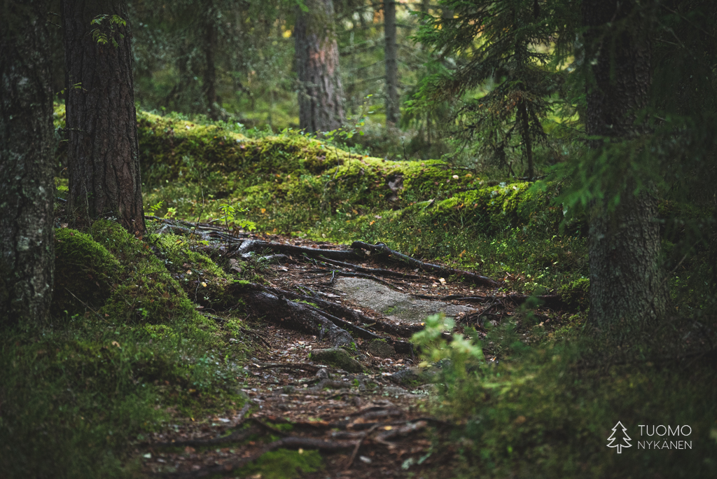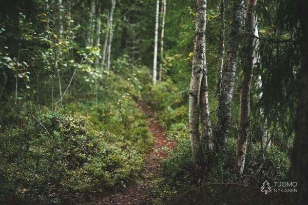 Täällä polku on vaarassa hukkua tiheämmän kasvuston alle eikä pitkät lahkeet olisi haitaksi tällä osuudella.