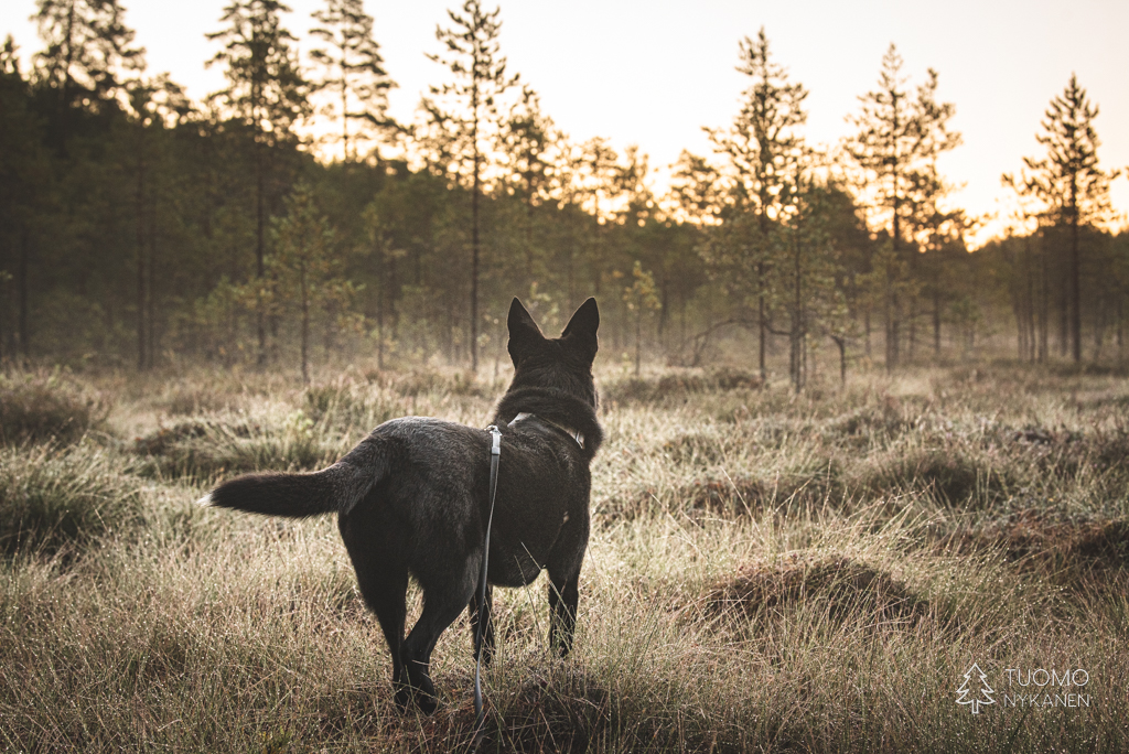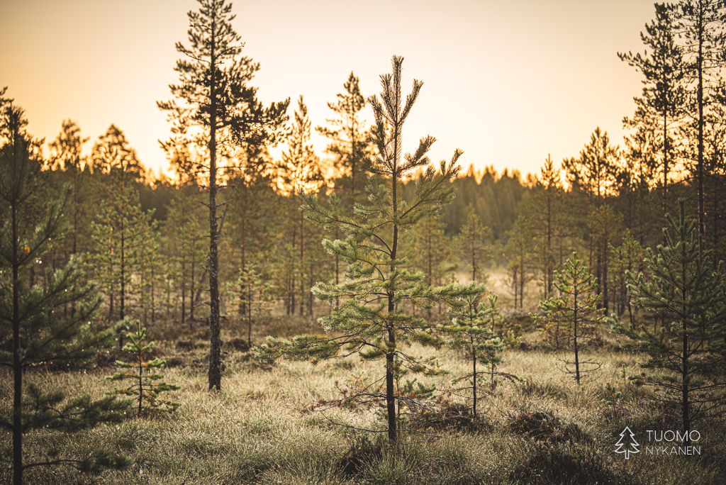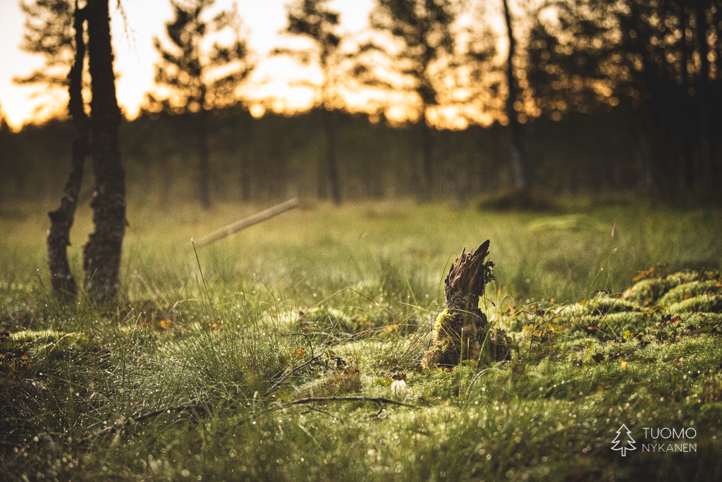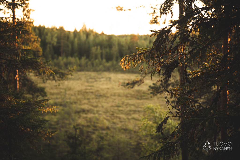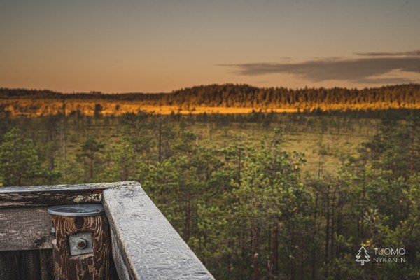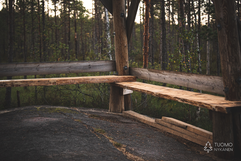 Tornin alapuolella kolme suurta lankkupenkkiä ja tornin vieressä pöytä evästelyyn. Ylhäältä näkee kattavasti koko suon ylitse ja syksyn tietämillä aurinko taitaa laskea kutakuinkin suon toiselle puolelle.