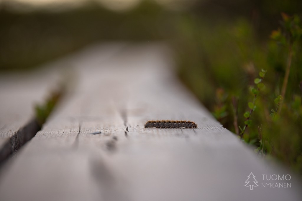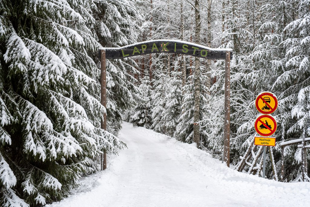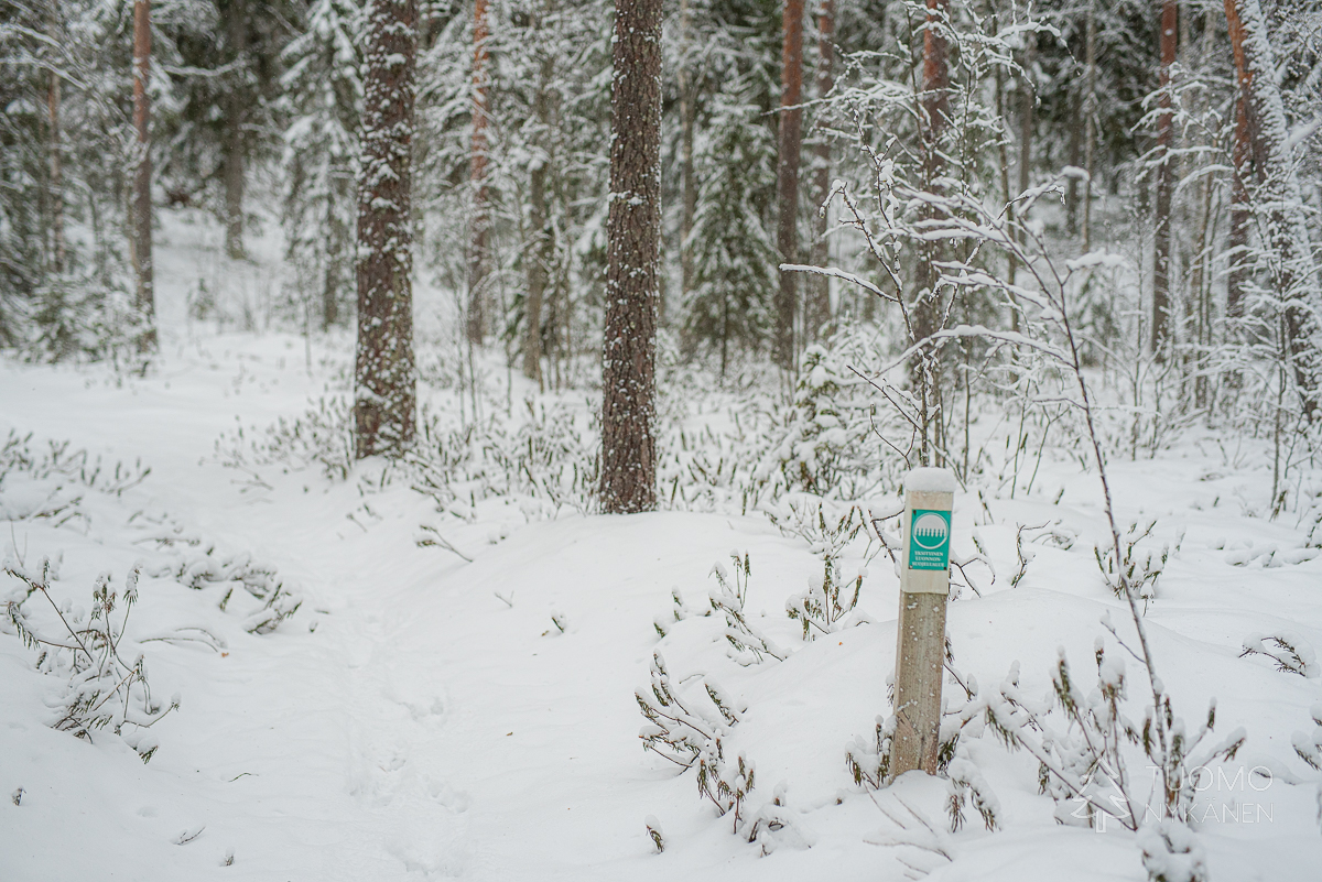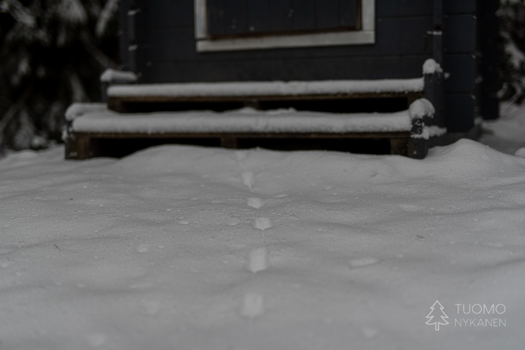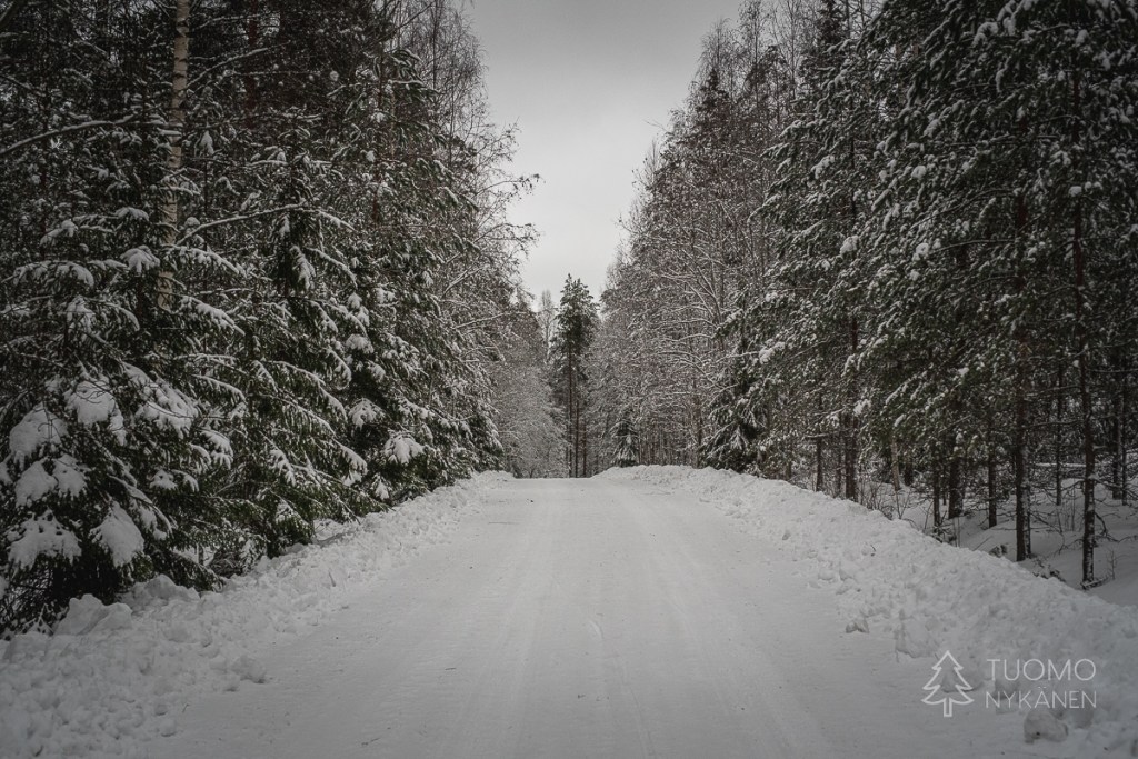 Kipsuttelen jäisen tien yli lumikengillä. Muoviset nastaosat eivät pure ja otan lyhyitä askeleita, jotten liukastu kumoon. ”Meidän pitää varmaan mennä vähän eri reittejä, on liian jäistä liukkareille” Tuomo sanoo ja kiinnittää liukulumikenkiensä siteitä talvisaappaisiinsa.