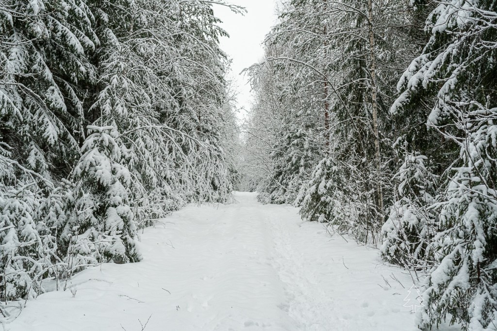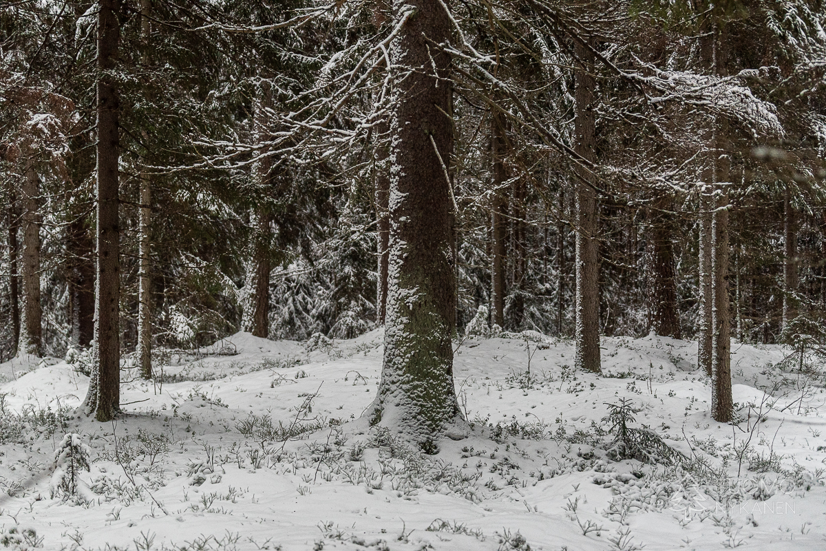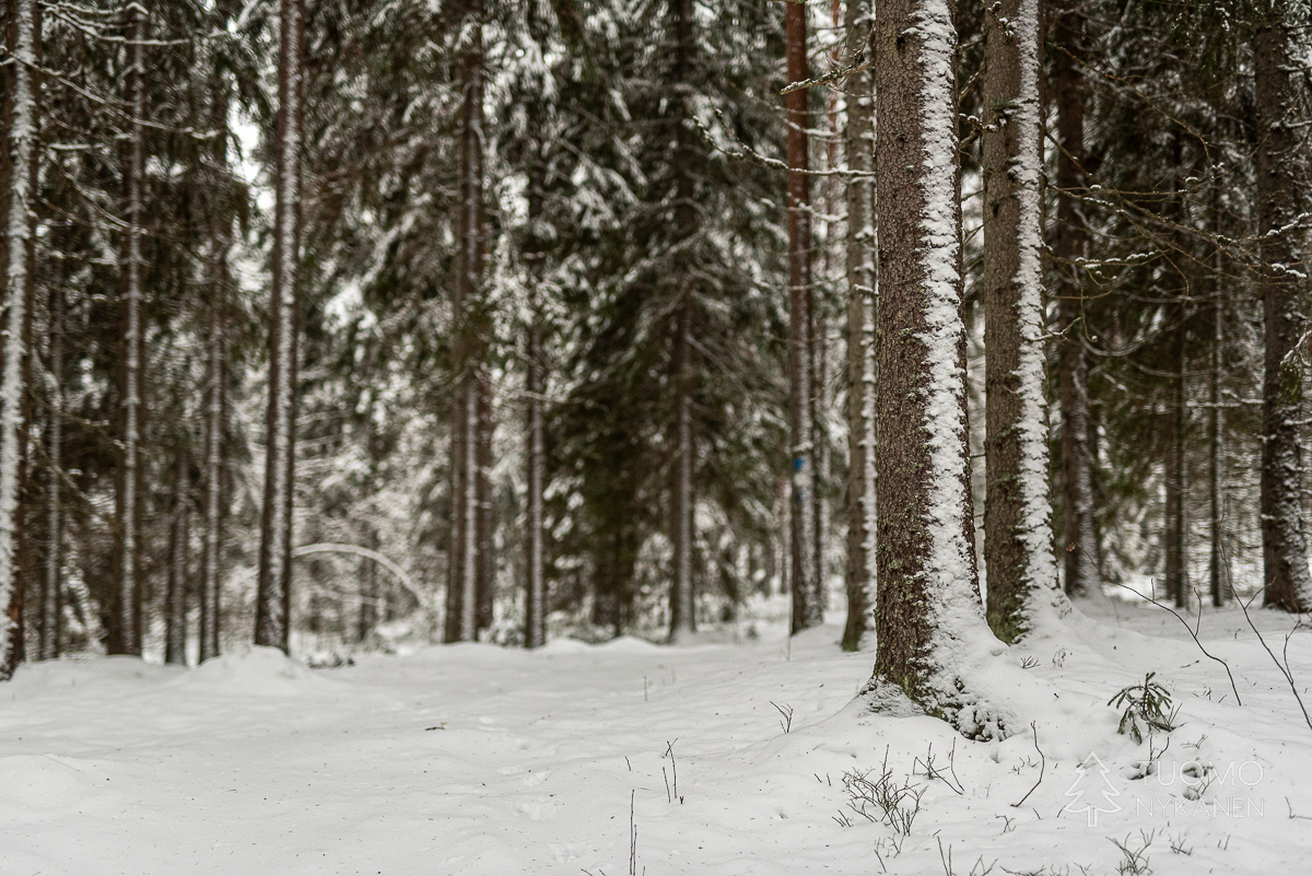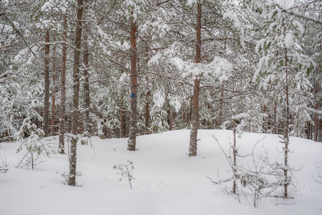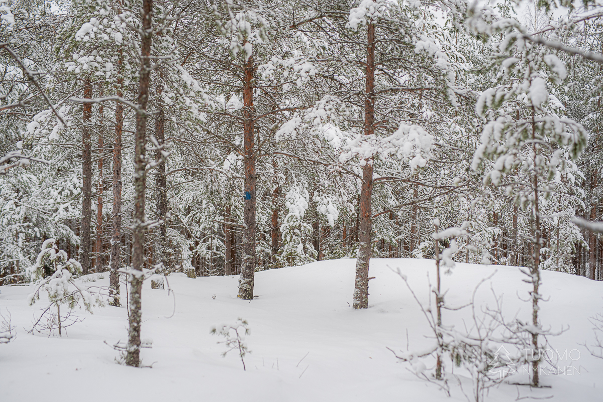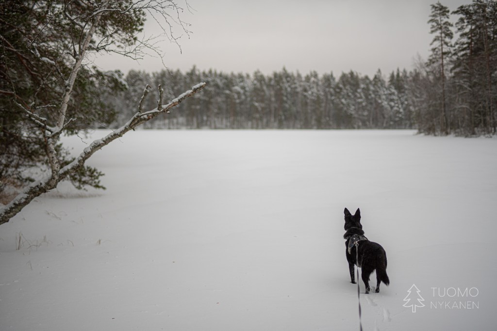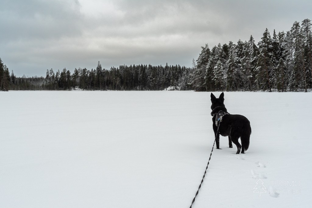 Alhaalla kurussa upottaa huolella, uppoan joka toisella askeleella lähes puoleen sääreen lumikengistä huolimatta. Lumen pinta on koppura, joka antaa vastusta askeleille, mutta pintakuoren alla onkin pehmeää puuterilunta. Tuomo on jo hiihdellyt seuraavalle laelle, kun itse lähden nousemaan. Tuulensuojan puolella rinne on myös pehmeää ja horjahdan jo toistamiseen nurin. Koira ryntää juosten luokse hihna perässään katsomaan miksi ryömin lumessa. Tuomo tyytyy nauraen kuvaamaan taisteluani laelta. Ihmeen kaupalla saan itseni pungettua jälleen jalkeilleni, ja jatkamaan matkaa.