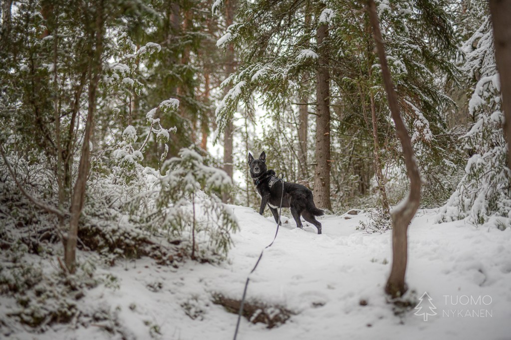 Koira spurttailee alkuun päättömästi, se on niin innoissaan, kun koko perhe on lähdössä lenkille. Pian senkin suurin into taittuu, kun se uppoaa riittävän monta kertaa lumeen mahaansa myöten, ja se siirtyy seuraamaan Tuomon suksenjälkiä.