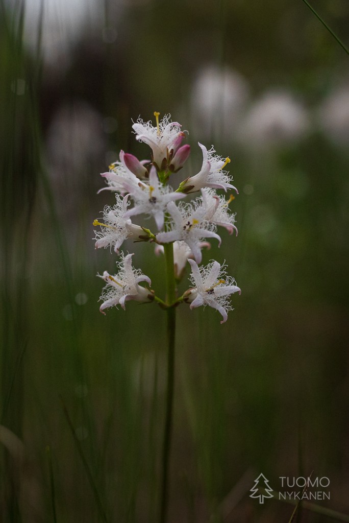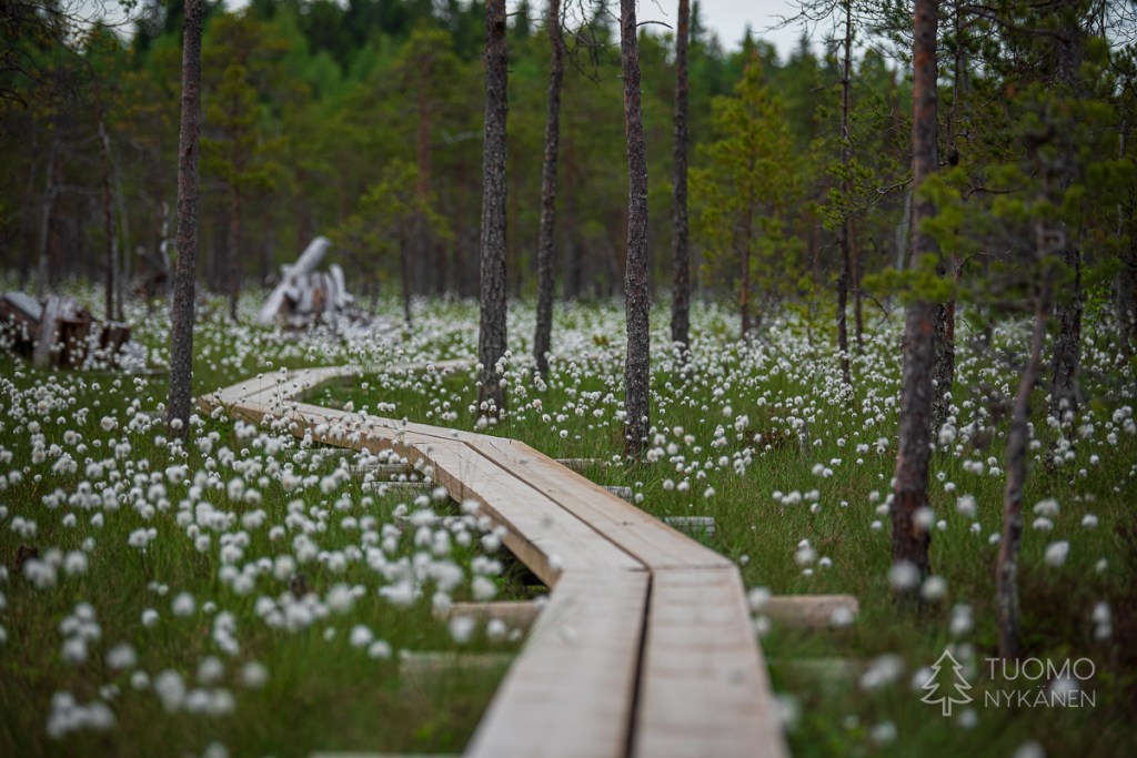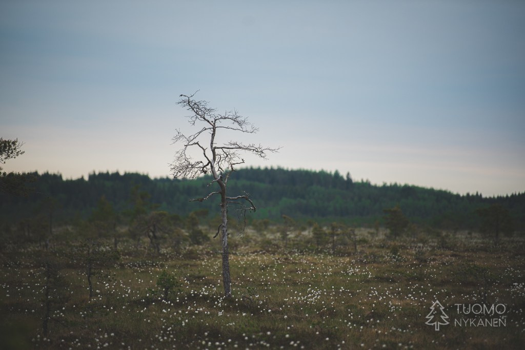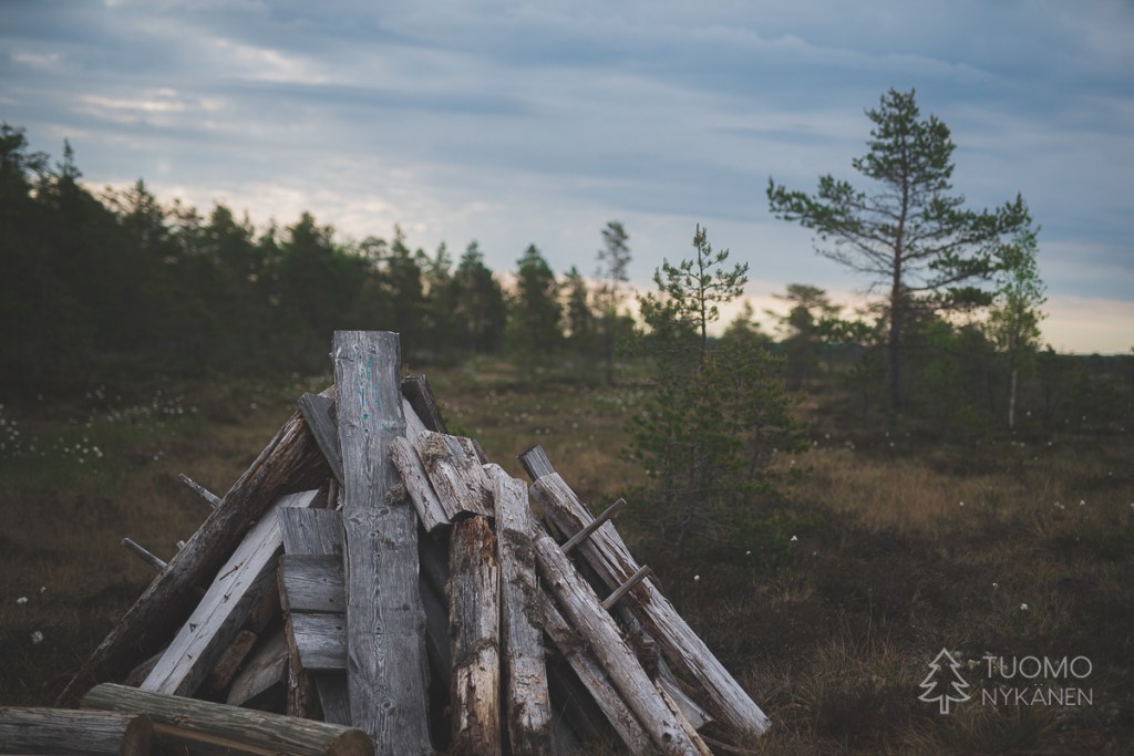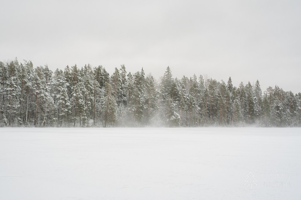 Tuuli on voimistunut ja tuiskuttaa lunta silmälaseihin asti, kuorruttaa pipon alta pilkistävät hiukset lumella. Otan rinteestä kiintopisteeksi puurykelmän, jotta varmasti nousen oikeaa suuntaa kohti enkä joudu palailemaan pitkästi autoa kohti. Oikean jalan lumikenkä tuntuu löysältä – voihan kökkö, se on irtoamaisillaan, en ole kiristänyt takaremmiä tarpeeksi tiukalle. Yritän työntää kenkääni pidemmälle lumikengän kiinnitysmekanismissa, mutta ei se luista kunnolla. Yhdellä jalalla seisten en saa sitä laitettua kunnolla. Haravoin katseellani rinteestä sopivaa kiveä, johon istahtaa, mutta kaikki näyttävät liian matalilta – olisi vaikea nousta sieltä ylös nivelrikkoisella polvellani ja pahimmassa tapauksessa saattaisin horjahtaa pahasti kumoon yrittäessäni. Nyt kun Tuomo on jatkanut matkaansa, en halua ottaa sitä riskiä, etten saisikaan itseäni pyllerrettyä sieltä ylös. Niinpä tiukkaan päällisremmin niin tiukalle kuin suinkin ja päätän mennä varoen, matka ei onneksi ole enää pitkä.