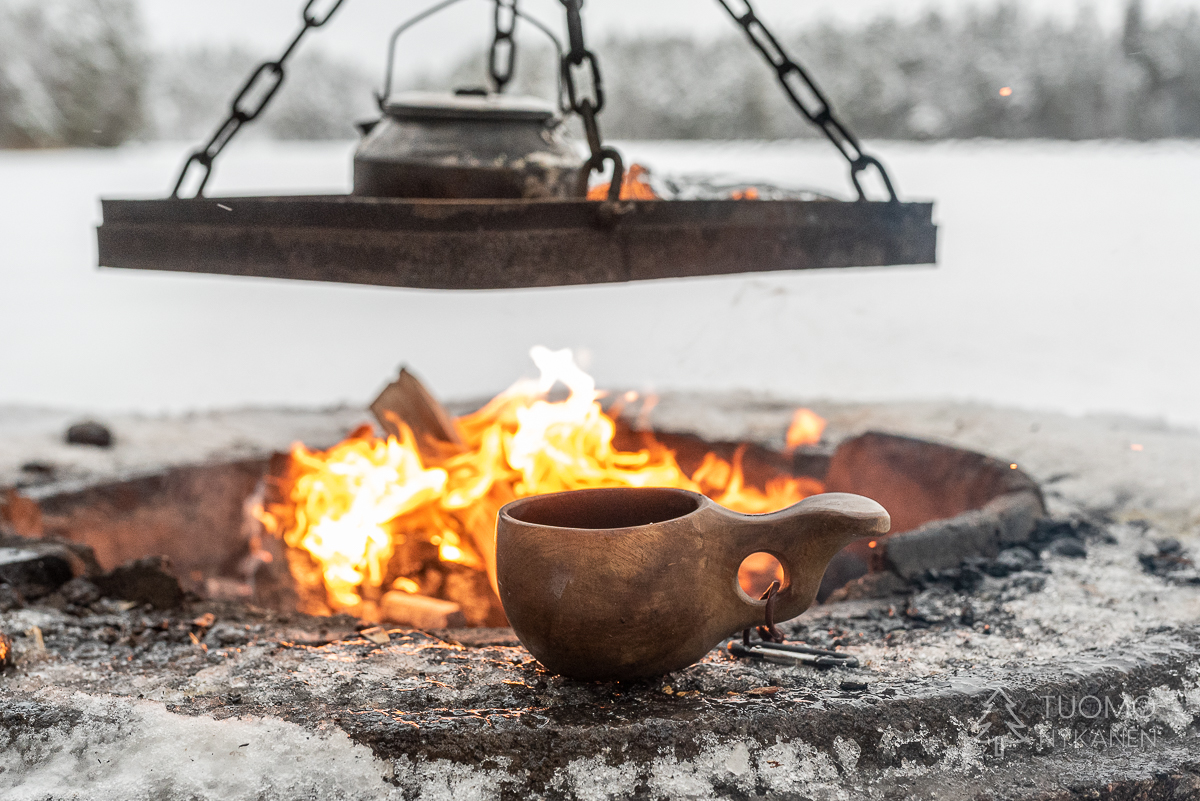Aukealla ennen Skaidijärven kotaa olen jälleen upoksissa lumikenkineni, mutta tällä kertaa pysyn pystyssä. Väsyneenä irrotan lumikengät, askel tuntuu keveältä ilman niitä. Kopistelen kotaan sisälle, jossa Tuomo on jo laittamassa kamiinaan tulia. Sen räiskyessä on mukava lämmitellä kohmeisia sormia ja venytellä, koira vilahtaa penkkien alle levolle hetkeksi. Ruuan valmistumista odotellessa Tuomo ja Yoshi lähtevät vielä tutkimaan ympäristöä hiihtäen.