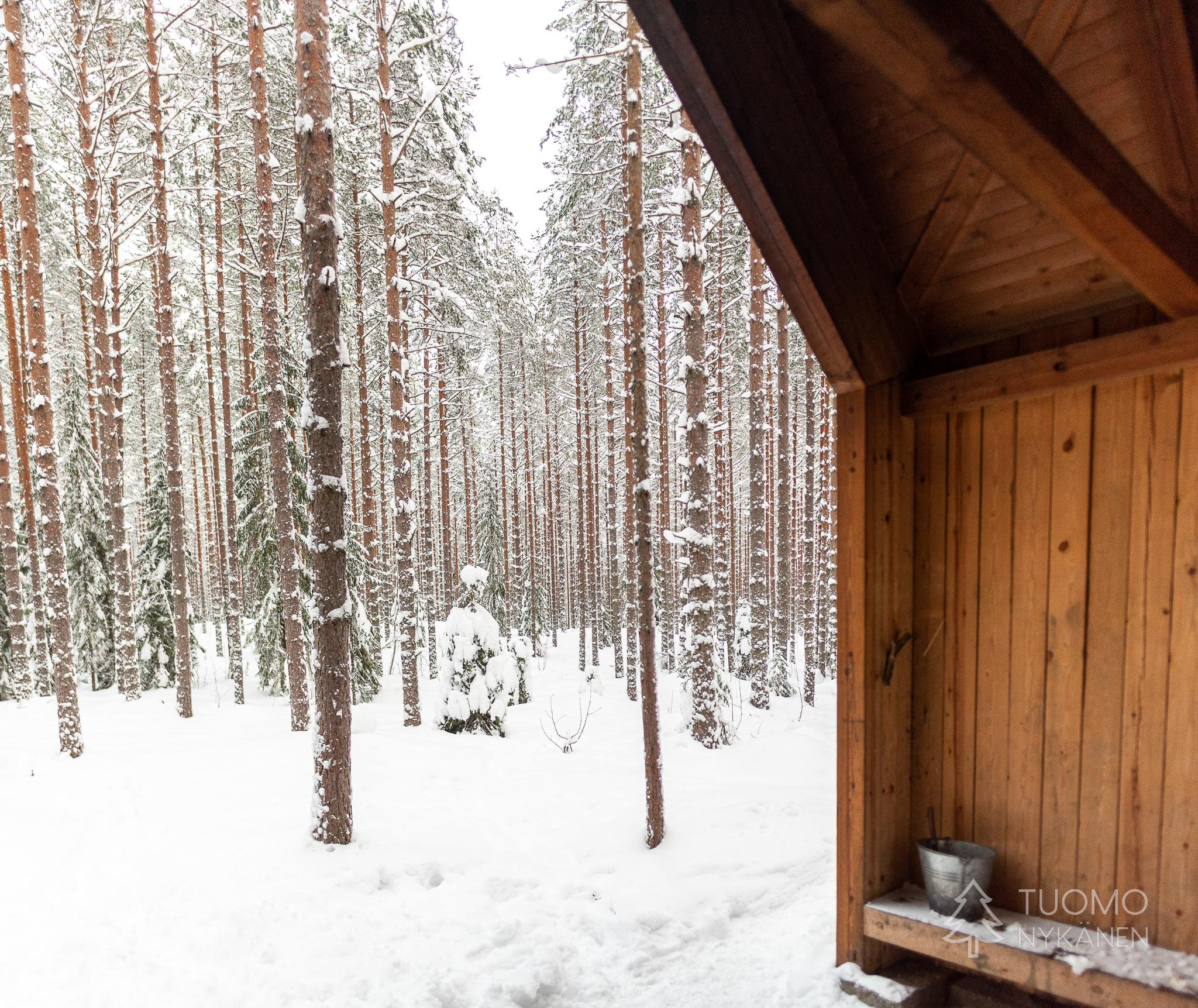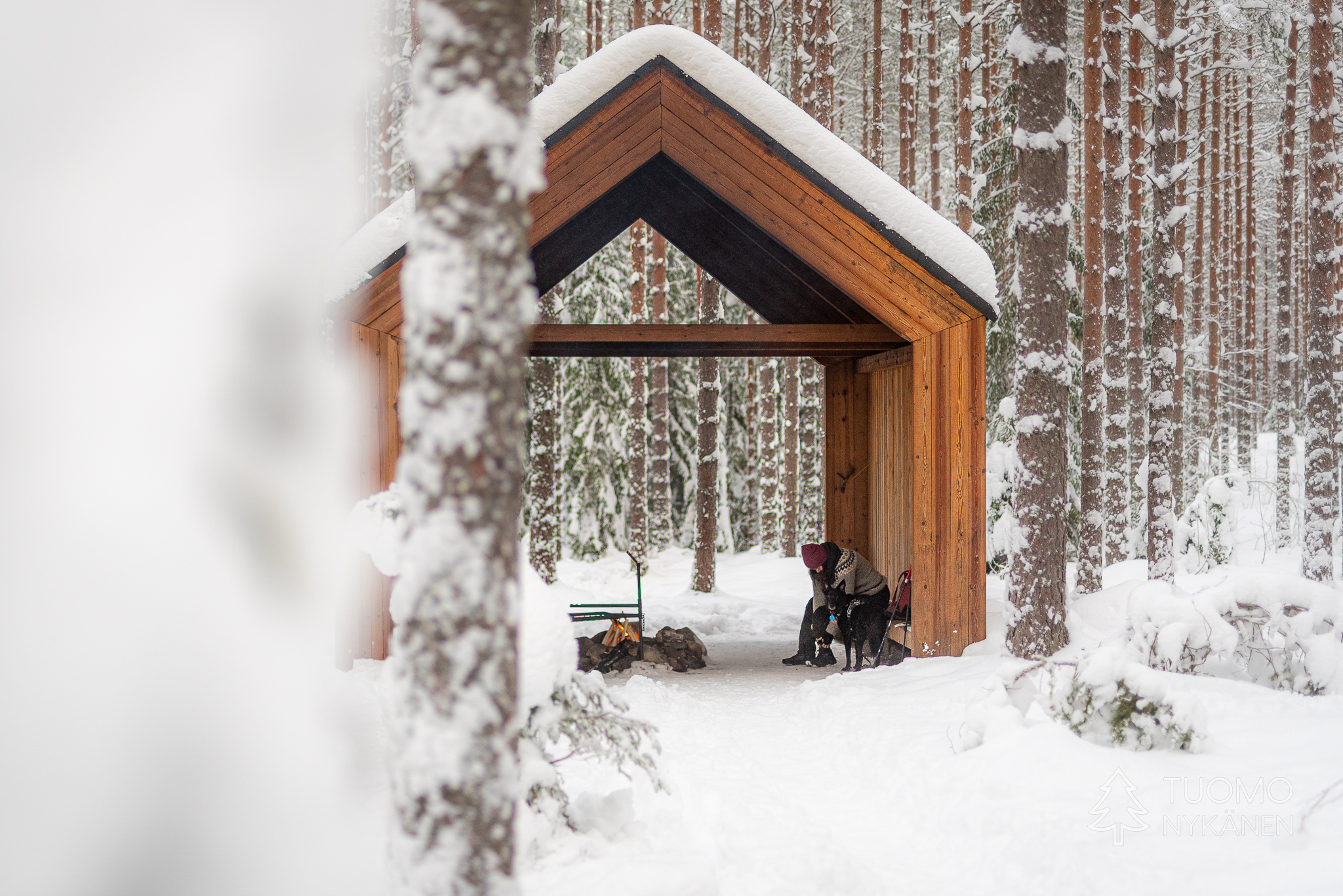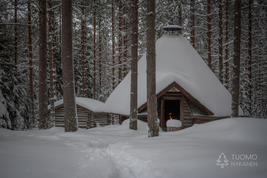 Näillä mailla kota ei ole loppujen lopuksi kovinkaan yllättävä näky mutta yleensä ne ovat hieman kevyemmin rakennettuja. Tämä taas on tukeva ja vielä nimetty, vieressään iso halkoliiteri ja huussi. Matkaa ei ole tieltä kovinkaan paljoa joten pohraan lumen halki katsomaan paikkaa tarkemmin. Alkuun jalka uppoaa syvälle mutta löytää lopulta jonkinlaista vanhaa polun pohjaa kinosten alta ja pääsen perille. Halkovajassa on kosteita jäätyneitä kalikkoja ja otan niistä pari. Nakattuani ne kodan sisälle käyn hakemassa autosta piilun jolla saan pienittyä halot syttyvän kokoisiksi. Uteliaisuus uusiin alueisiin ja paikkoihin kannatti tällä kertaa ja palkinnoksi saimme mahtavan tunnelmallisen paikan ruokailla ja kahvitella.
