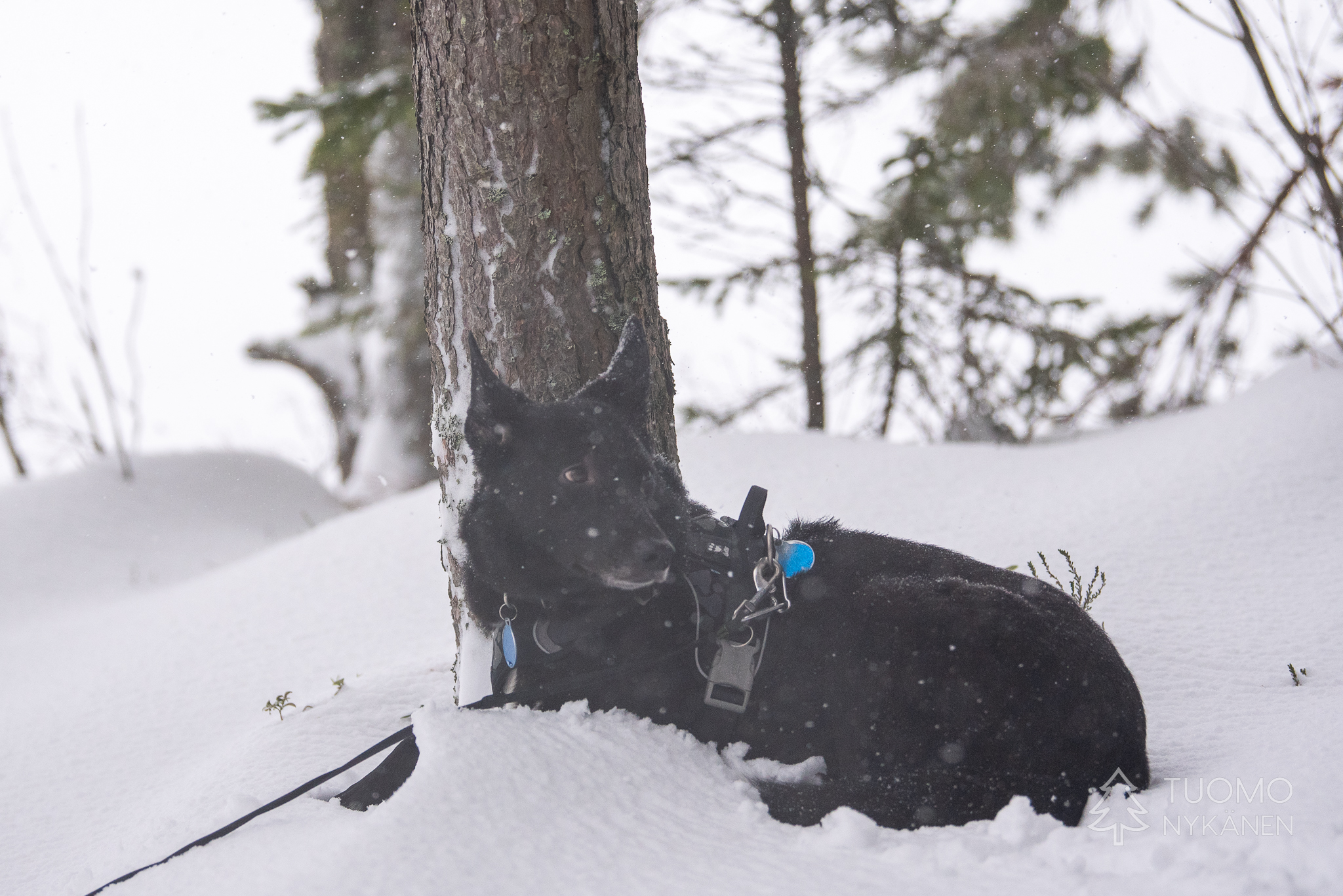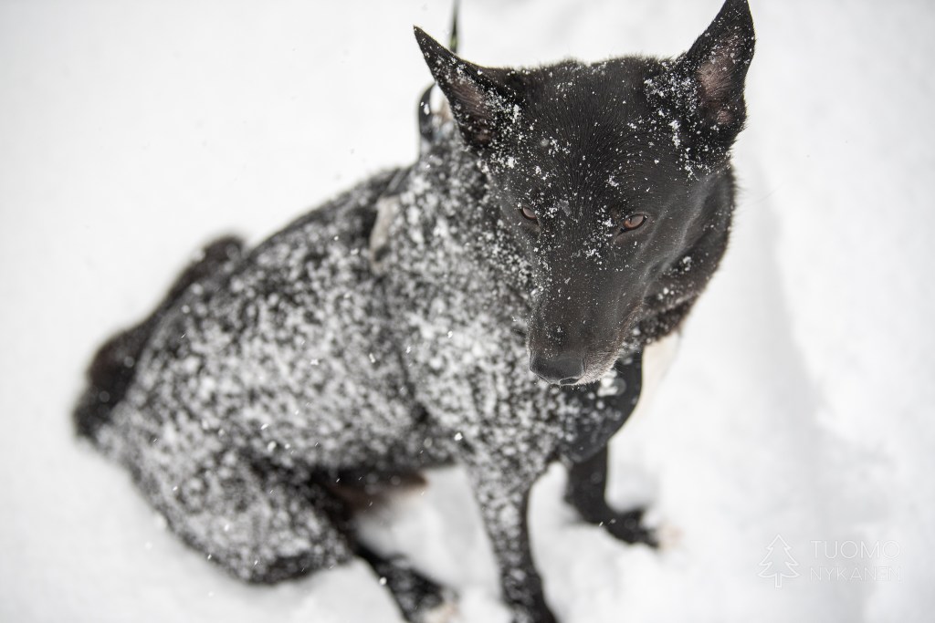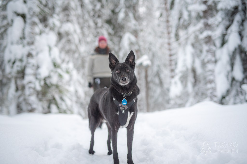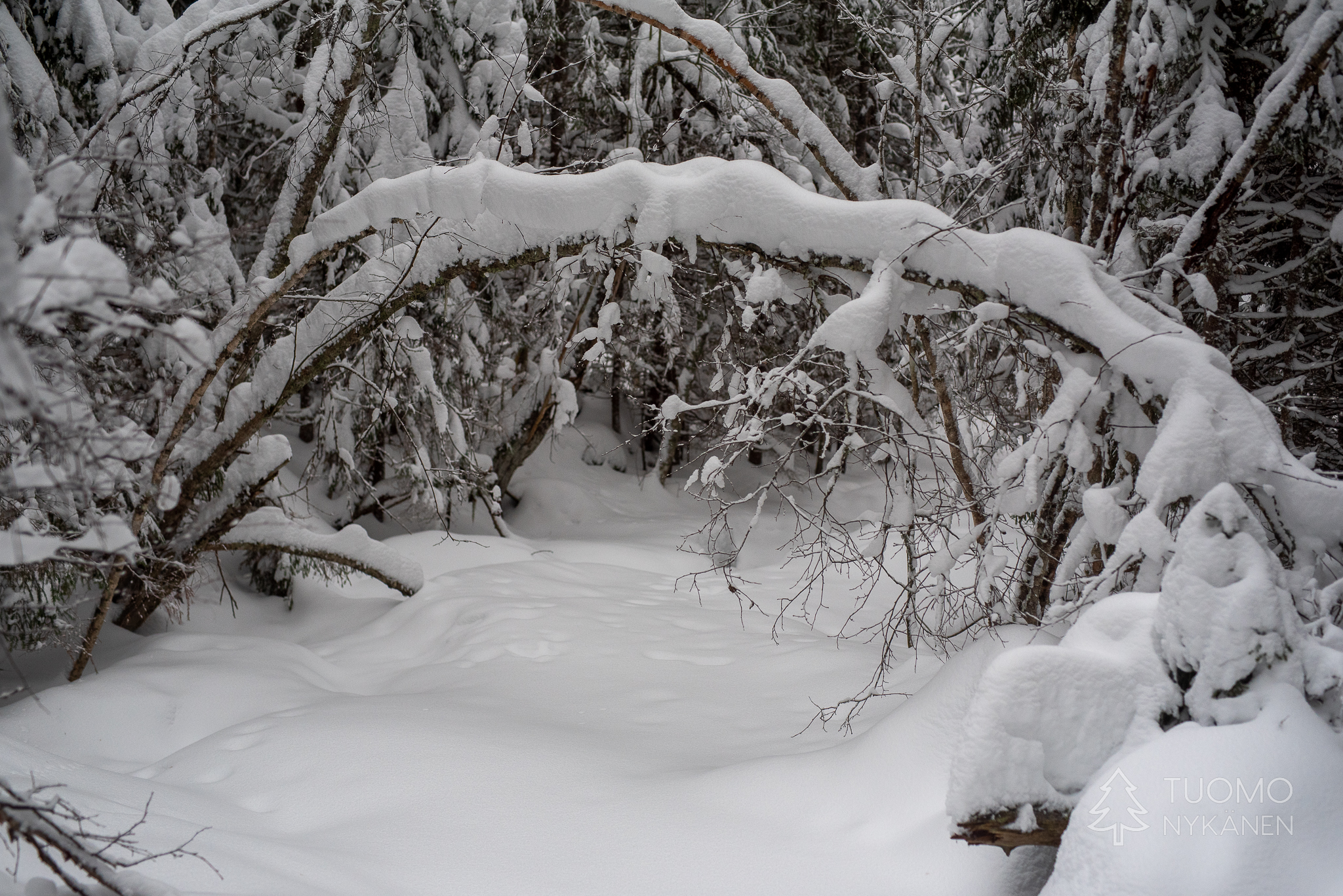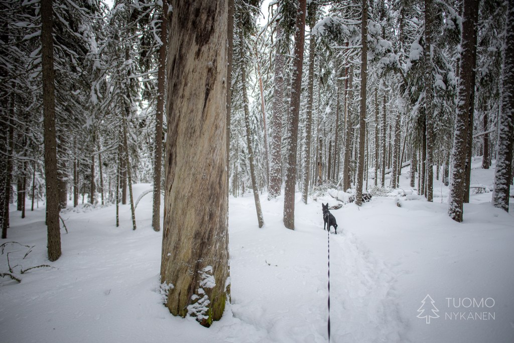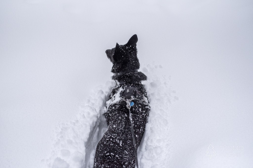 Kun oikein silmiään siristää voi metsässä nähdä jonkinlaisen notkelman joka kait kätkee sisälleen reitin kohti koskea. Kävellen tuonne ei ole asiaa joten nappaan liukulumikengät paksista ja lähden etsimään. Suksetkin uppoavat syvälle hankeen mutta Yoshi uppoaa vielä syvemmälle, silti sen täytyy päästä olemaan ensimmäinen.