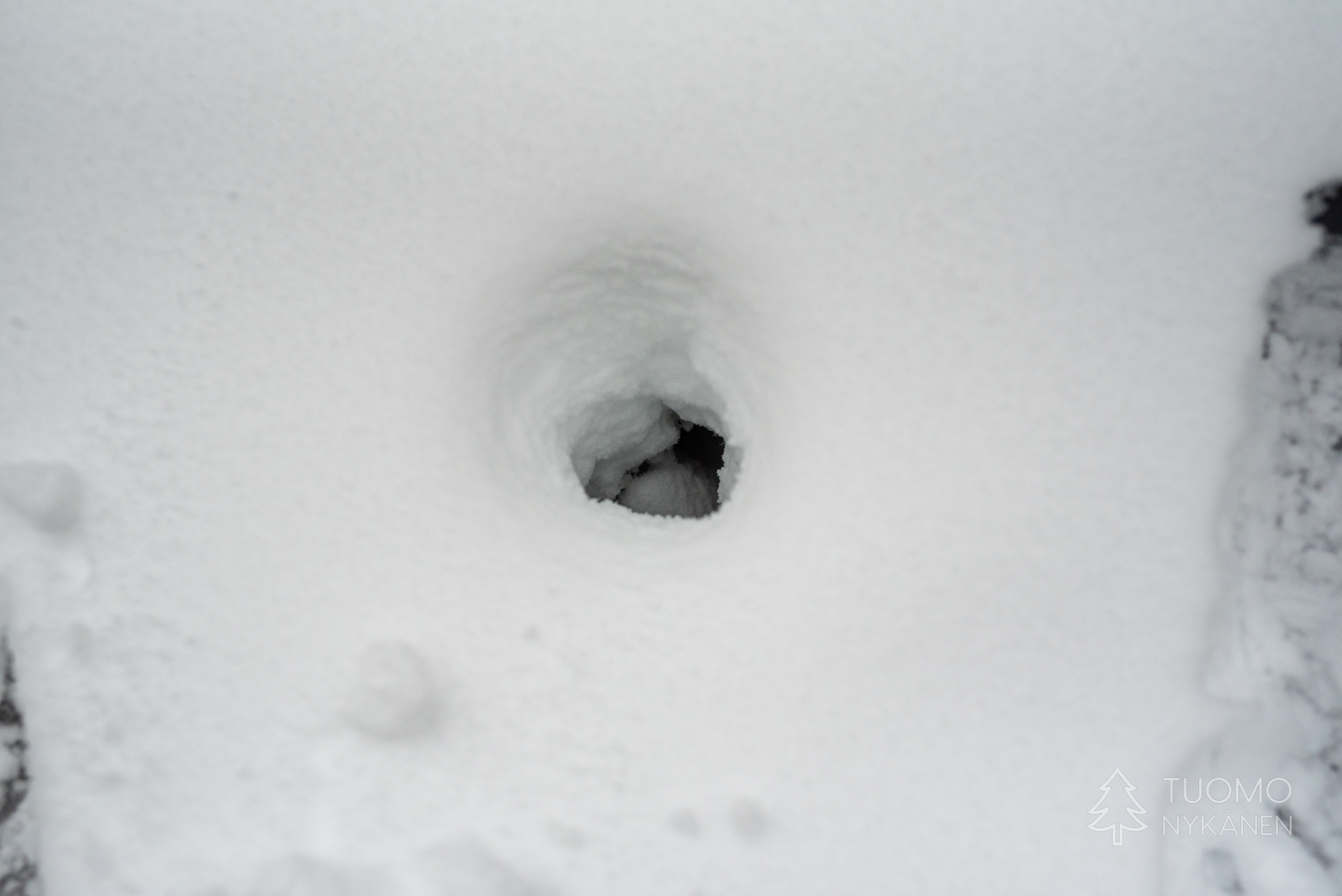 Intoa täynnä koira näyttää sukellusveneeltä jonka musta häntä heiluu ja nousee hieman hangen päälle kuin periskooppi. Ilman kännykän karttaa en pystyisi suunnistamaan yhtään, vielä vähemmän voisin perillä kuvitella olevan minkäänlaista jälkeä vedestä. Yläjuoksun puolella on helppo mennä vain suoraan leveän ja hyvin lumisen ojan ylitse joten kierrän alaspäin viettävän kivikon alapuolelle tiheiden puiden läpi. Sieltä jo löytyykin hyvin lumisia näkymiä ja näiden kinosten alla voikin kuvitella olevan jonkinlaista virtausta, kuten hetken päästä löytyvän kolon kautta on mahdollista kuullakin. Tälle kerralle ei kuitenkaan mitään sen kummempaa katseltavaa mutta laitan paikan korvan taakse odottamaan käyntiä joskus sulan maan aikaan.