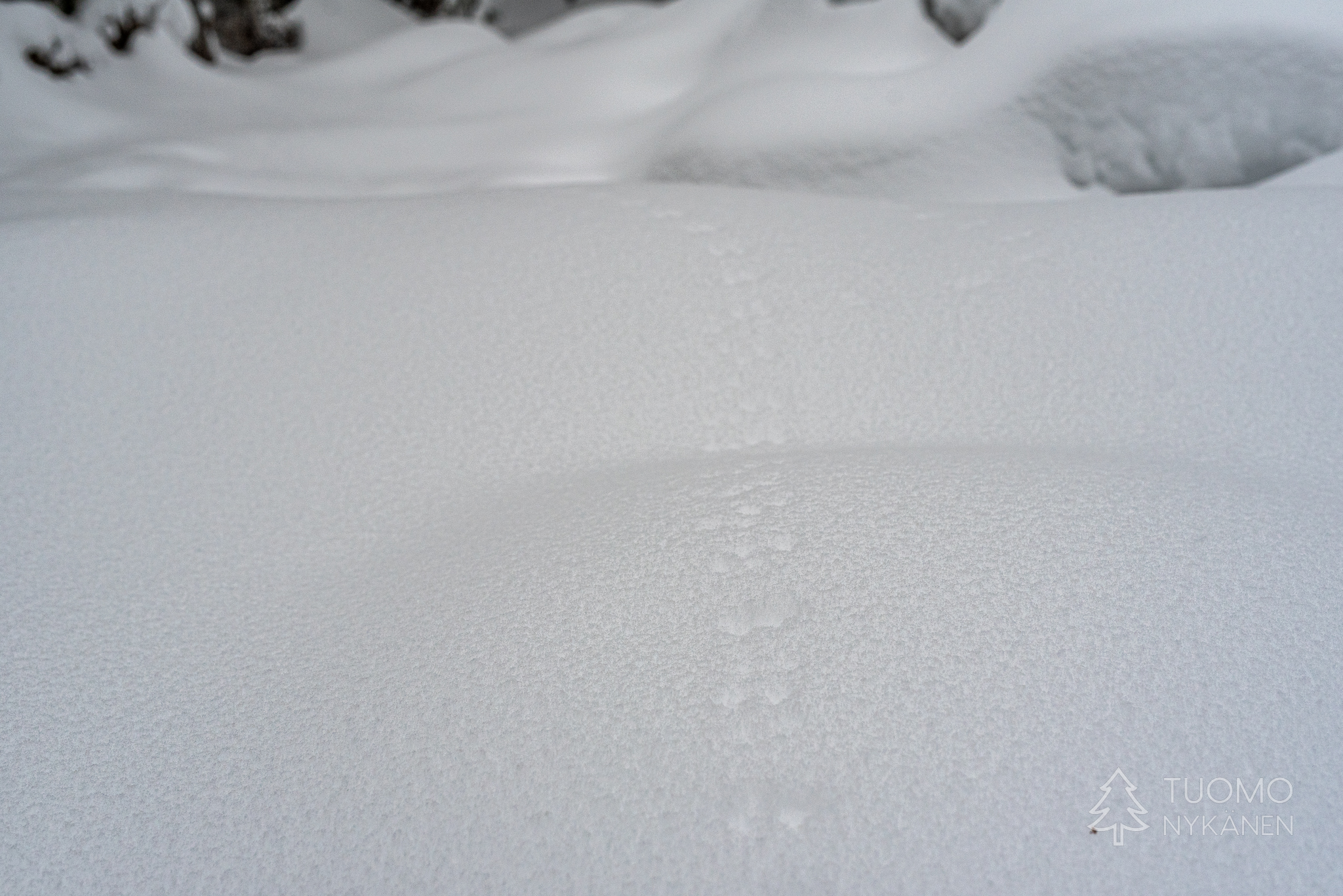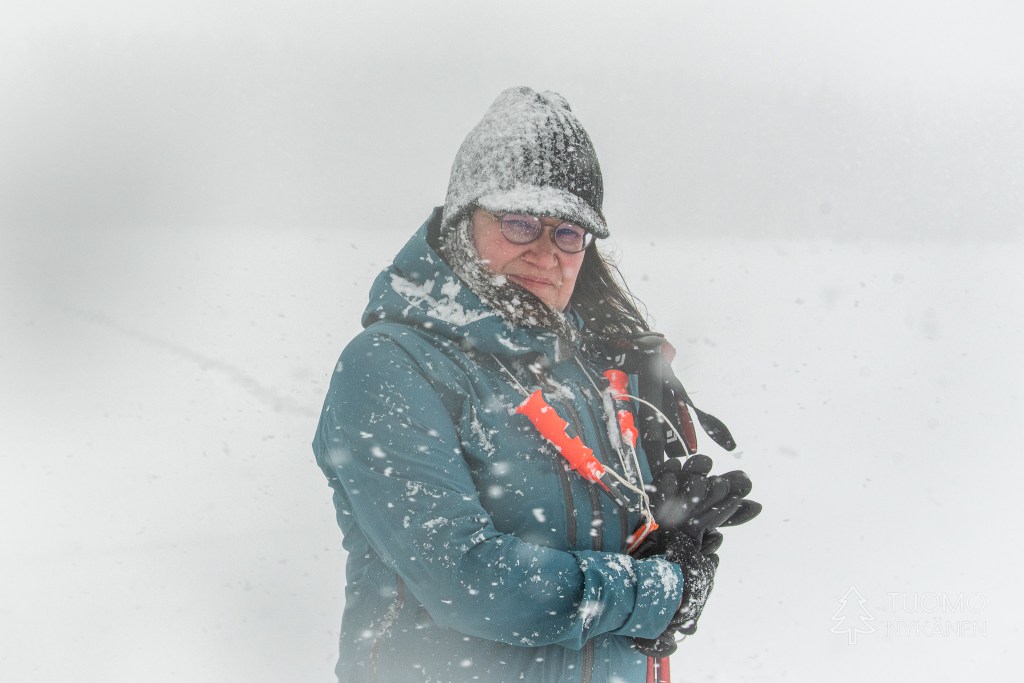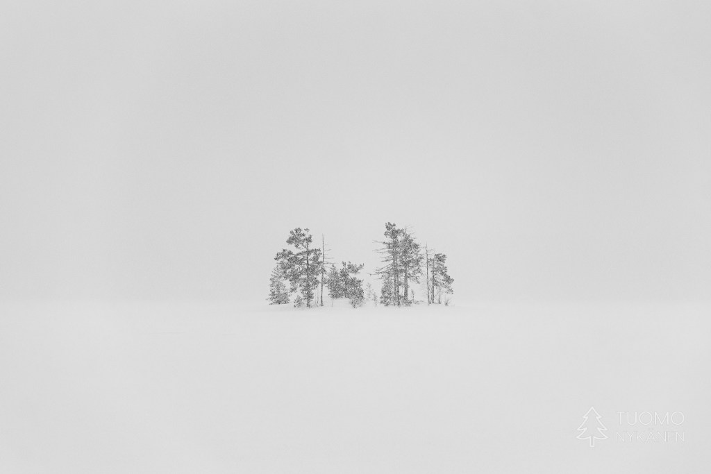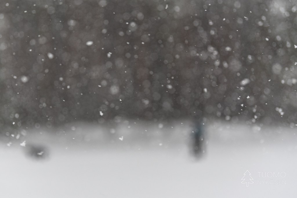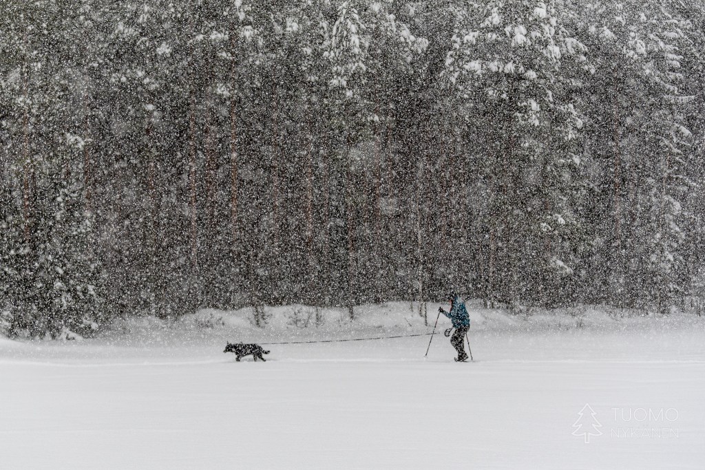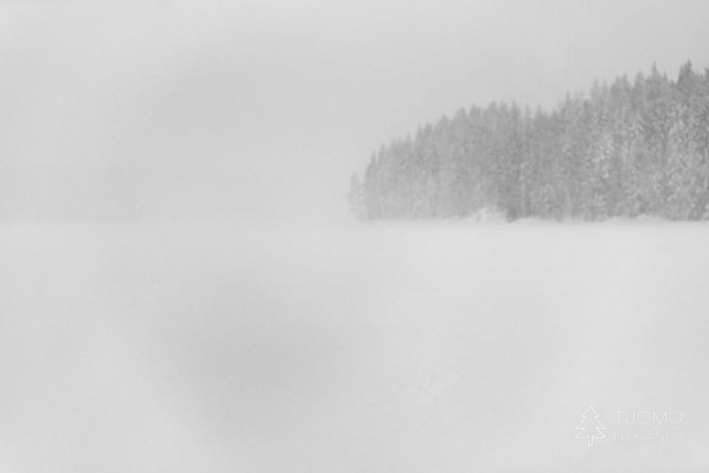 Tuuli kulkee aalloissa, välillä suuria lumisia aaltoja pyyhkii määränpääni edestä peittäen maiseman täysin valkeaksi. Viima on nostanut ilmaan kaikki hiutaleet mitkä se on saanut innostettua mukaan, niin ylhäältä pilvistä kuin alhaalta kinoksista. Yhdessä ne ovat voimakkaita ja vihaisia, pienet neulaset hakkaavat terävästi poskia ja ropisevat vaatteilla. Silti koen että tämä oikukas luonnonvoima on ystäväni, se vain tekee työtään tuoden hidasta muutosta kevättä kohti. Yhdessä piirrämme väliaikaisia kuvioitamme lumeen, se etelästä ponnistaen ja minä taas etelää kohti kulkien.