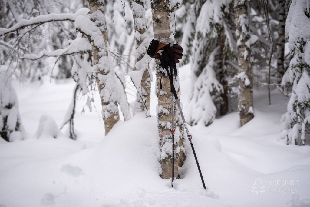 Tamppaan ympäristöä suksilla ennenkuin otan ne pois jalasta ja laitan vieressä olevaa vajaa vasten.